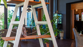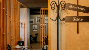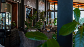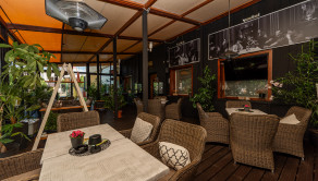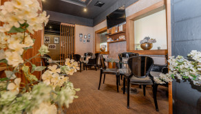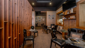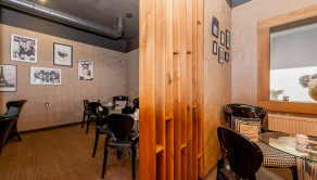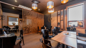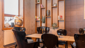 Interiér prevádzky pôsobí moderne a útulne, s dôrazom na funkčnosť a estetiku. Teplé tóny dreva v kombinácii s dreveným obkladom a štýlovými stolmi vytvárajú harmonickú atmosféru, v ktorej sa hostia cítia príjemne a vítane. Vkusne zladené farby dotvárajú celkový vizuálny dojem a podporujú komfortné posedenie.