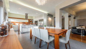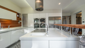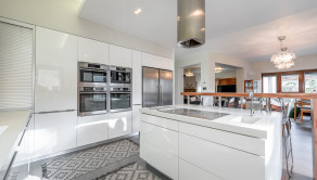 Kuchynská linka je vyrobená na mieru z kvalitných materiálov so zabudovanými spotrebičmi svetových značiek AEG (indukčná sklokeramická varná doska, dizajnový odsávač pár, elektrická rúra, parná rúra, mikrovlnná rúra, kávovar, umývačka riadu, americká chladnička s mrazničkou značky Liebherr).