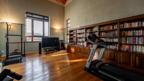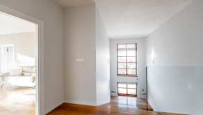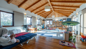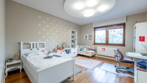 Na poschodí domu sa nachádza spálňa s kúpeľňou a šatníkom, 2 x detská izba, samostatná kúpeľňa s toaletou pre deti, šatník, herňa s východom na balkón, knižnica s krbom.