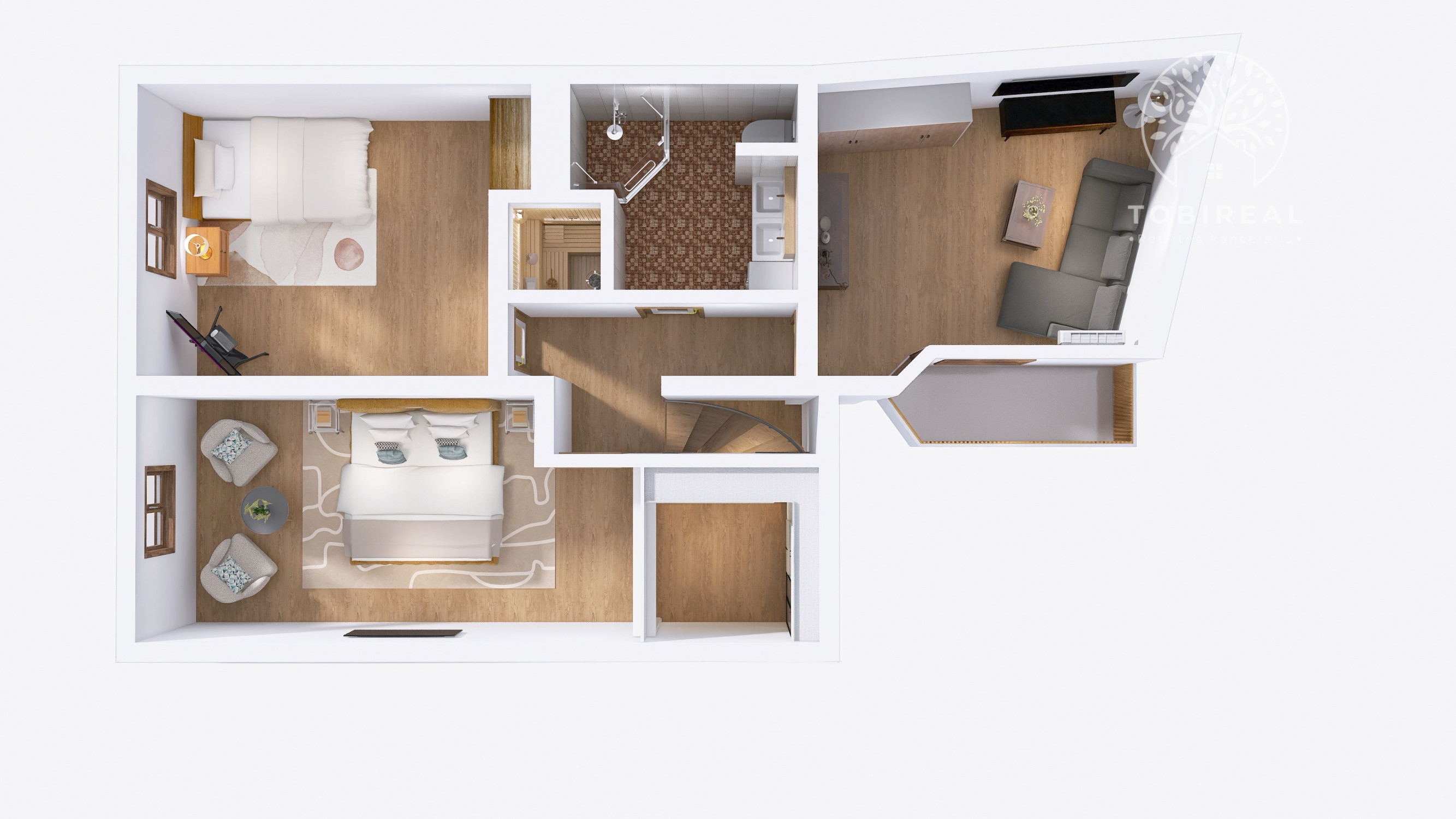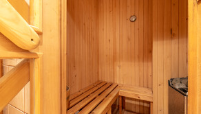 Poschodie ponúka oddychovú zónu, kde je kúpeľňa s toaletou a exkluzívnou fínskou saunou, ktorá poskytne dokonalý relax po náročnom dni.