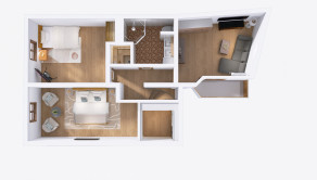 Byt je rozložený na dvoch poschodiach s vysokými stropmi (3,6 m), ktoré umocňujú pocit vzdušnosti a slobody a jeho rozloha poskytuje dostatok priestoru pre komfortné bývanie aj pre viacgeneračnú rodinu, alebo pre tých, ktorí vyžadujú oddelené zóny na prácu, relax i zábavu.