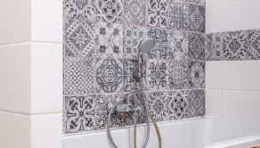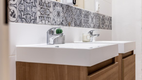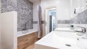 Kúpeľňa je vkusne zrekonštruovaná s dôrazom na zachovanie historického charakteru bytu – obklady a celkové vyhotovenie citlivo ladia s atmosférou 30. rokov, no zároveň spĺňajú moderné nároky na komfort.