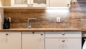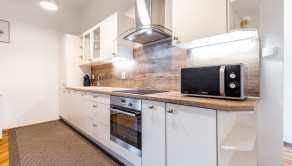 Moderná kuchynská linka je vybavená spotrebičmi - chladnička s mrazničkou, sklokeramická varná doska, elektrická rúra, digestor a umývačka riadu. Súčasťou kuchyne je špajza.