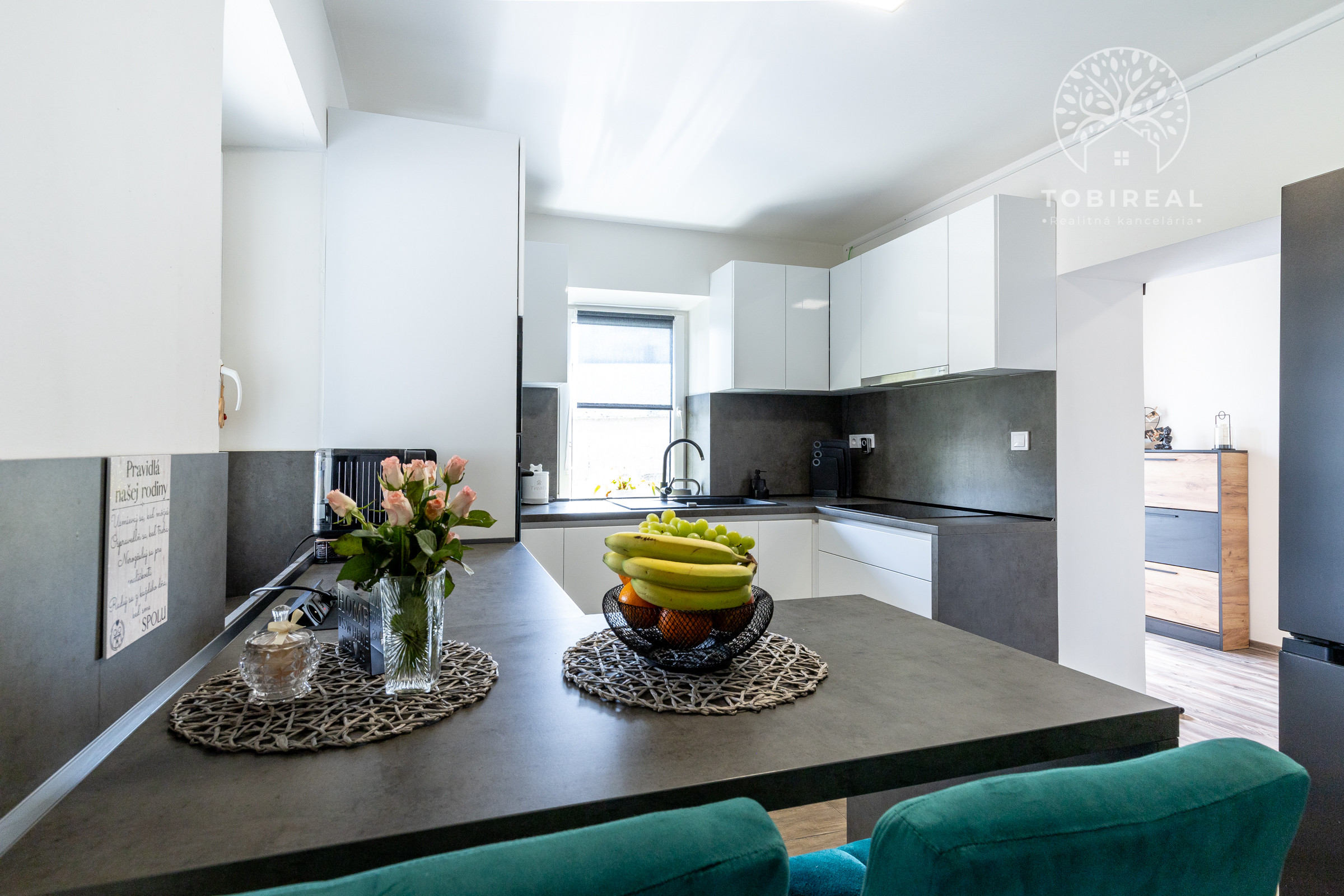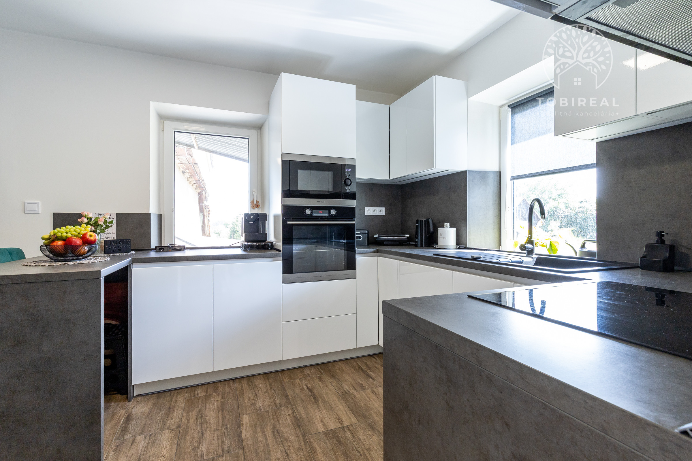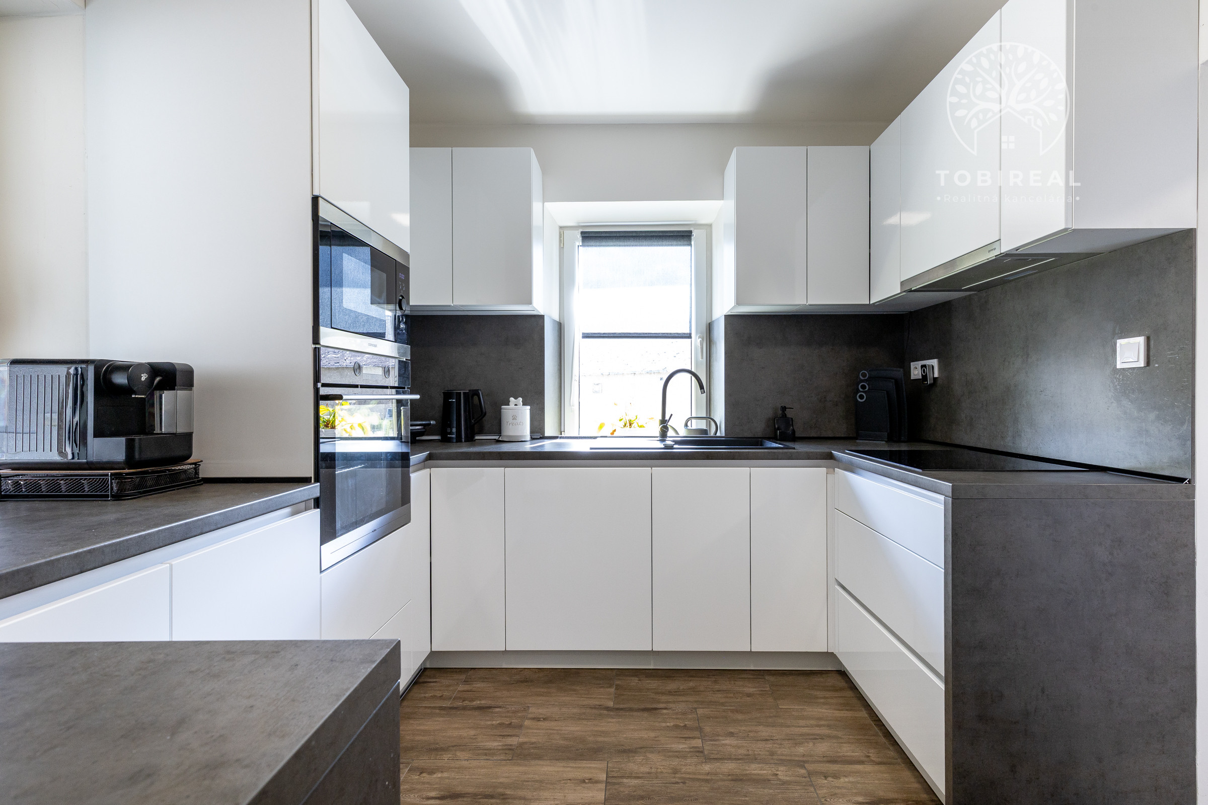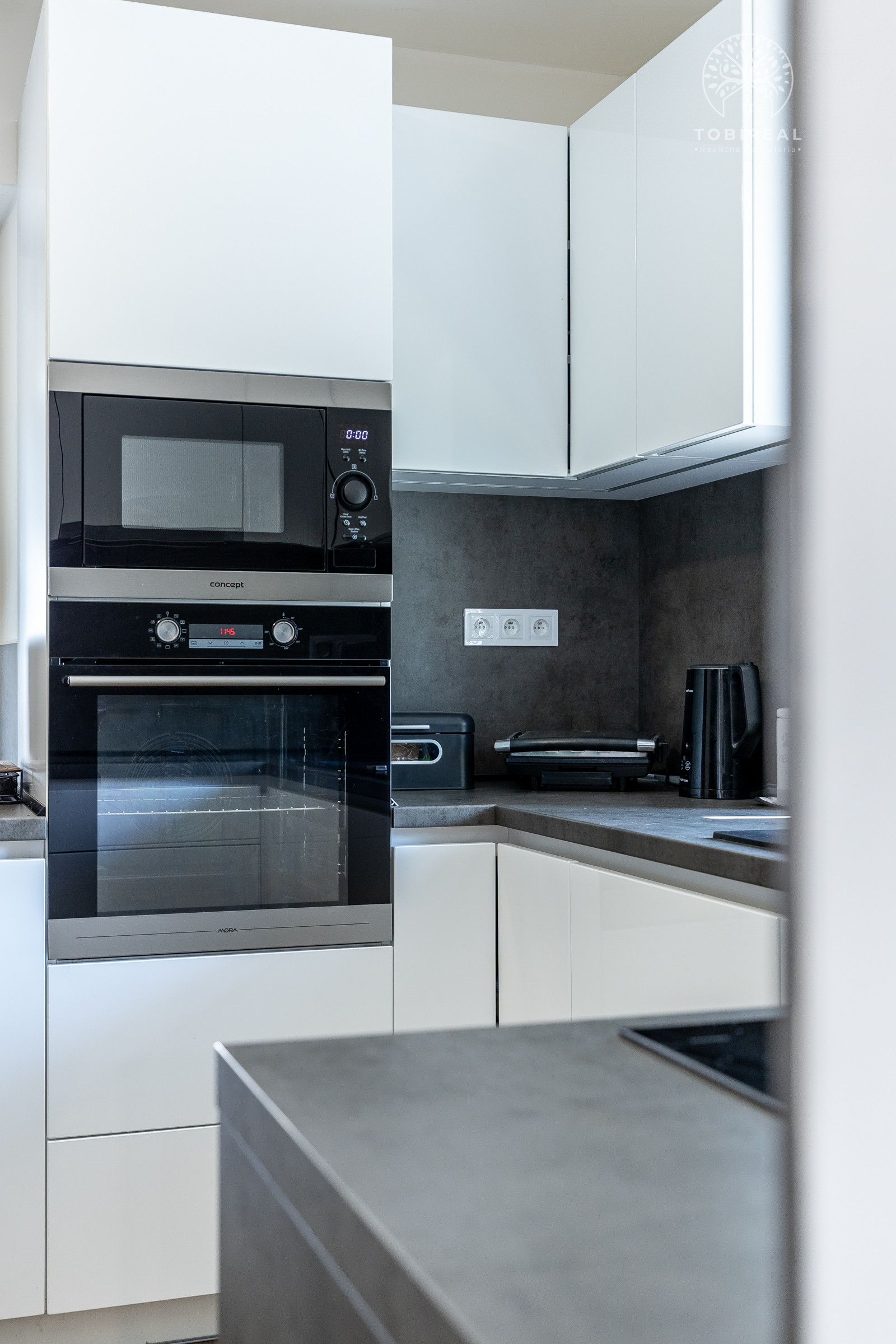 Kuchyňa je plne vybavená modernými spotrebičmi – k dispozícii je umývačka riadu, chladnička, mraznička, indukčná varná doska, elektrická rúra, digestor, mikrovlnná rúra.