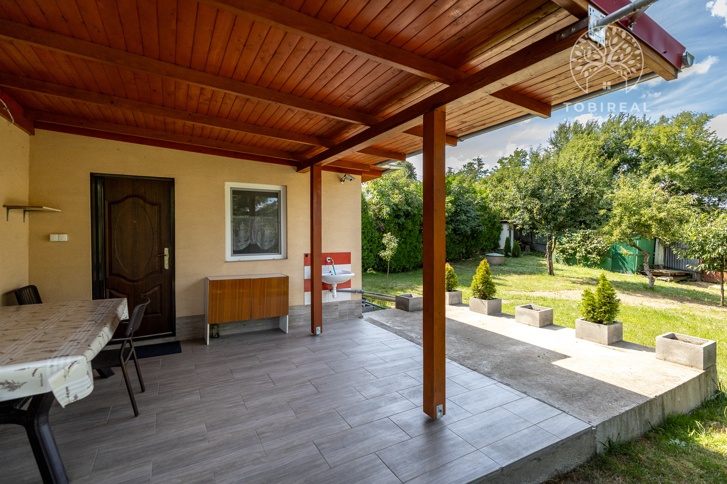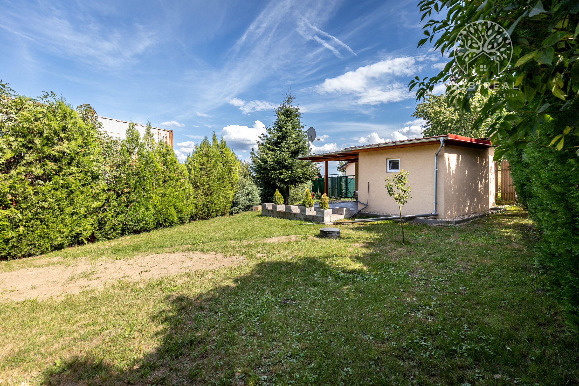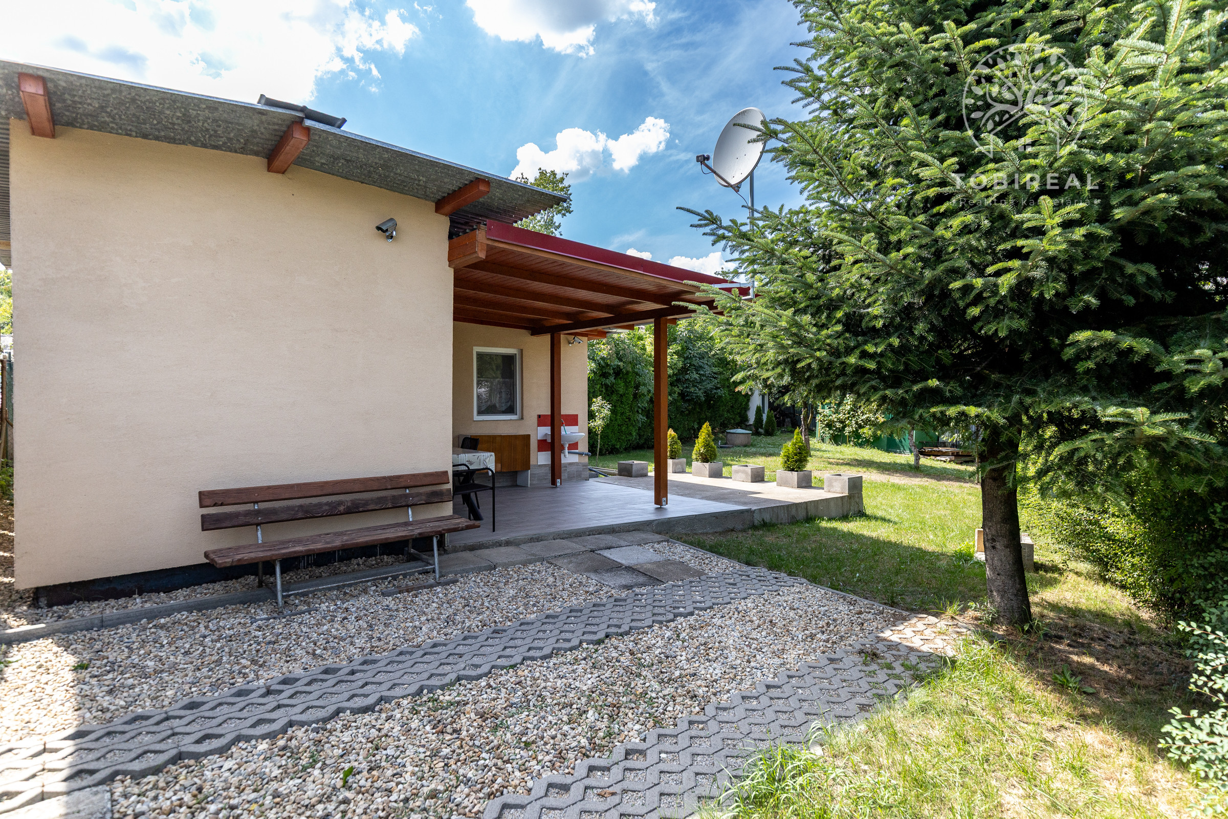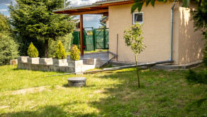 Tento kontajnerový dom s murovanou prístavbou (Porfix) sa nachádza na rovinatom pozemku s výmerou 379 m², úžitková plocha je 30 m² a dispozične pozostáva zo spálne, kuchyne a kúpeľne. Súčasťou nehnuteľnosti je aj priestranná terasa s výmerou 16 m². Pozemok je obklopený okrasnými stromčekmi a množstvom zelene, vďaka čomu pôsobí veľmi príjemne a ponúka dokonalé súkromie a relax v tichom prostredí. Celý areál vrátane chaty je kompletne oplotený.