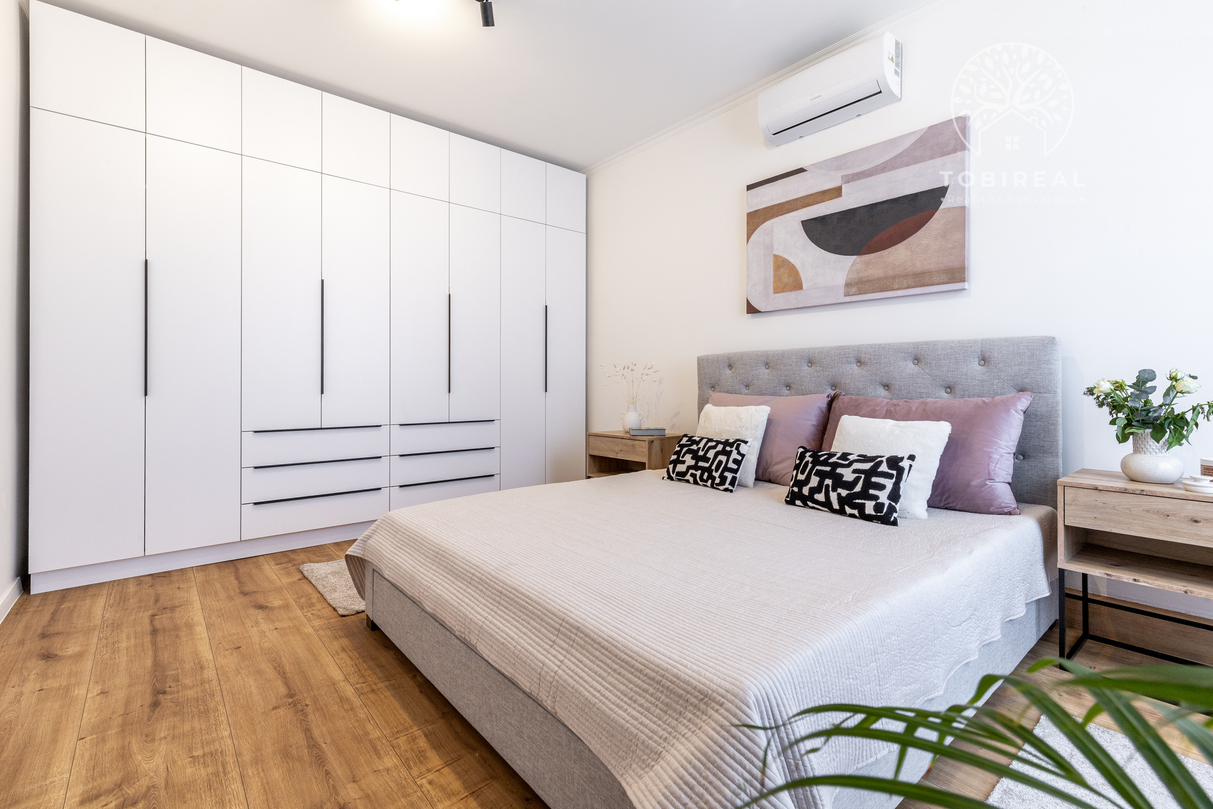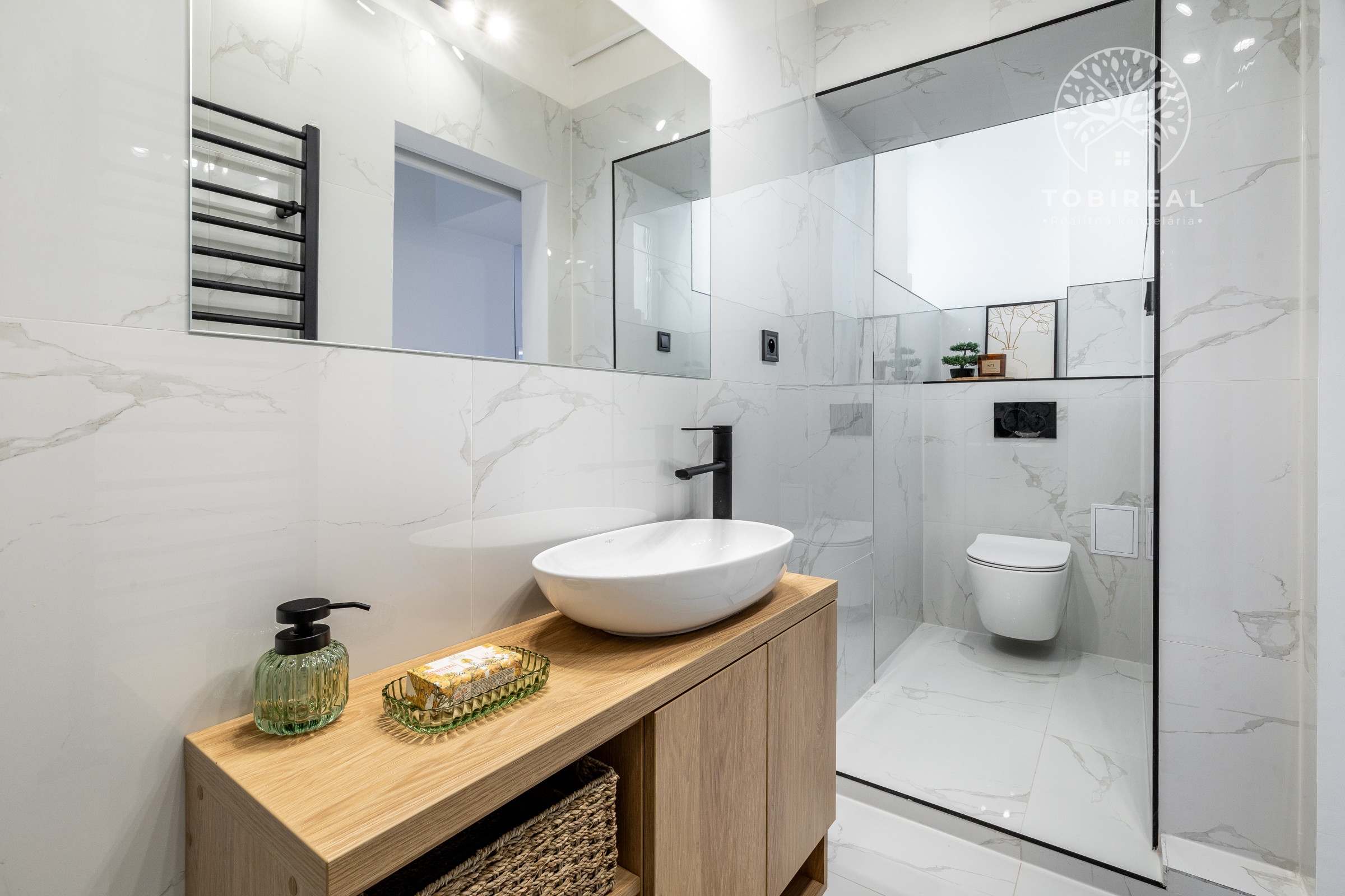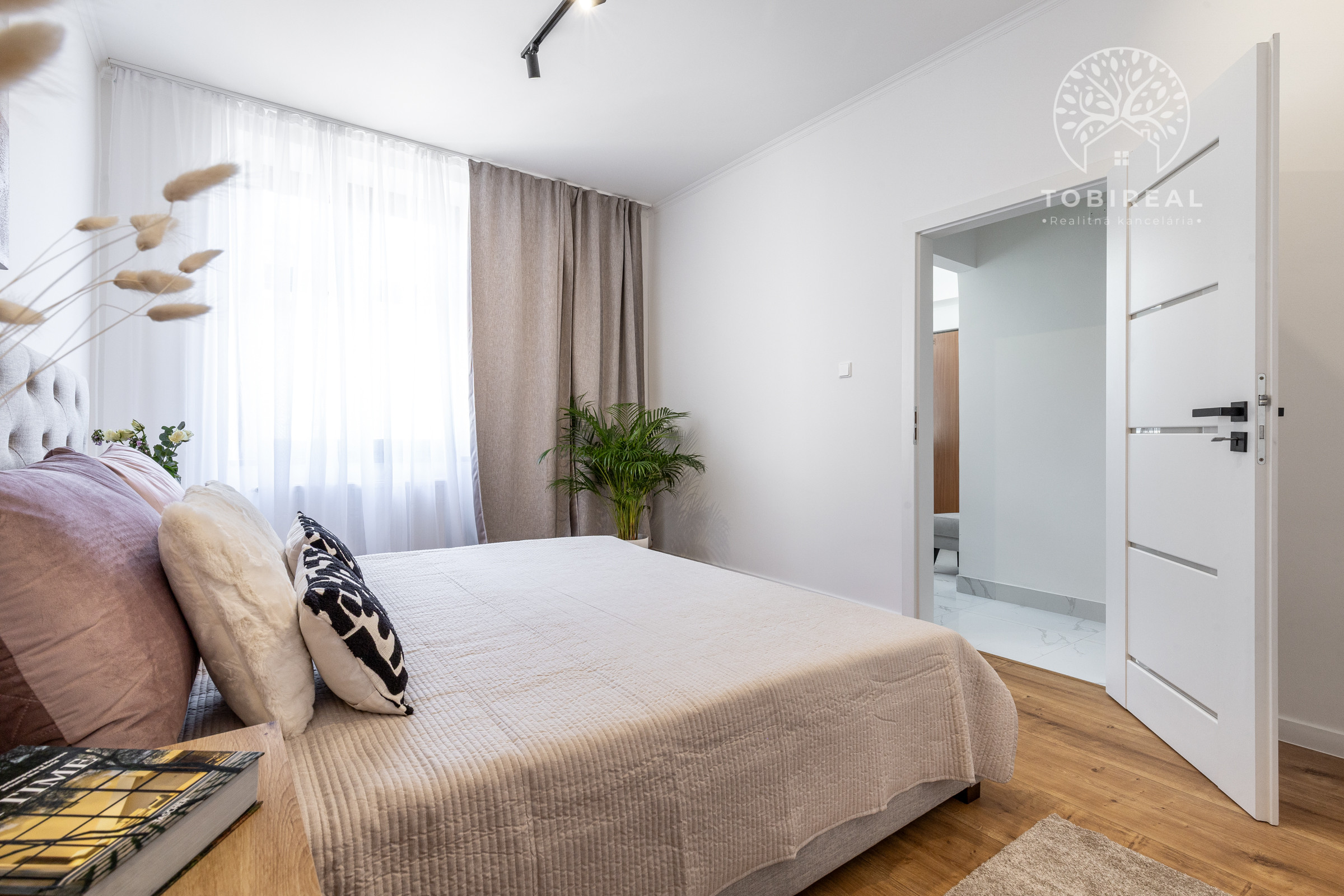 Komfort bývania dopĺňa priestranná kúpeľňa so sprchovým kútom. Teplo domova dotvára úplne nová podlaha, ktorá harmonicky ladí s interiérom navrhnutým a vyhotoveným kompletne na mieru.
