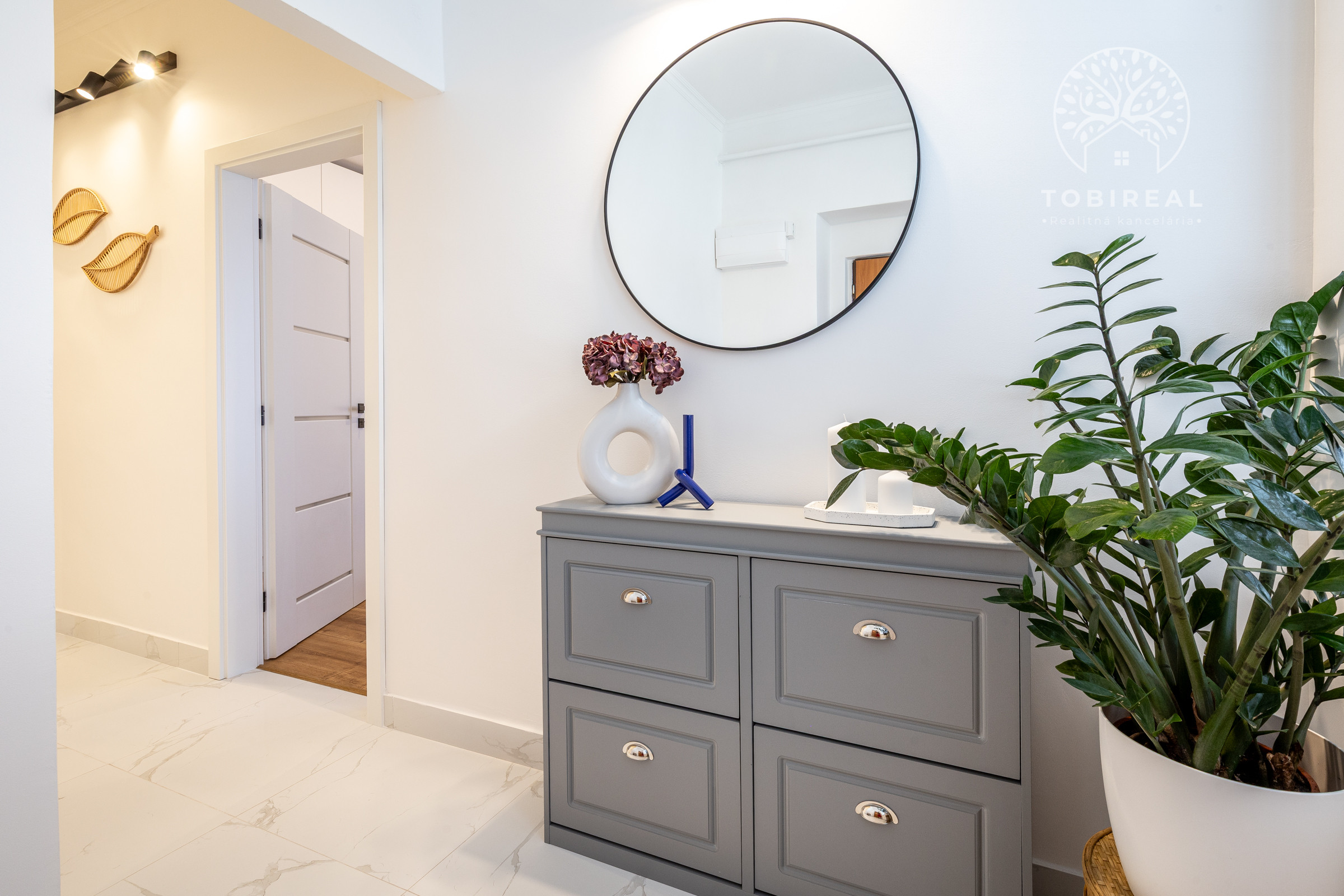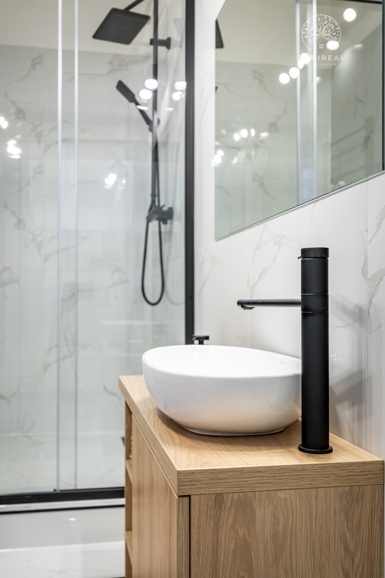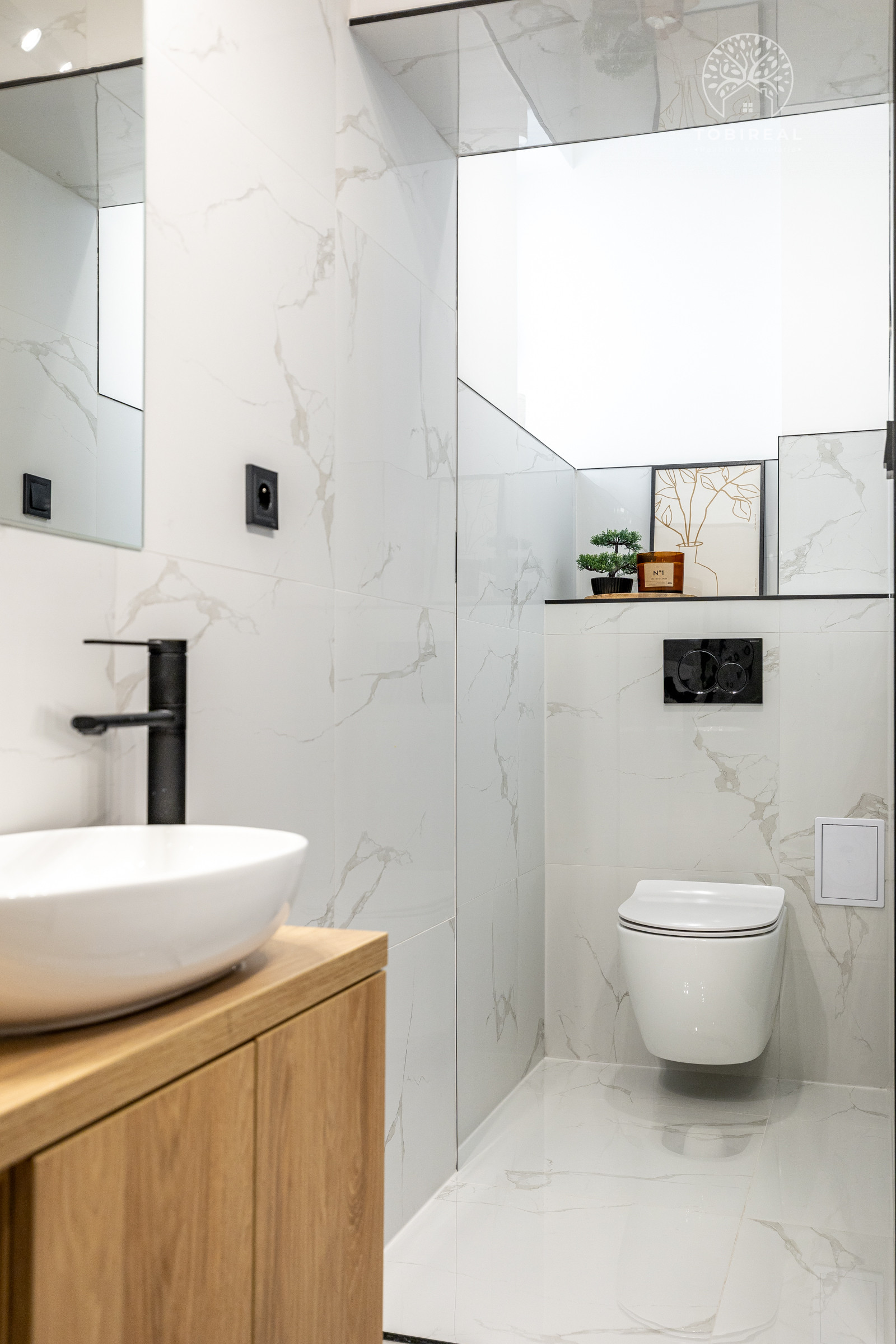 Komfort bývania dopĺňa priestranná kúpeľňa so sprchovým kútom. Teplo domova dotvára úplne nová podlaha, ktorá harmonicky ladí s interiérom navrhnutým a vyhotoveným kompletne na mieru.