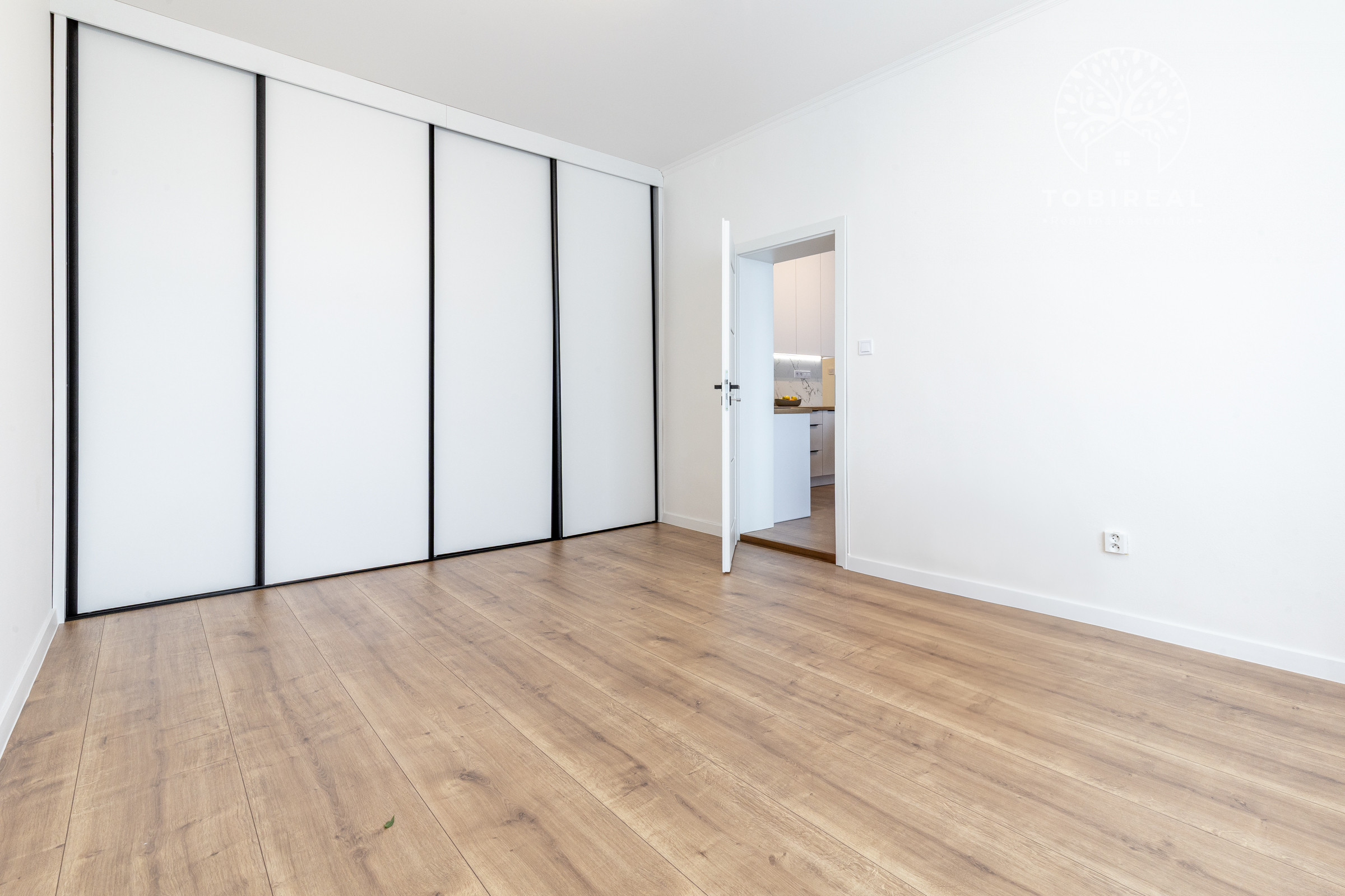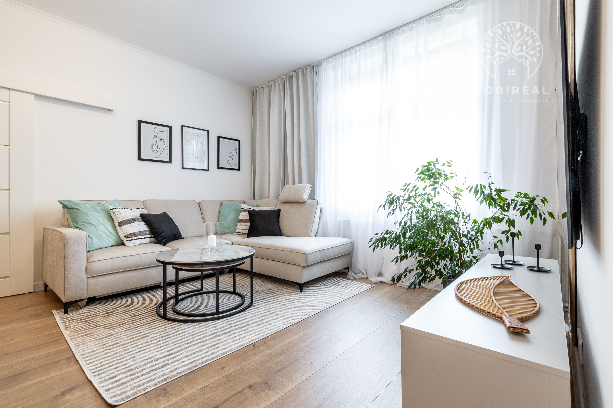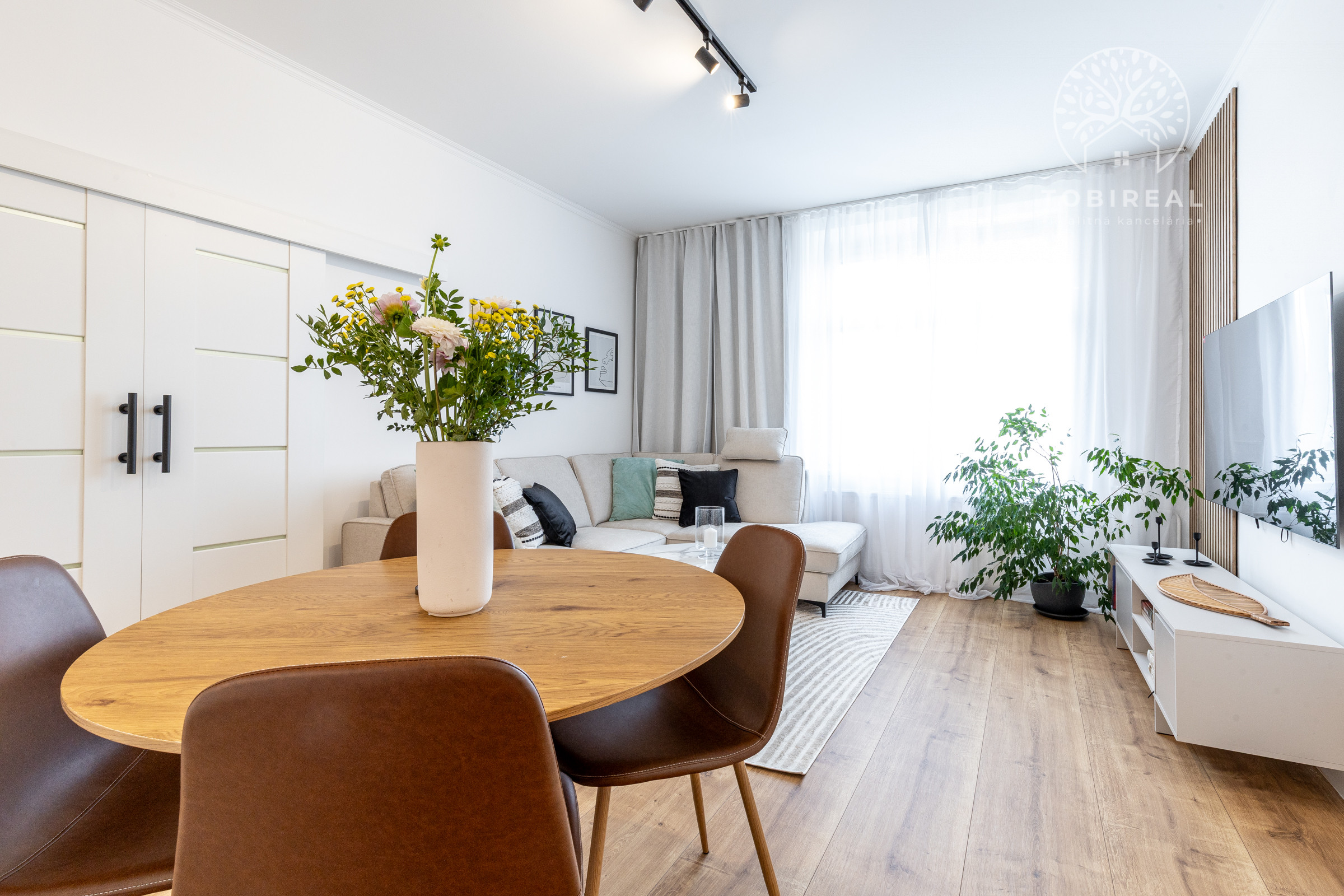 Dispozične byt pozostáva z otvorenej spoločenskej zóny prepojenej s plne zariadenou kuchyňou vybavenou kvalitnými spotrebičmi. Priestor pôsobí vzdušne a svetlo, čo umocňuje južná a severná orientácia a nadštandardná výška stropov. Dostatok úložného priestoru zabezpečia vstavané skrine v oboch izbách.