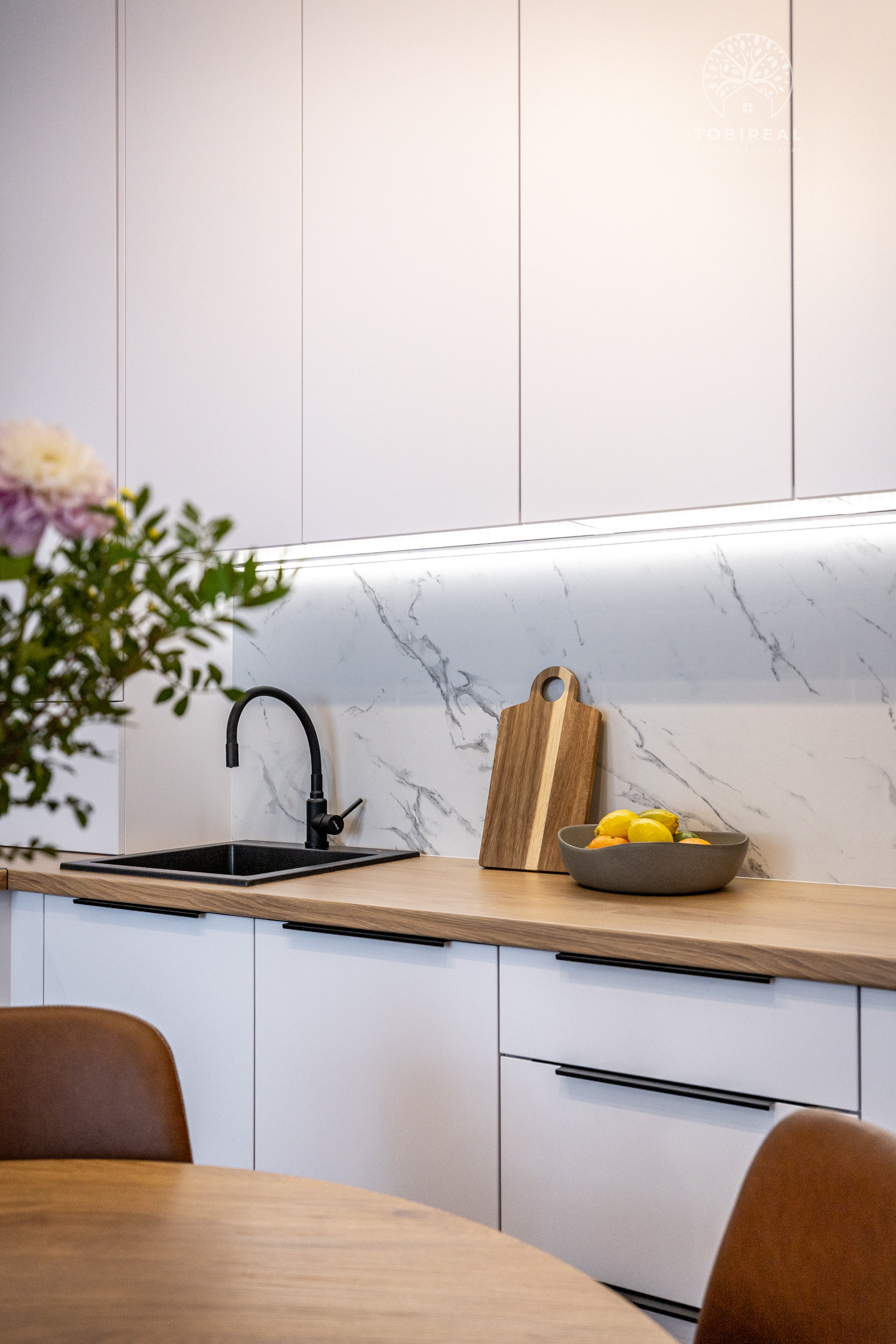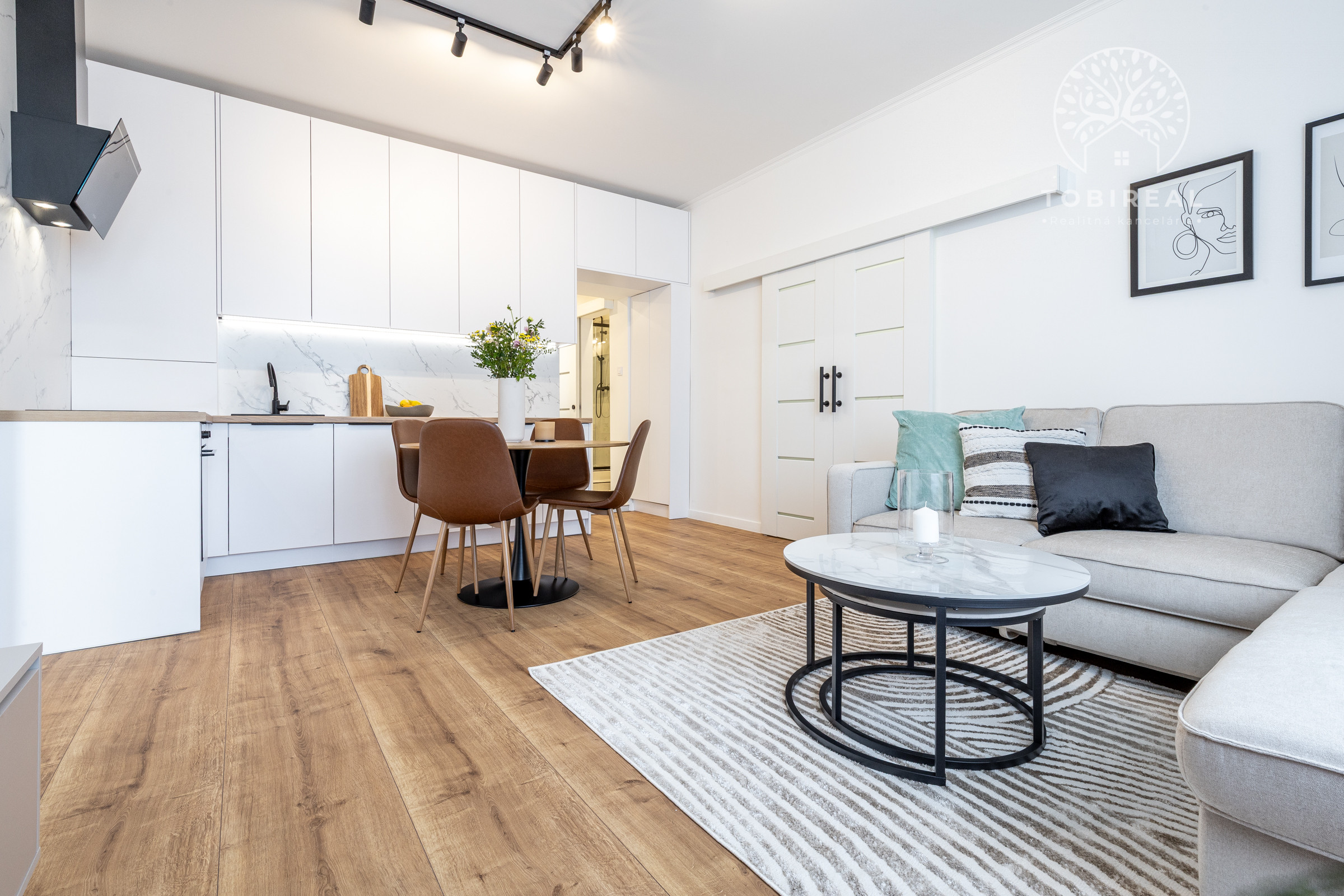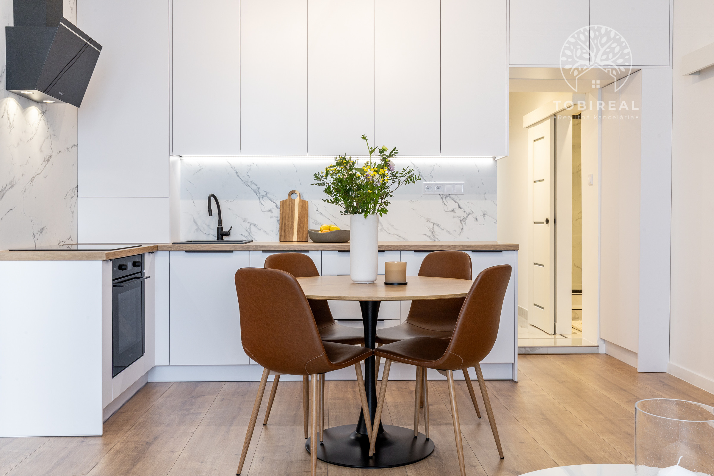 Dispozične byt pozostáva z otvorenej spoločenskej zóny prepojenej s plne zariadenou kuchyňou vybavenou kvalitnými spotrebičmi. Priestor pôsobí vzdušne a svetlo, čo umocňuje južná a severná orientácia a nadštandardná výška stropov. Dostatok úložného priestoru zabezpečia vstavané skrine v oboch izbách.