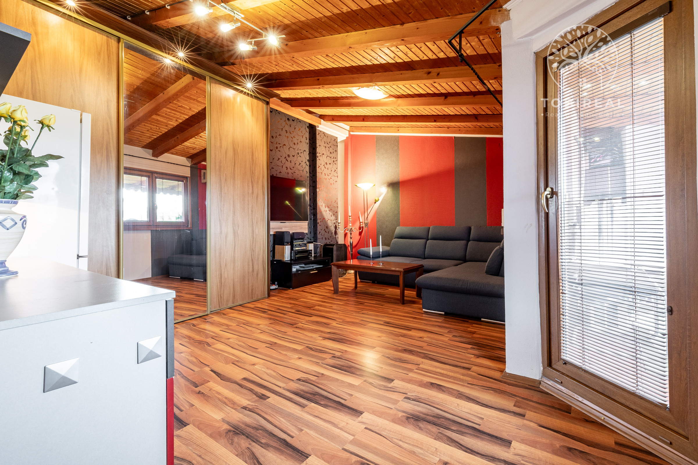 Byt je možné využiť aj na viacgeneračné bývanie alebo podnikanie pod jednou strechou, keďže na druhom poschodí je kompletná predpríprava na samostatnú kuchyňu vrátane všetkých rozvodov. Aktuálne je tento priestor využívaný ako obývacia izba s výstupom na veľký balkón.