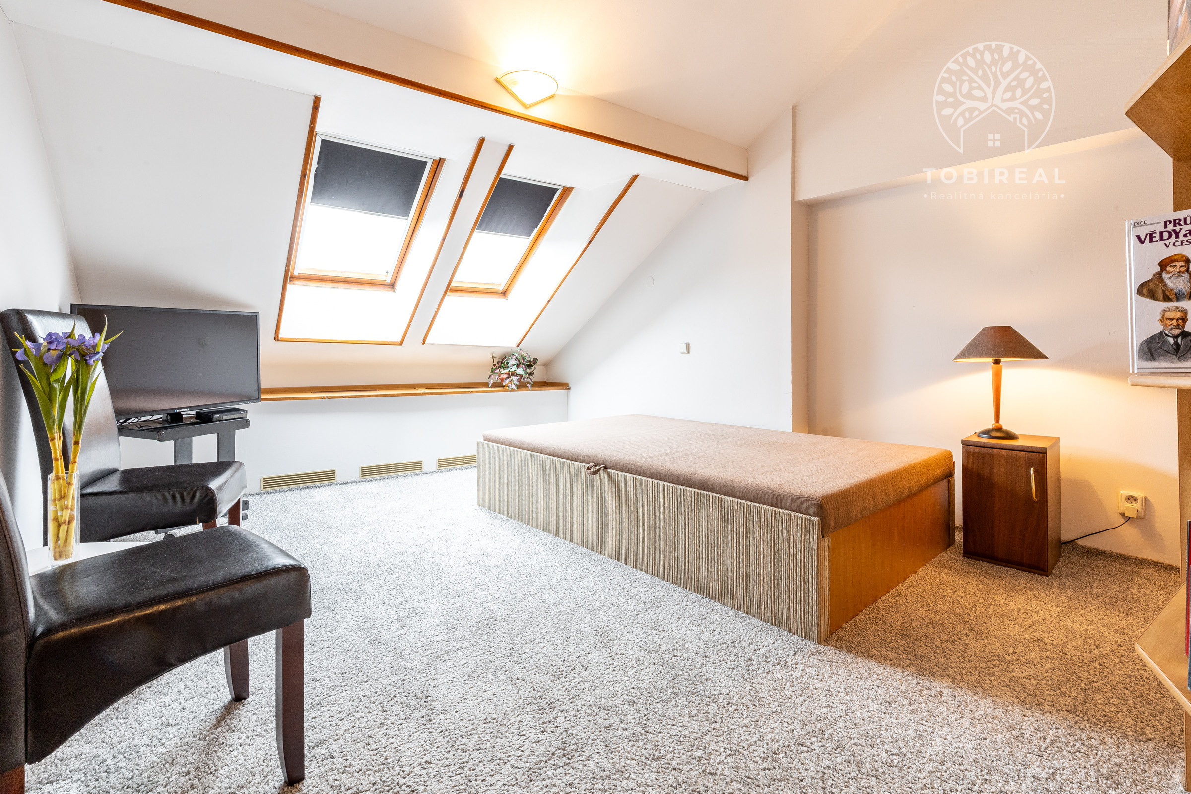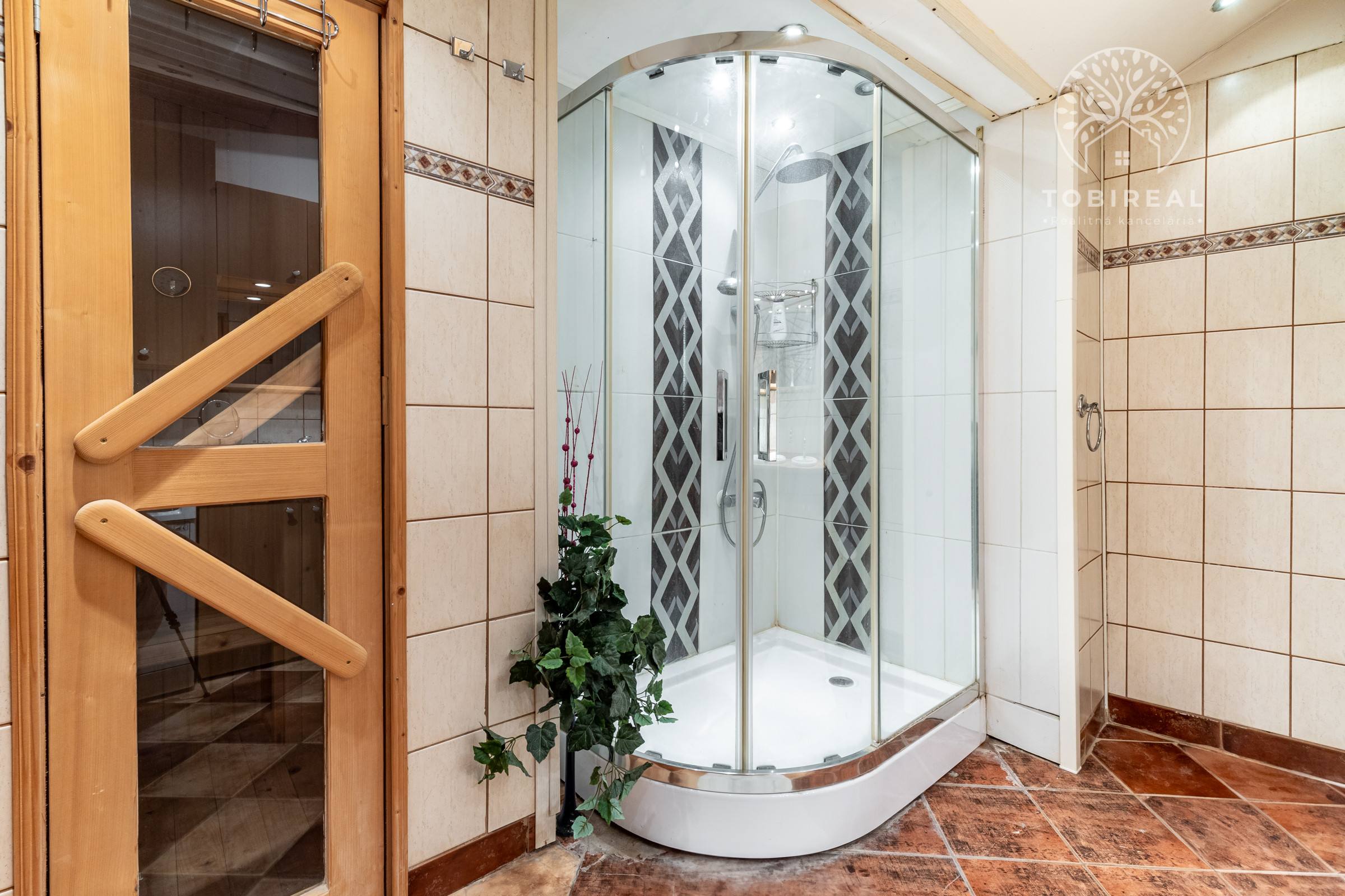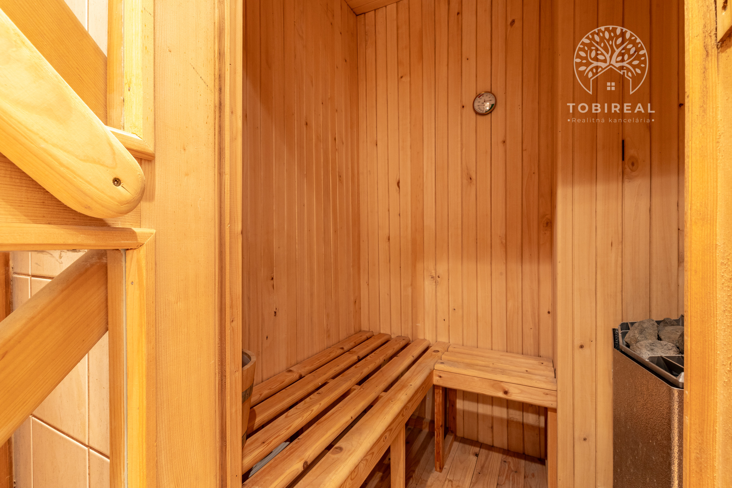 Poschodie ponúka oddychovú zónu, kde je kúpeľňa s toaletou a exkluzívnou fínskou saunou, ktorá poskytne dokonalý relax po náročnom dni.