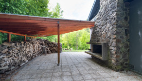 Vonkajšia časť ponúka veľkú čiastočne krytú terasu, spevnené plochy a prístrešok s veľkým exteriérovým krbom – ohniskom, ideálnym na spoločné chvíle s rodinou a priateľmi. K dispozícii je aj spevnené parkovisko pre viacero áut.