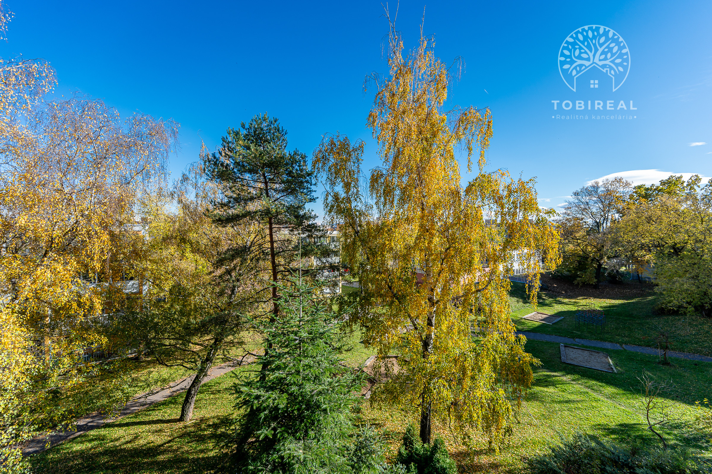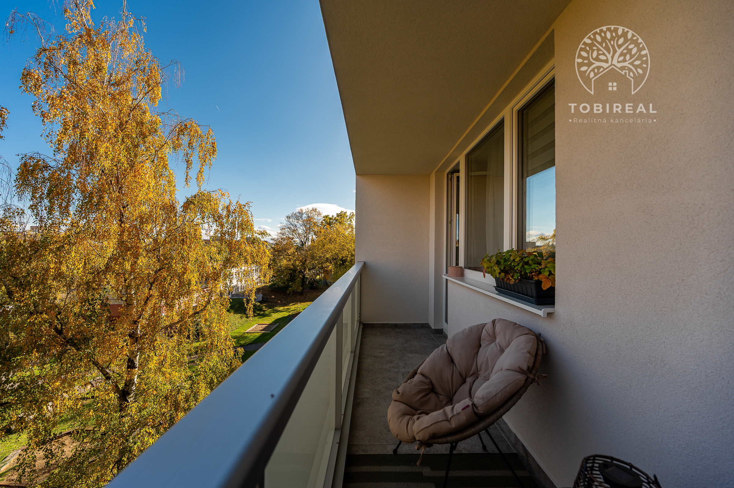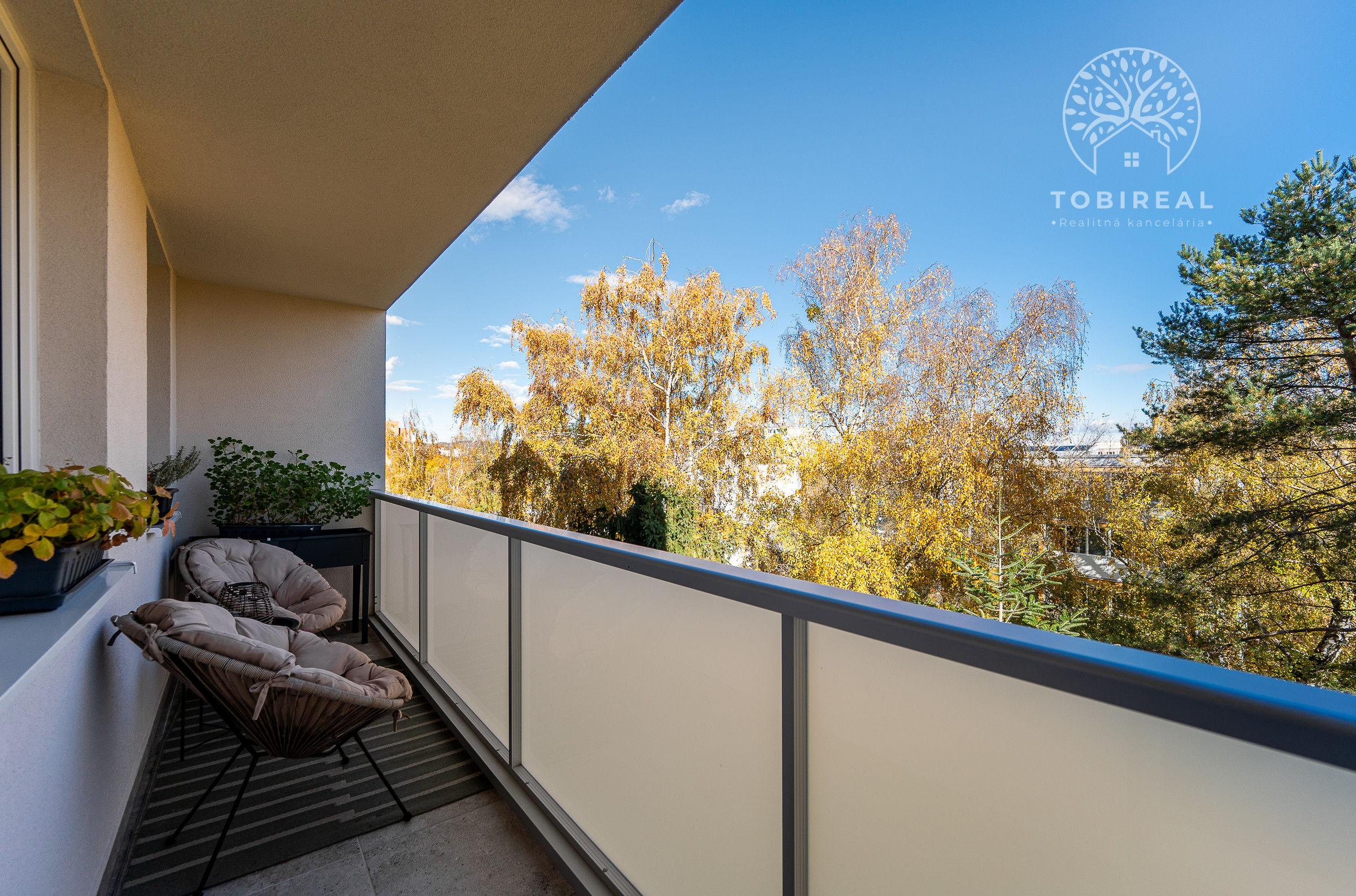 Byt disponuje loggiou s príjemným výhľadom na okolitú zeleň, ktorá ponúka ideálne miesto na oddych či rannú kávu.