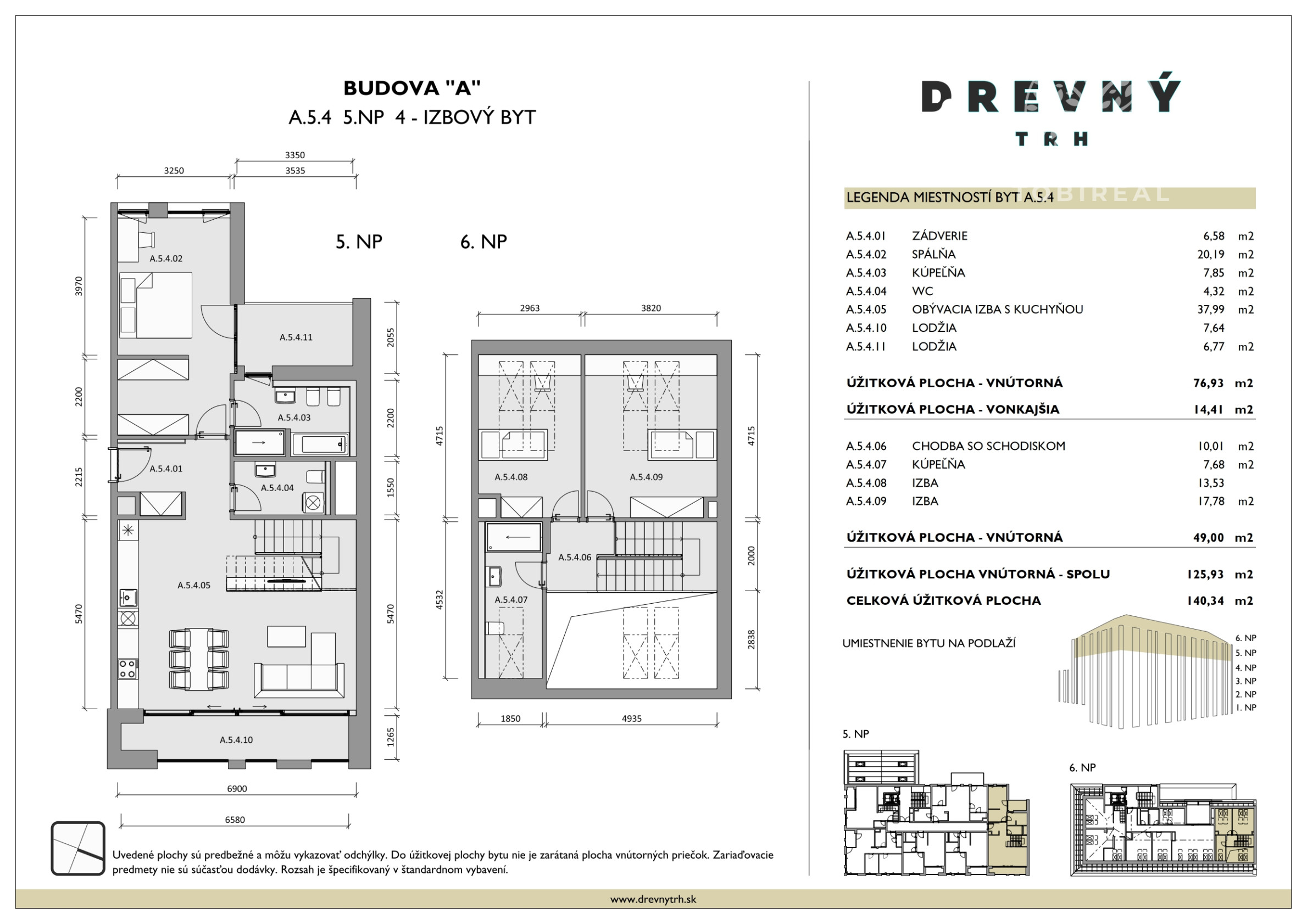 Na predaj je mezonet s rozlohou 125 m² a dvoma loggiami s celkovou rozlohou viac ako 14 m², nachádzajúci sa na 5. a 6. poschodí, s orientáciou na východ a západ. Byt pozostáva z presvetlenej dennej časti, ktorú tvorí prepojená kuchyňa s obývačkou a s výstupom na priestrannú loggiu, spálne s výstupom na loggiu, izby, kúpeľne, samostatnej toalety, vstupnej chodby a šatníkom.