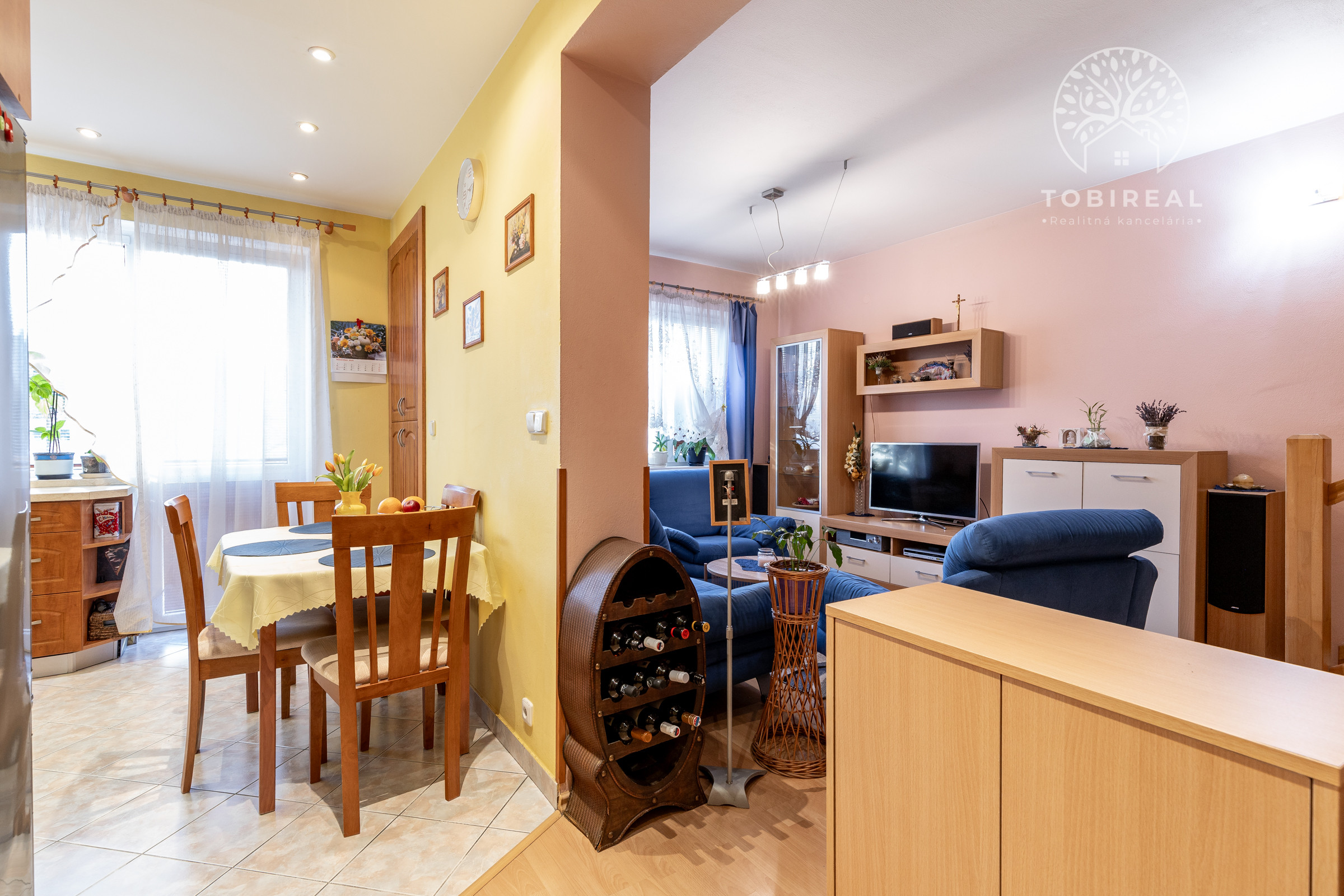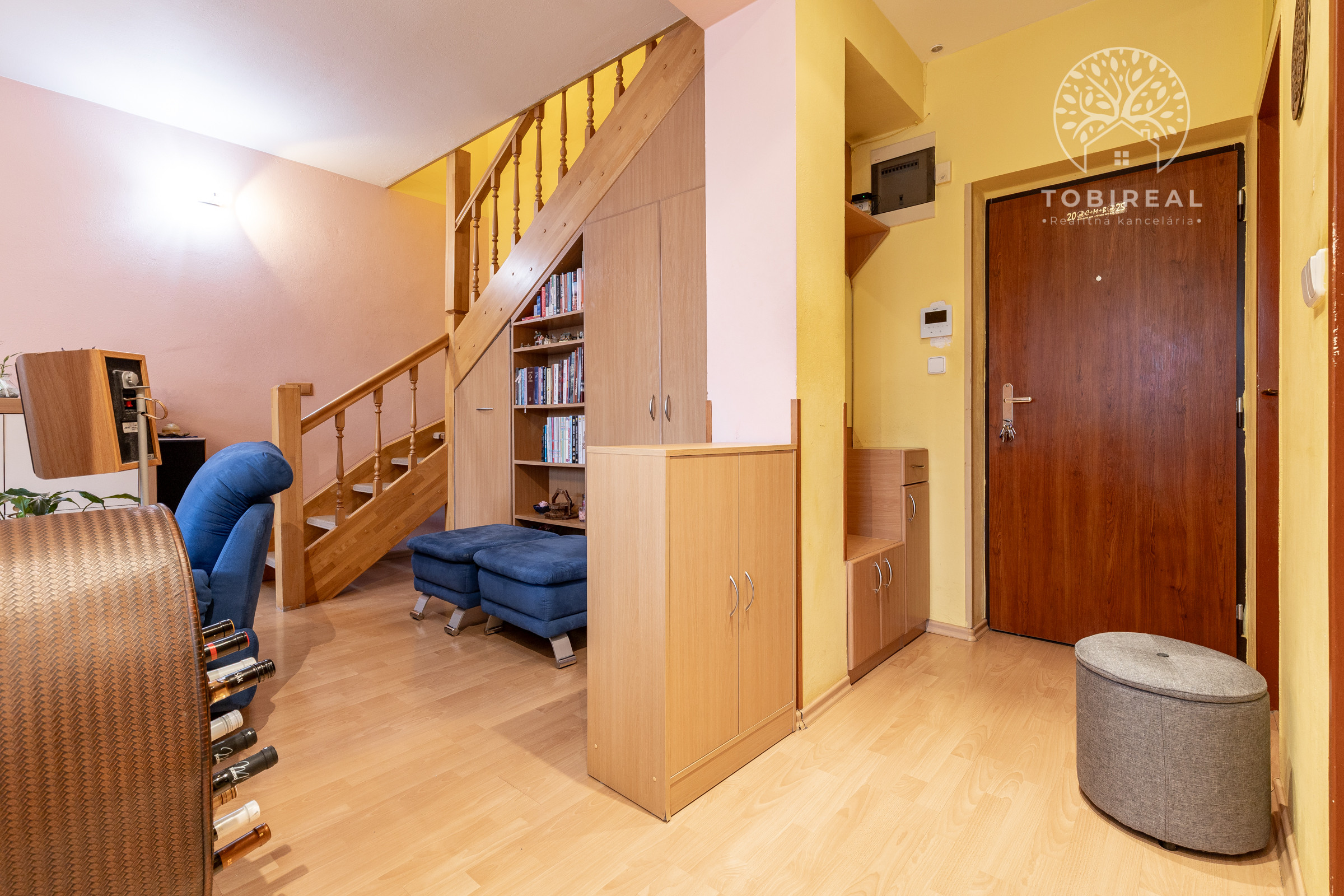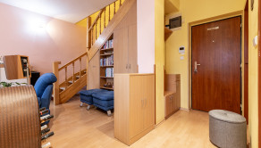 Dispozícia bytu je riešená účelne a s dôrazom na komfort každodenného bývania. Na spodnom podlaží sa nachádza vstupná chodba, samostatná toaleta, kúpeľňa so sprchovým kútom, obývacia izba a kuchyňa orientované spolu s dvoma izbami na juh. Na hornom podlaží je ďalšia samostatná izba orientovaná na sever a kúpeľňa s vaňou a toaletou. Byt ponúka dostatok úložného priestoru vďaka vstavaným skriniam.