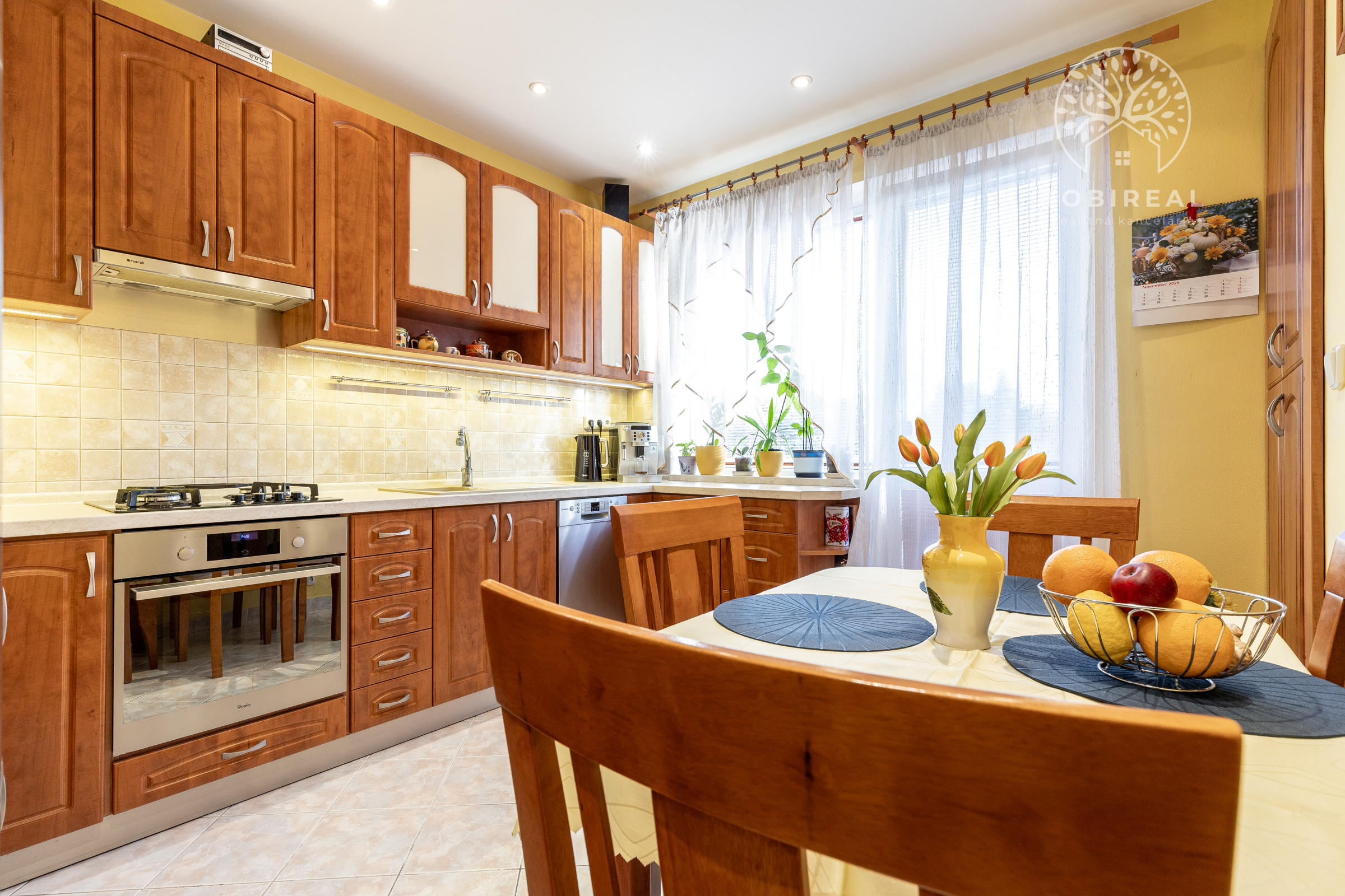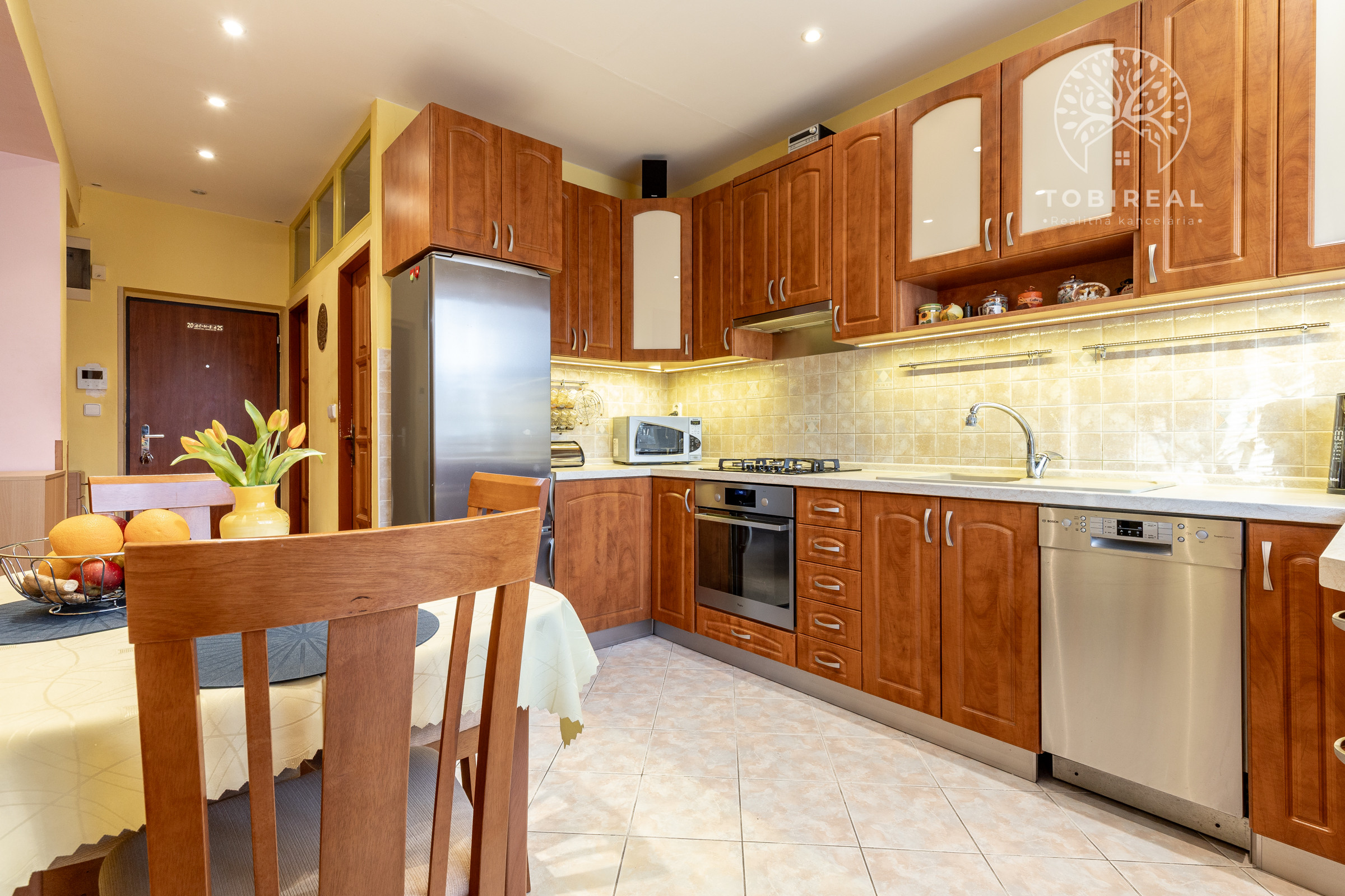 Kuchyňa je kompletne vybavená spotrebičmi, nachádza sa v nej umývačka riadu, chladnička, digestor, sporák, elektrická rúra a mikrovlnka.