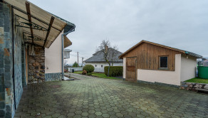 K domu prislúcha garáž pre jedno auto a 4 vonkajšie parkovacie miesta, ktoré poskytujú komfortné parkovanie pre rodinu aj návštevy.