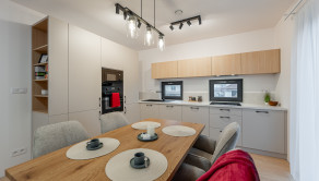 Dom sa predáva čiastočne zariadený. Kuchyňa je vybavená kuchynskou linkou so spotrebičmi (umývačka, chladnička, mraznička, digestor, indukčná varná doska, elektrická rúra a vstavaná mikrovlnka). Súčasťou vybavenia je aj vstavaná skriňa v chodbe, ktorá ponúka praktický úložný priestor.
