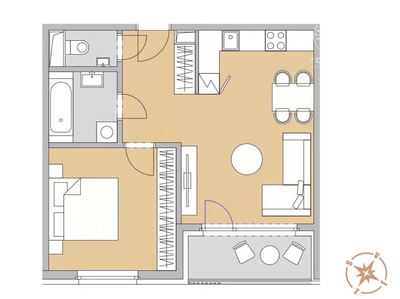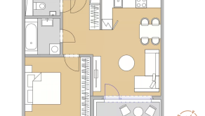 Cena 2 izbového bytu sa v tomto bytovom projekte pohybuje v závislosti od podlažia od 160 000 € do 190 000 €. Byt pozostáva z presvetlenej dennej časti, ktorú tvorí kuchyňa prepojená s obývačkou, samostatnej spálni, priestrannej vstupnej chodby, kúpeľne a samostatnej toalety s umývadielkom. Nesmie chýbať loggia s rozlohou viac ako 4,5 m2.