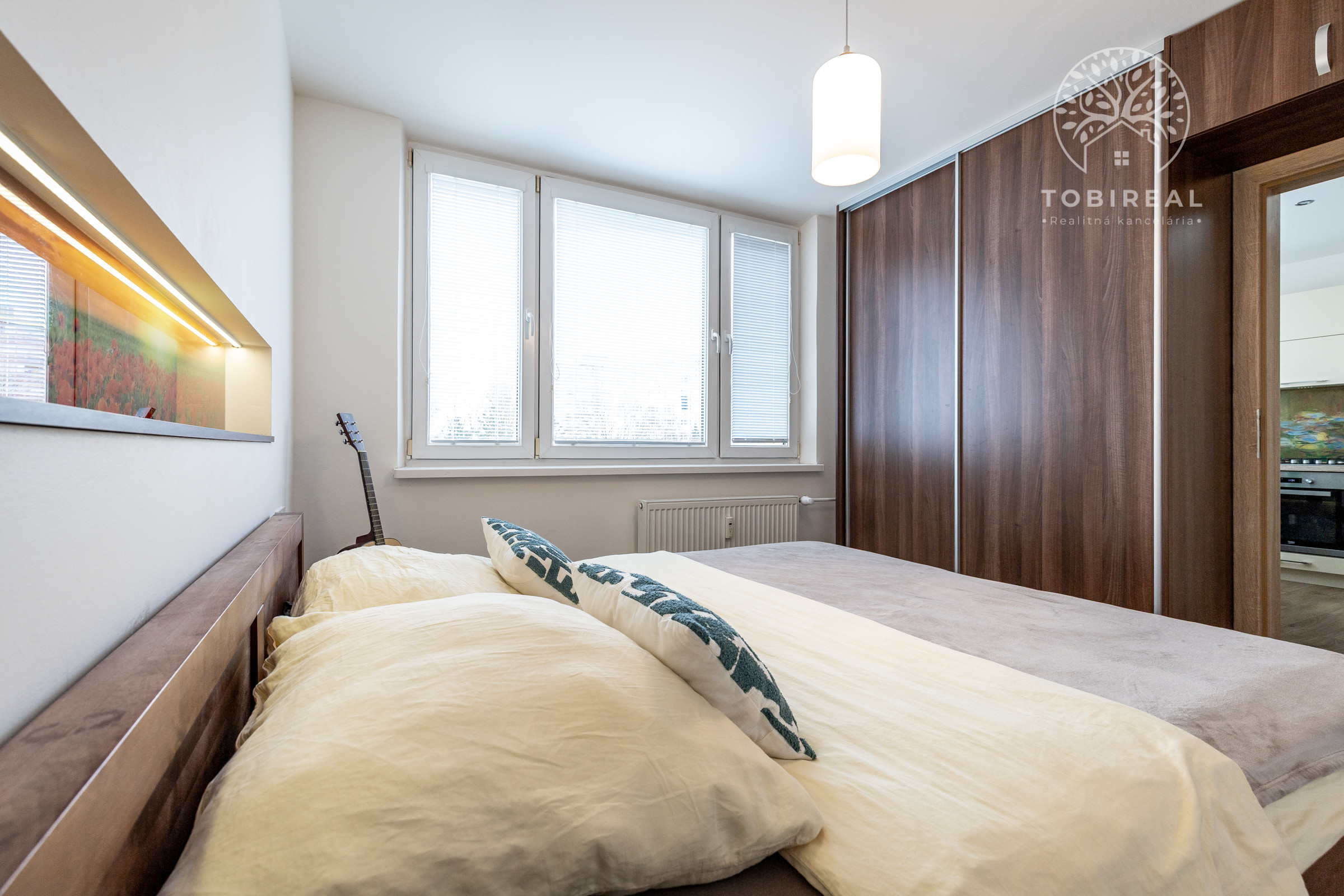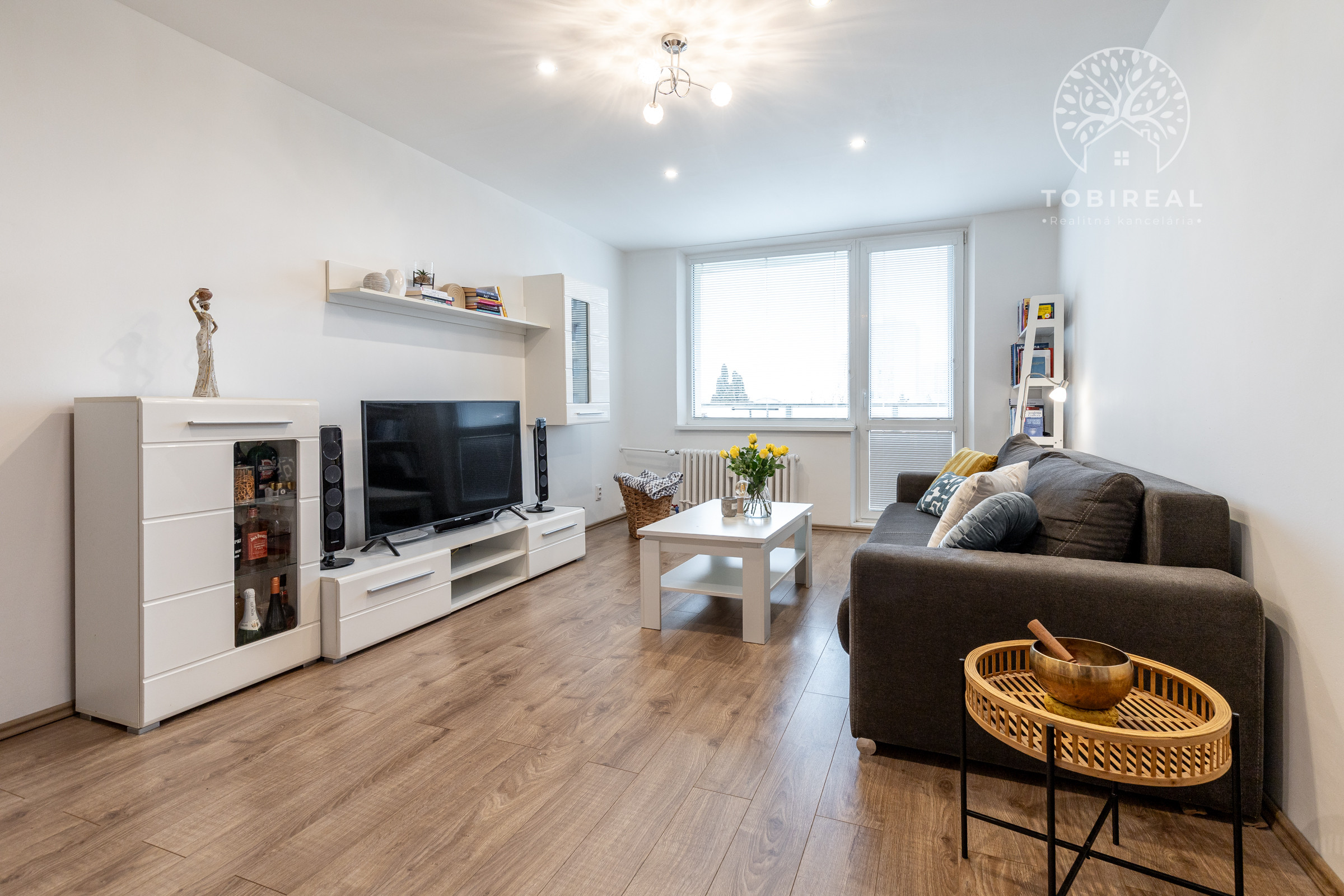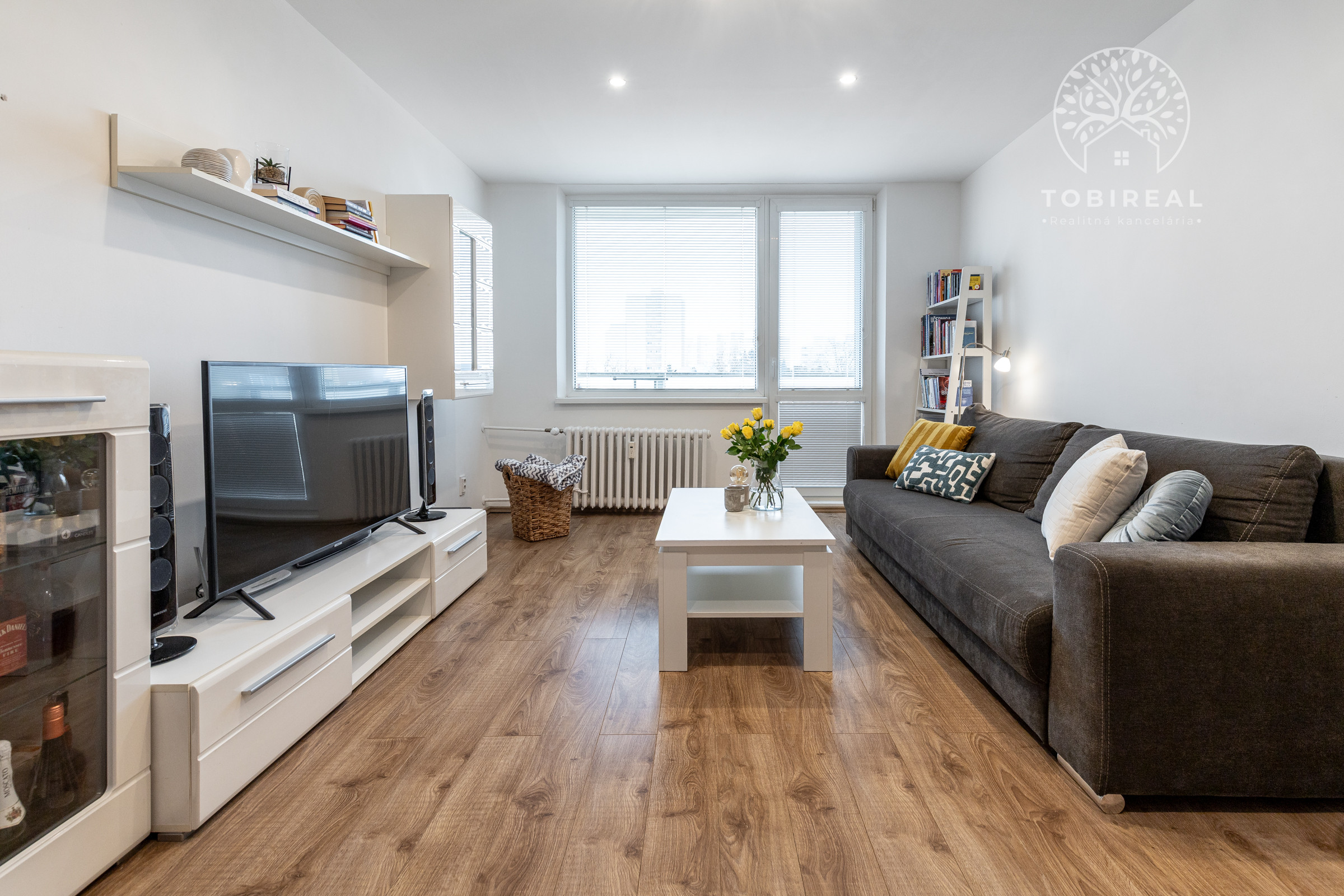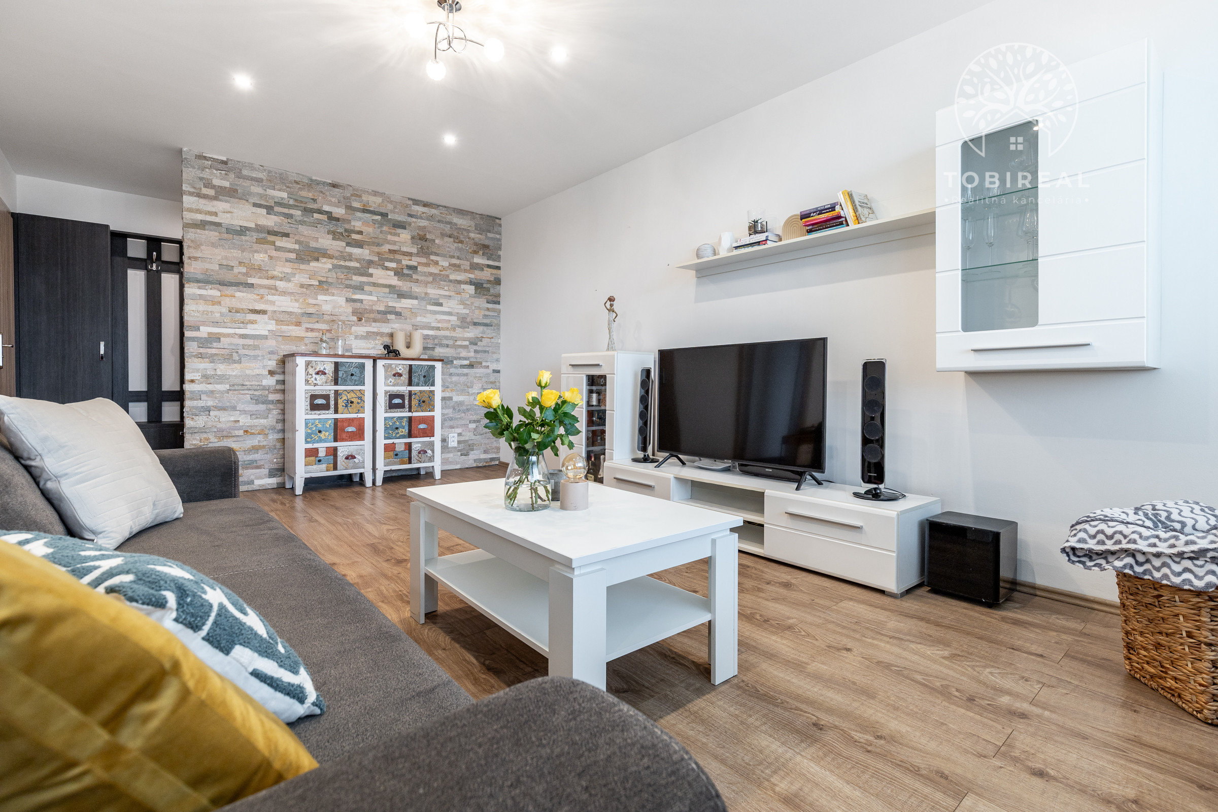 Byt sa nachádza na 2. poschodí zatepleného panelového bytového domu s dvomi výťahmi a má celkovú výmeru 65,49 m². Je po kompletnej rekonštrukcii a dispozične pozostáva zo vstupnej chodby, obývacej izby so vstupom na loggiu, dvoch samostatných izieb, kuchyne, kúpeľne s vaňou a sprchovacím kútom a oddelenej toalety. Kuchynská linka je vybavená spotrebičmi: umývačka riadu, chladnička, mraznička, digestor, sporák, elektrická rúra a mikrovlnná rúra. Praktický úložný priestor zabezpečujú vstavané skrine. K bytu prislúcha aj pivnica.