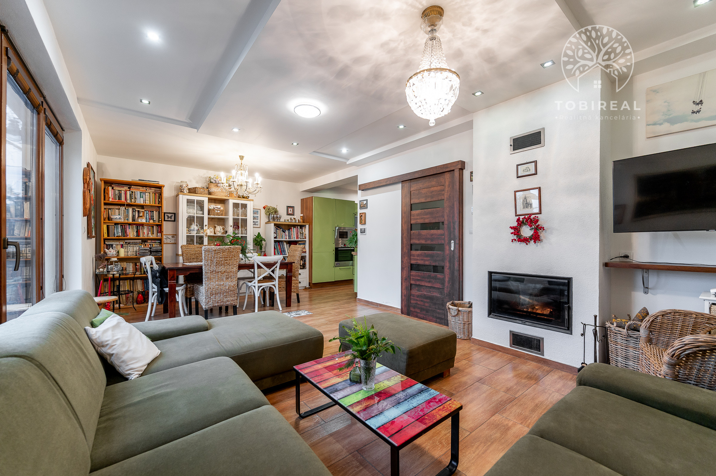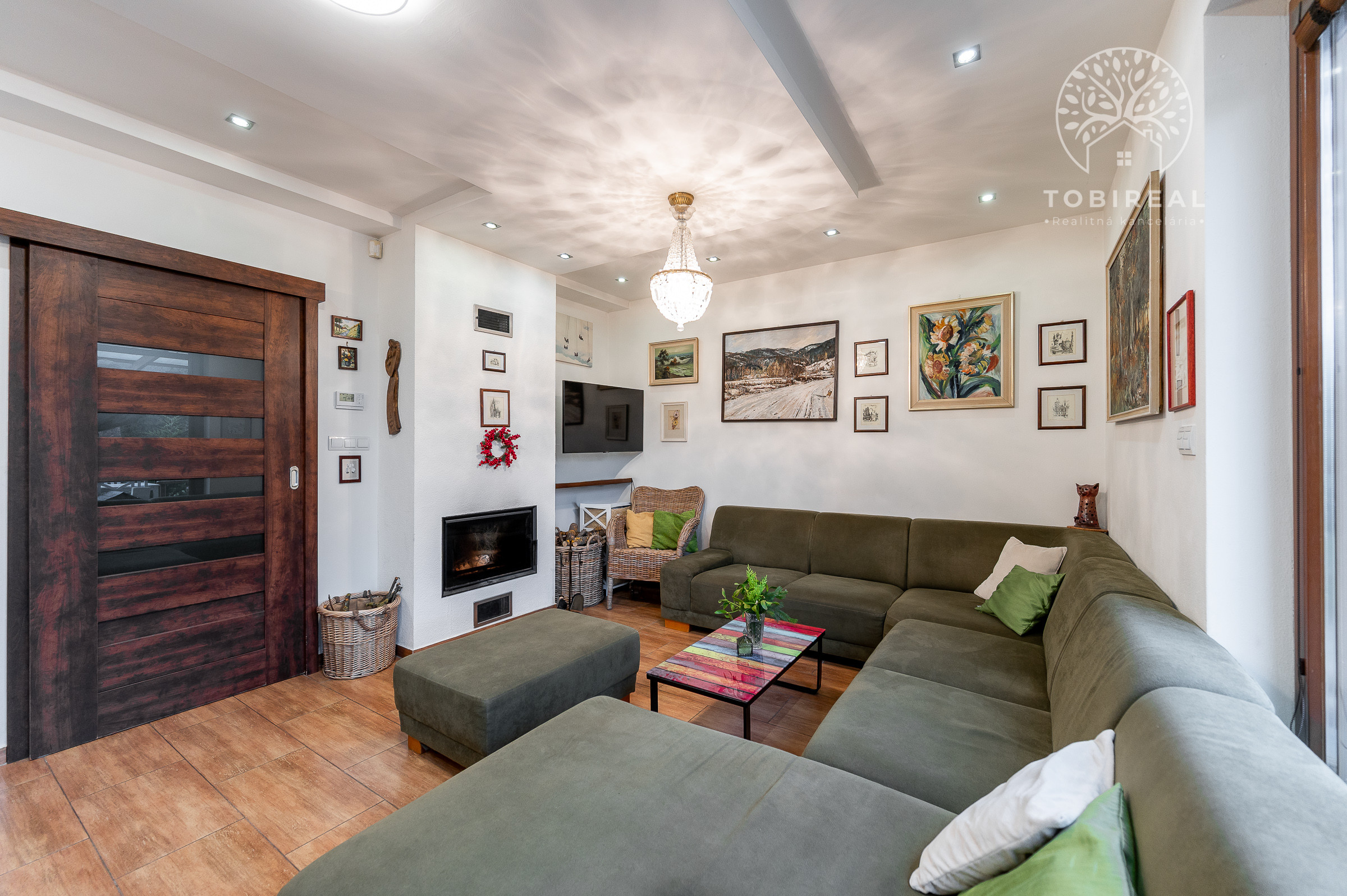 Dispozične pozostáva zo vstupnej chodby so vstavanou skriňou, obývacej izby s krbom prepojenej s jedálenskou časťou a výstupom na terasu, samostatnej kuchyne, kúpeľne s rohovou vaňou, umývadlom, toaletou a rebríkovým radiátorom, samostatnej toalety na prízemí a troch samostatných izieb.
