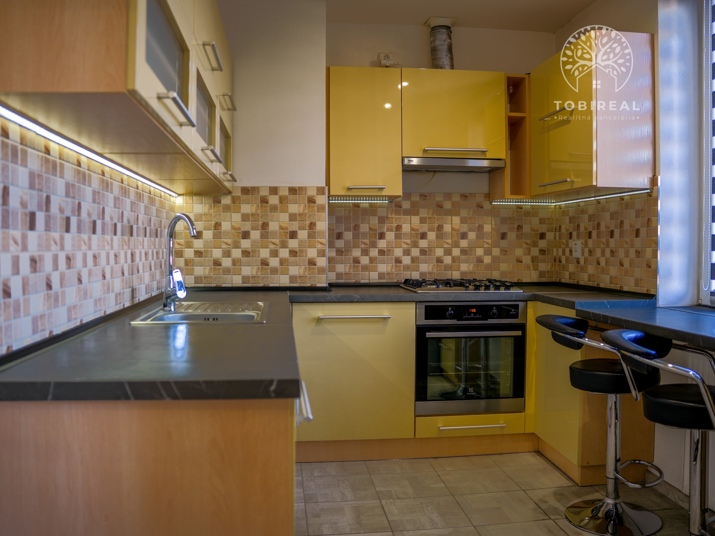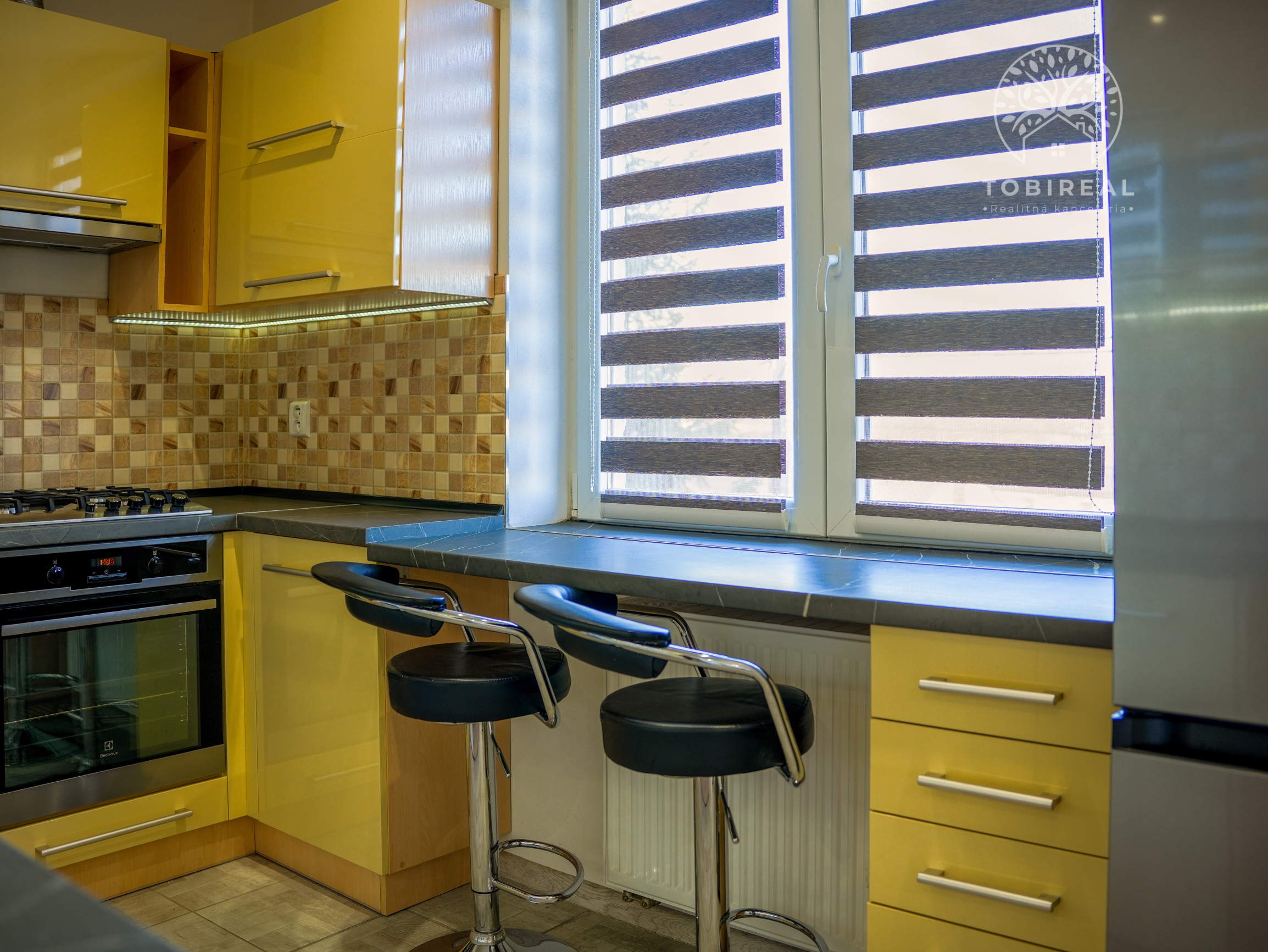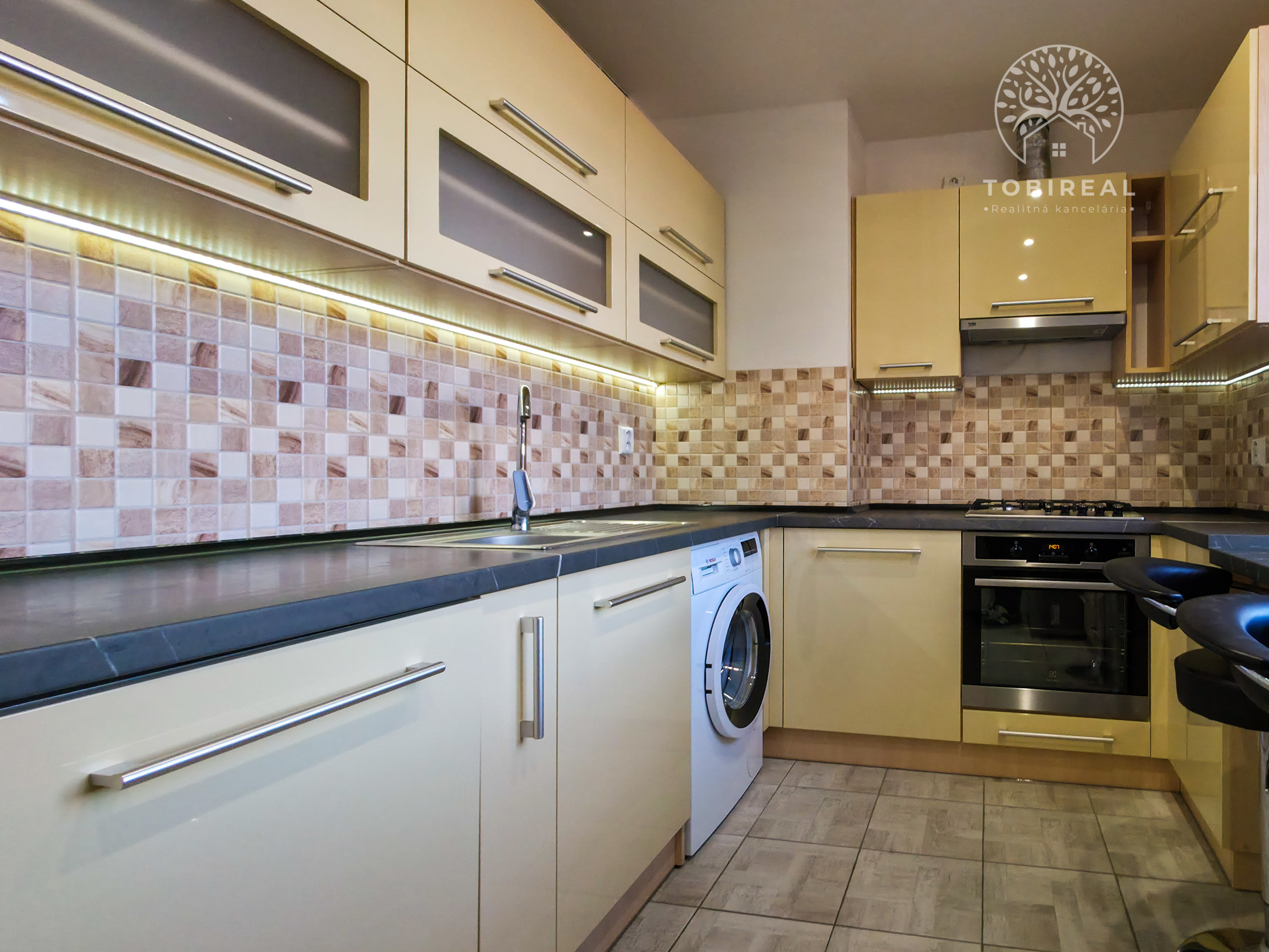 Kuchynská linka je kompletne vybavená spotrebičmi: umývačka riadu, chladnička, mraznička, digestor, sporák, elektrická rúra.