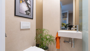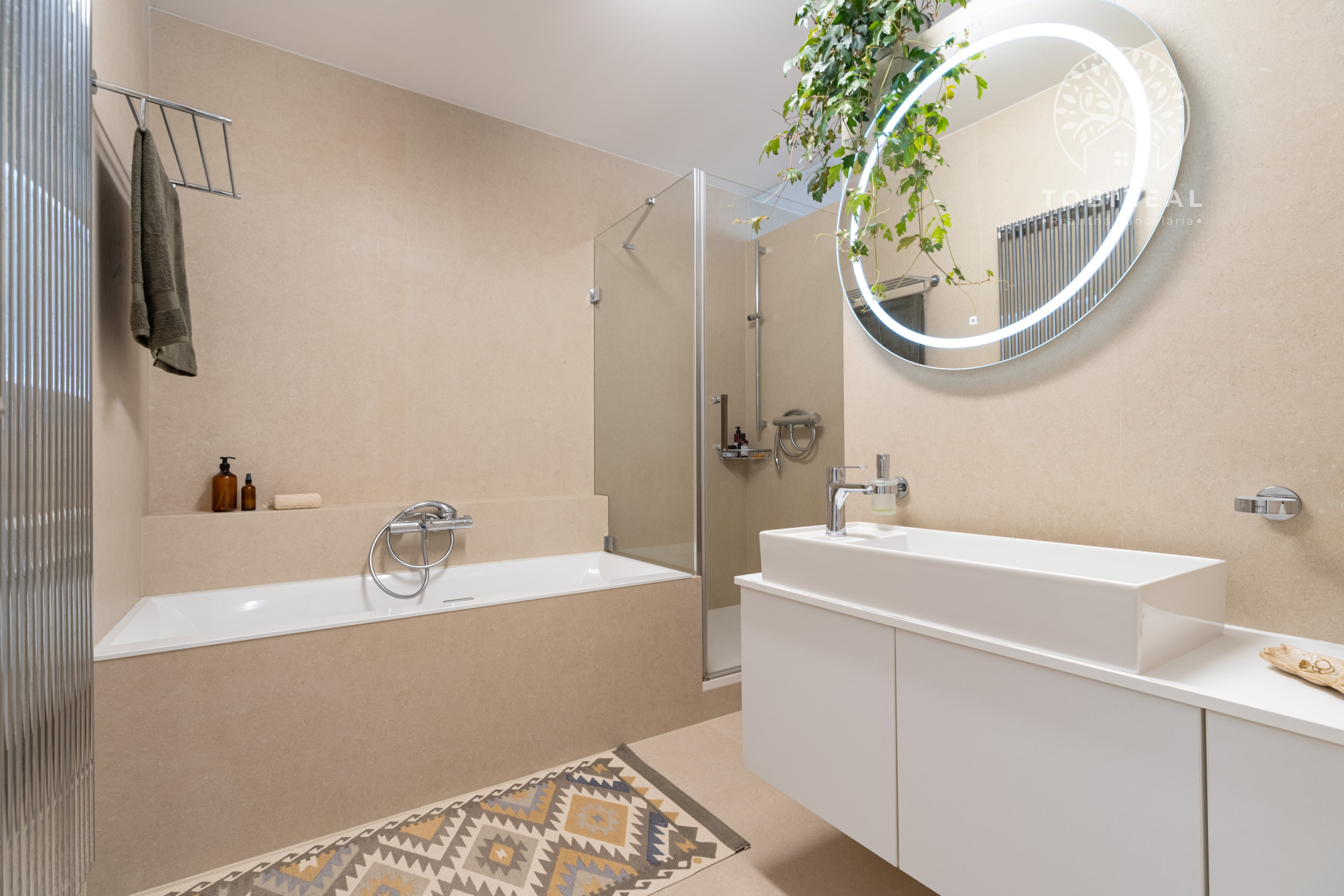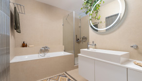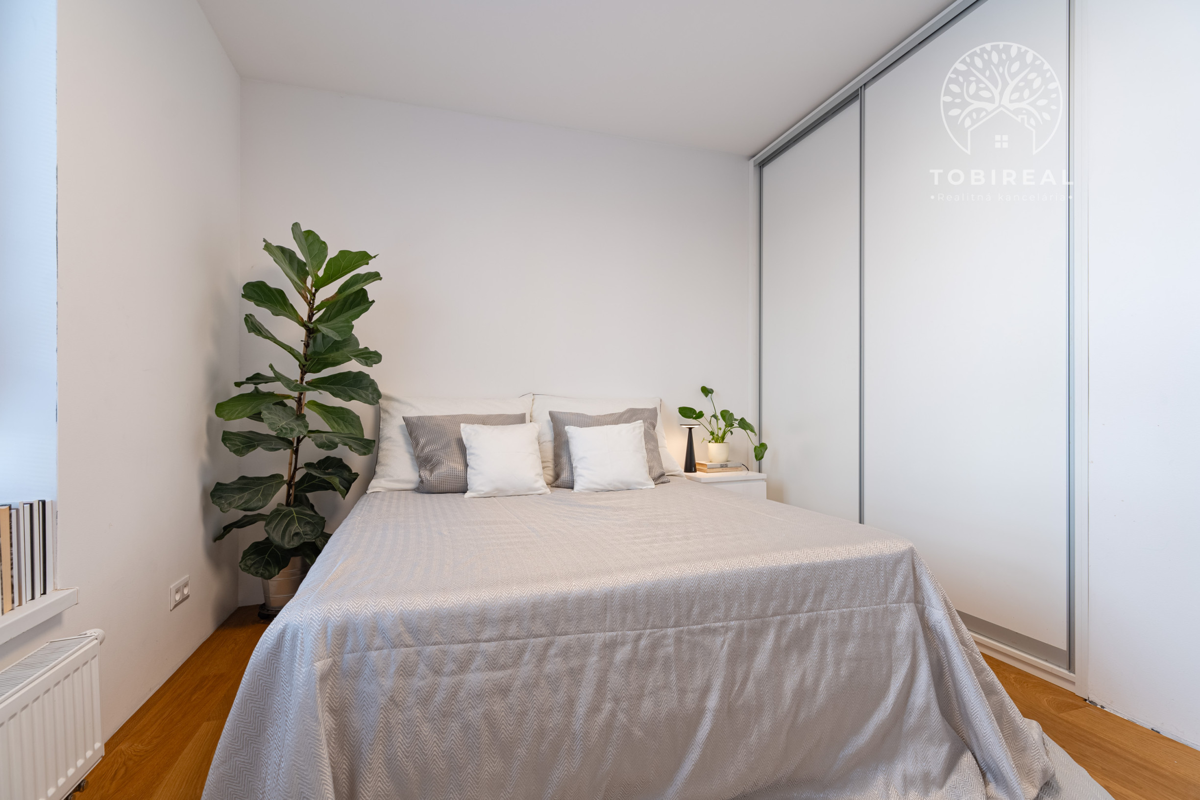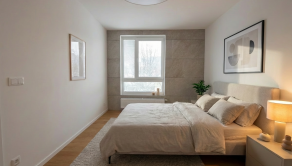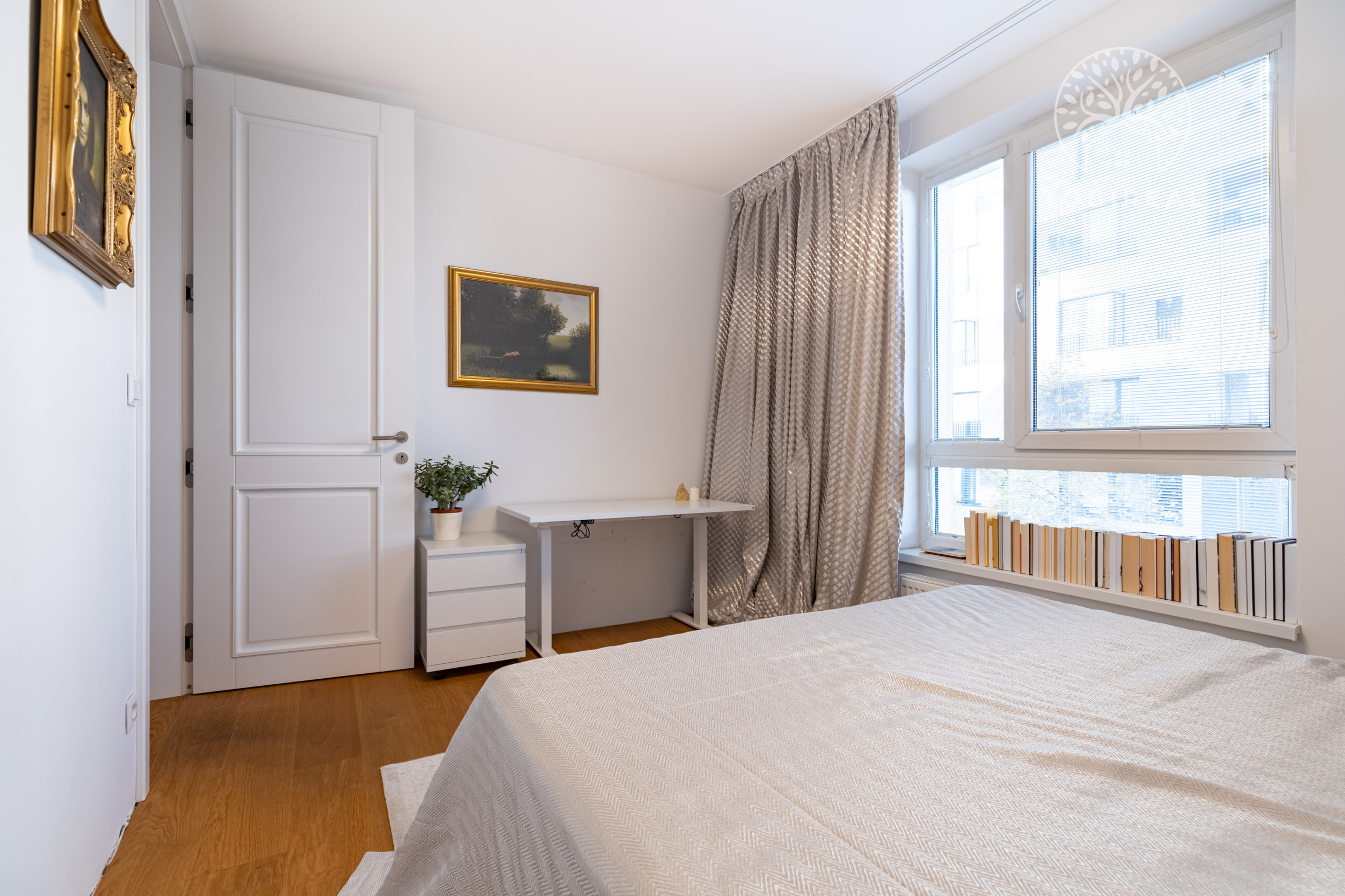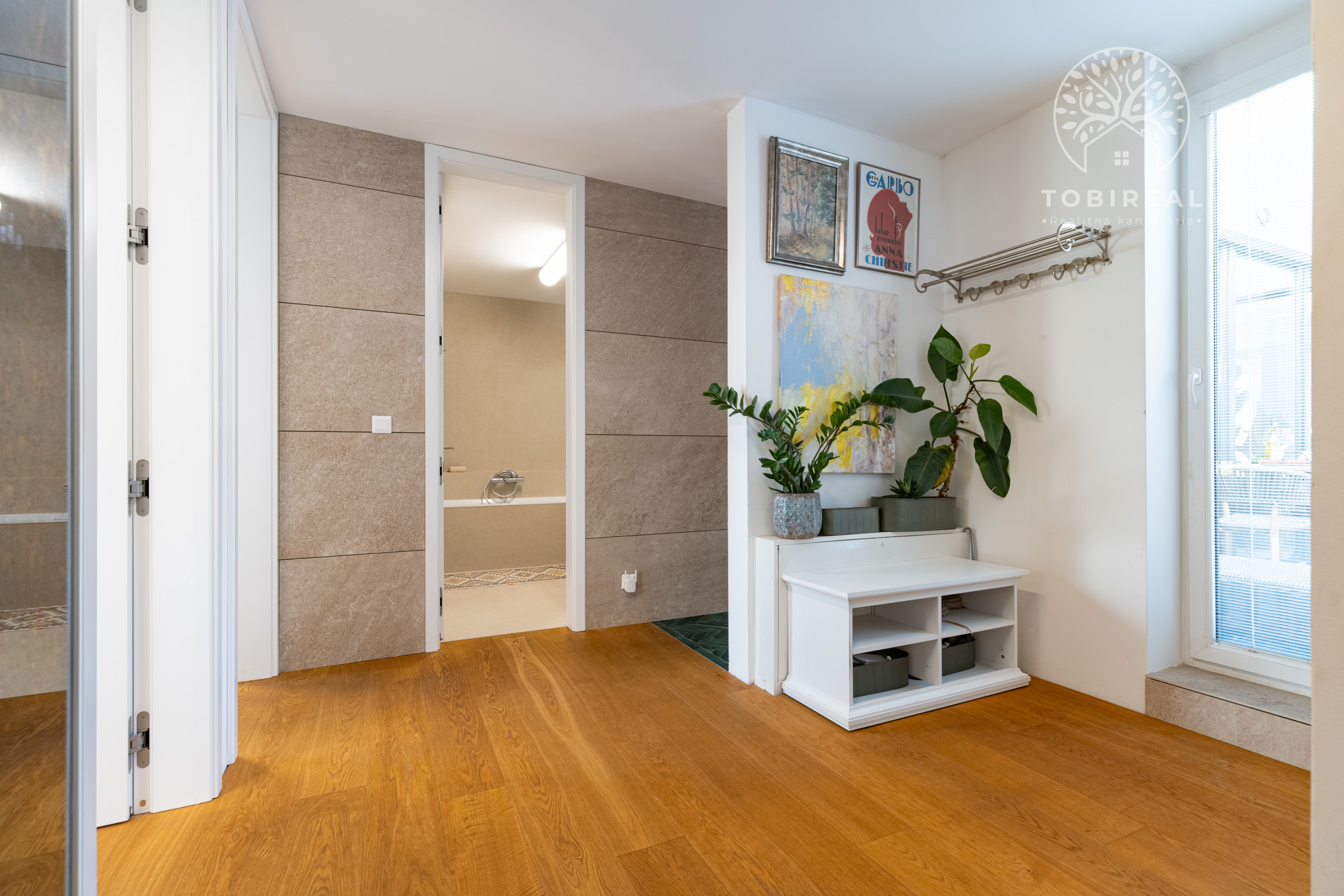 Byt má celkovú výmeru 101,7 m², z čoho 2,7 m² tvorí murovaný sklad umiestnený na chodbe priamo pred bytom. Súčasťou bytu je aj súkromné átrium o výmere 12,8 m², ktoré nie je započítané do celkovej plochy bytu. Dispozične pozostáva z priestrannej vstupnej chodby, samostatnej toalety pre hostí, dvoch samostatných izieb, hlavnej kúpeľne s vaňou, sprchovacím kútom a toaletou, veľkorysej obývacej izby prepojenej s kuchyňou a vstupom do átria a ďalšej izby.