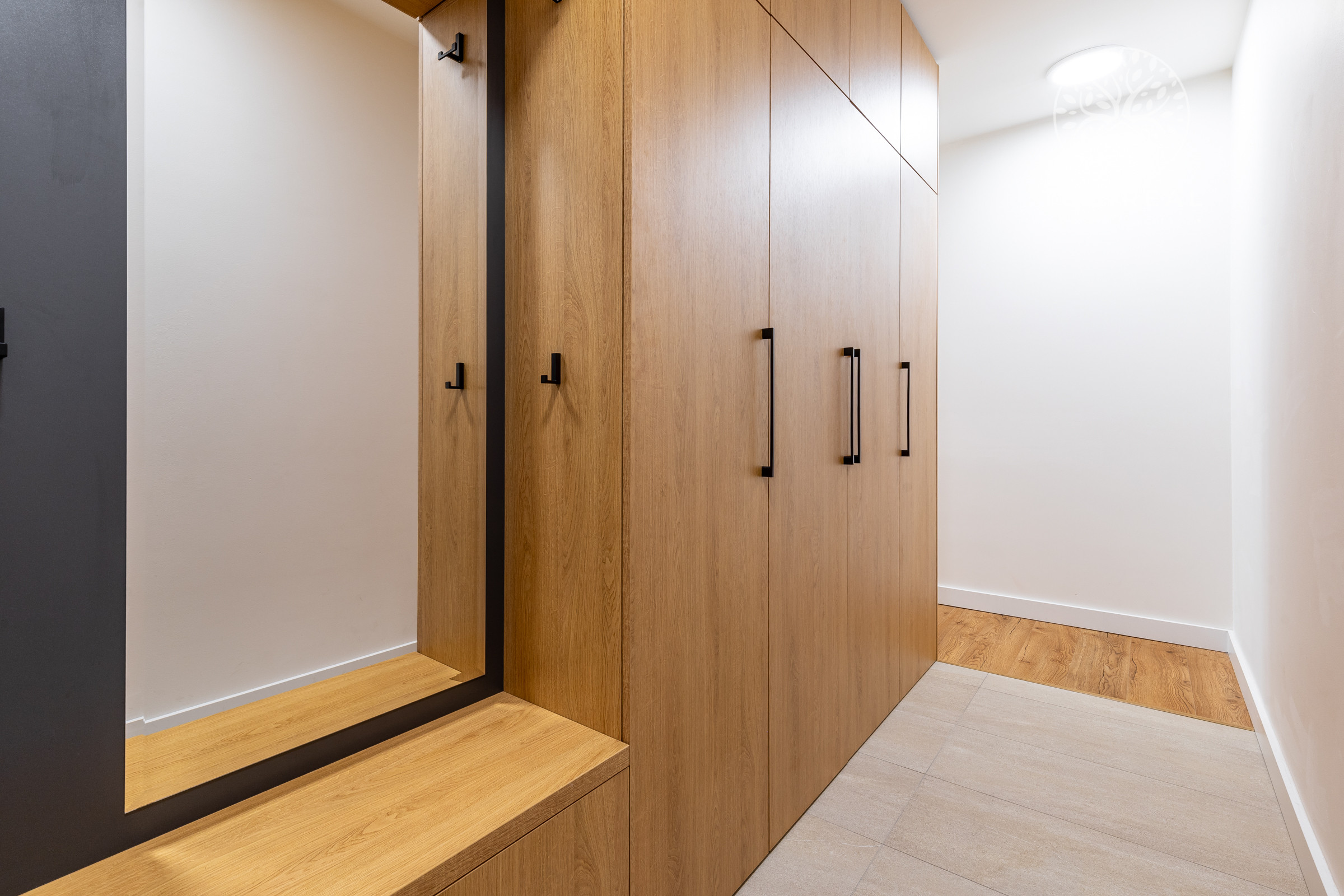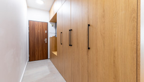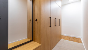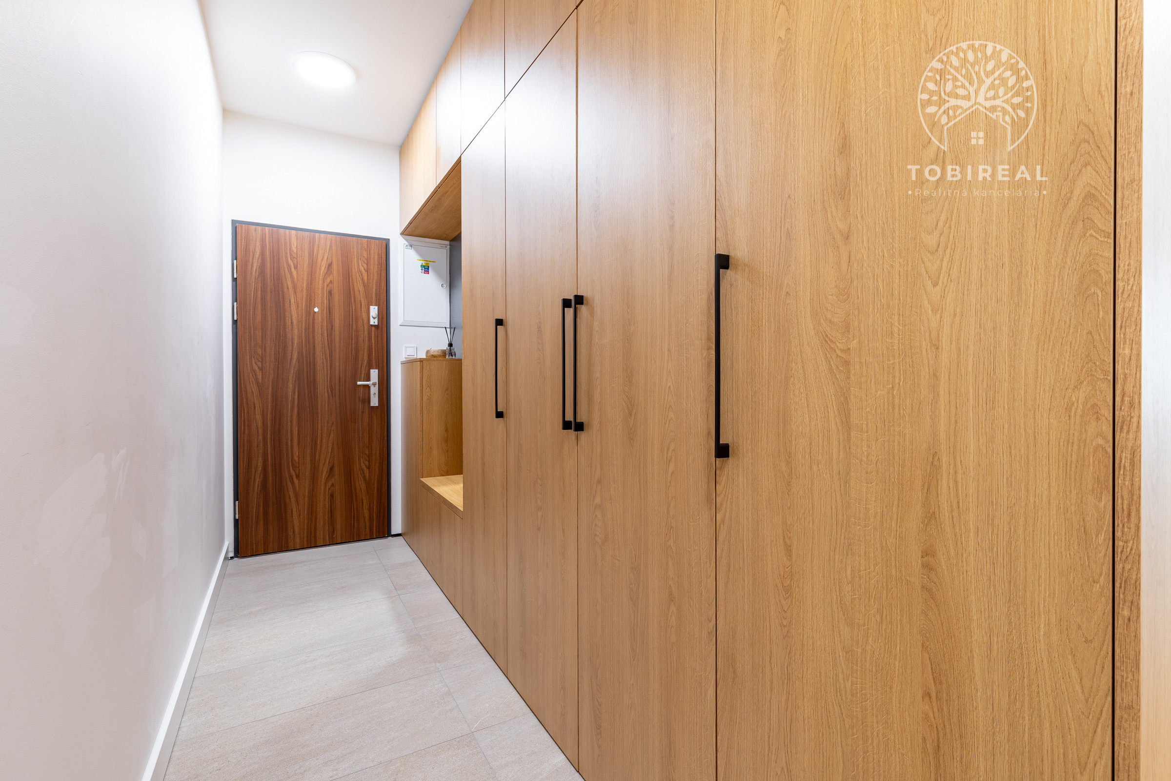 Byt je vybavený bezpečnostnými dverami, praktickými vstavanými skriňami a moderným podlahovým kúrením, ktoré zabezpečuje príjemný tepelný komfort. Kvalitné plastové okná s trojsklom poskytujú výbornú tepelnú aj zvukovú izoláciu. Podlahy sú riešené v štýlovej kombinácii plávajúcej podlahy a elegantnej dlažby, čo dodáva interiéru moderný a čistý vzhľad.