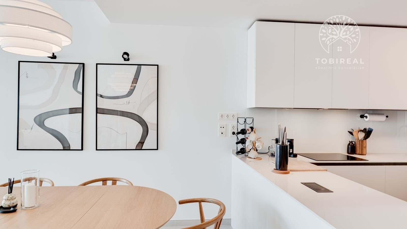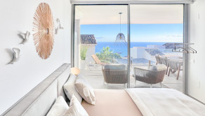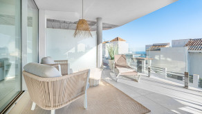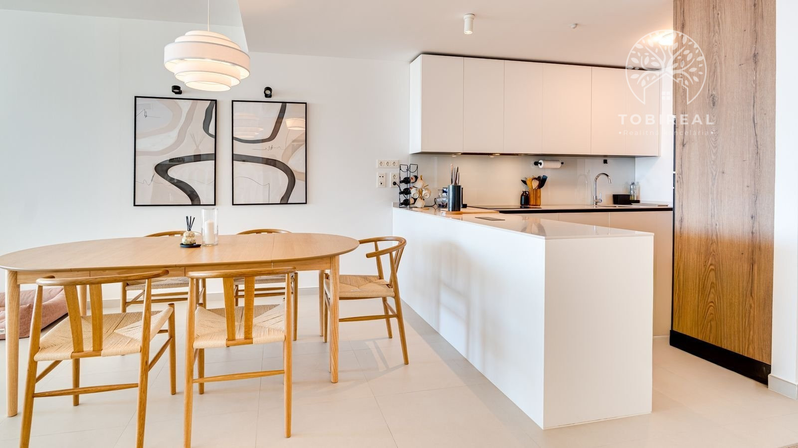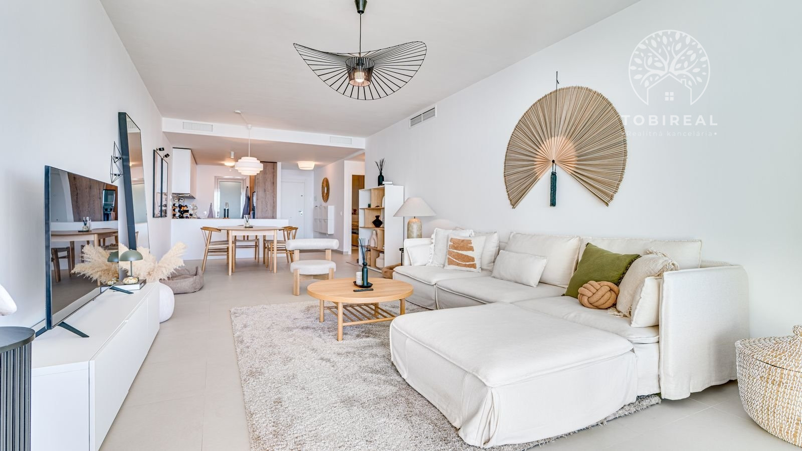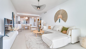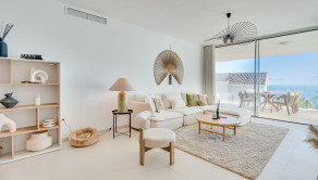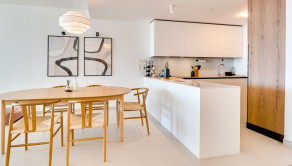 Denná časť bytu je navrhnutá v otvorenom koncepte a funkčne prepája kuchyňu, jedáleň a obývaciu izbu. Veľké posuvné sklenené dvere zabezpečujú dostatok prirodzeného svetla a plynulý prechod na priestrannú terasu o výmere 31 m², ktorá ponúka otvorený výhľad na more a ideálny priestor na relax či vonkajšie posedenia. Kuchyňa prirodzene zapadá do celkovej dispozície bytu a podčiarkuje moderný, decentný dizajn interiéru.