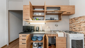 Kuchyňa je vybavená spotrebičmi: chladnička, mraznička, sporák, mikrovlnná rúra. V kúpeľni sa nachádza práčka a nová vaňa.