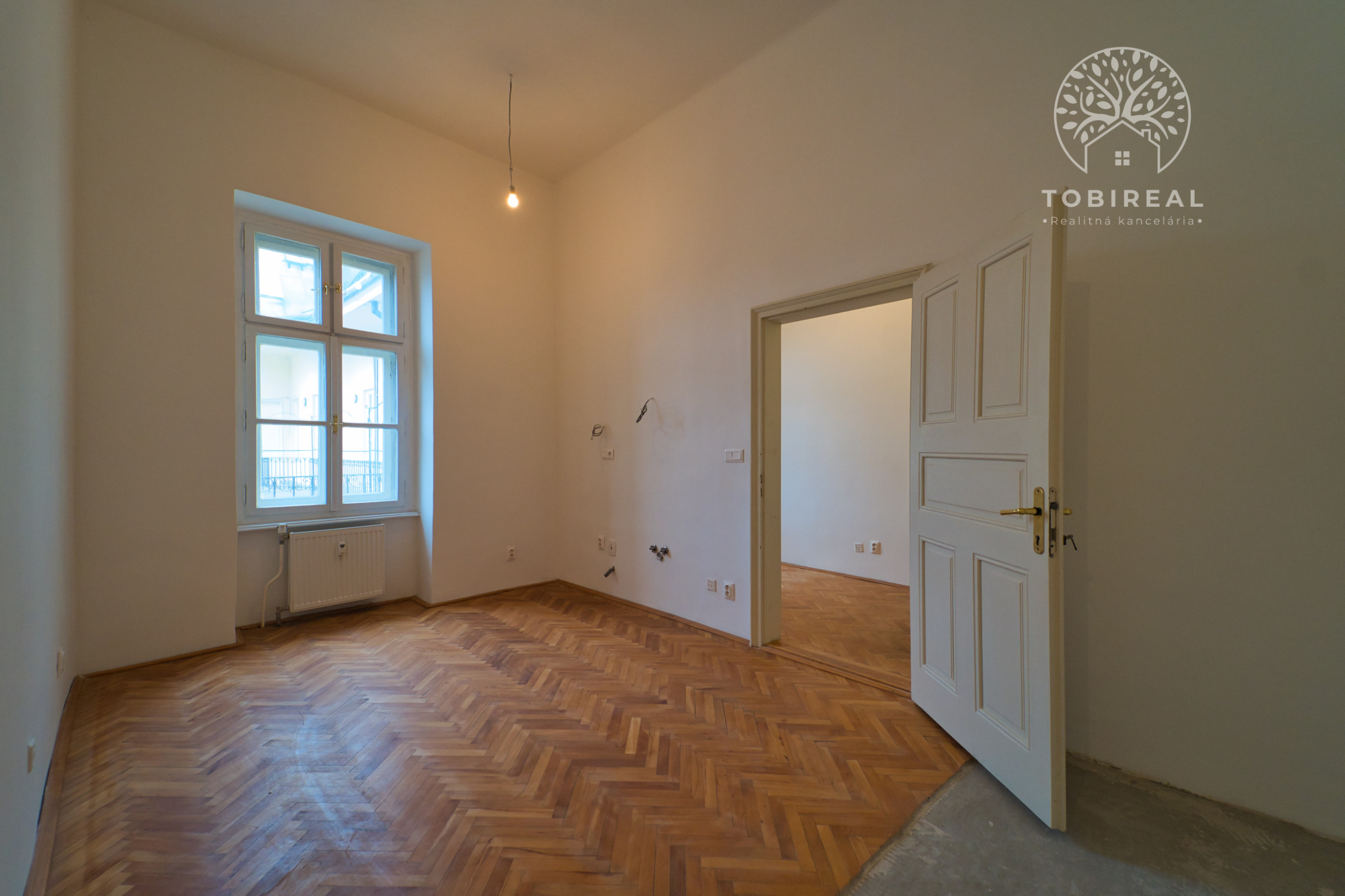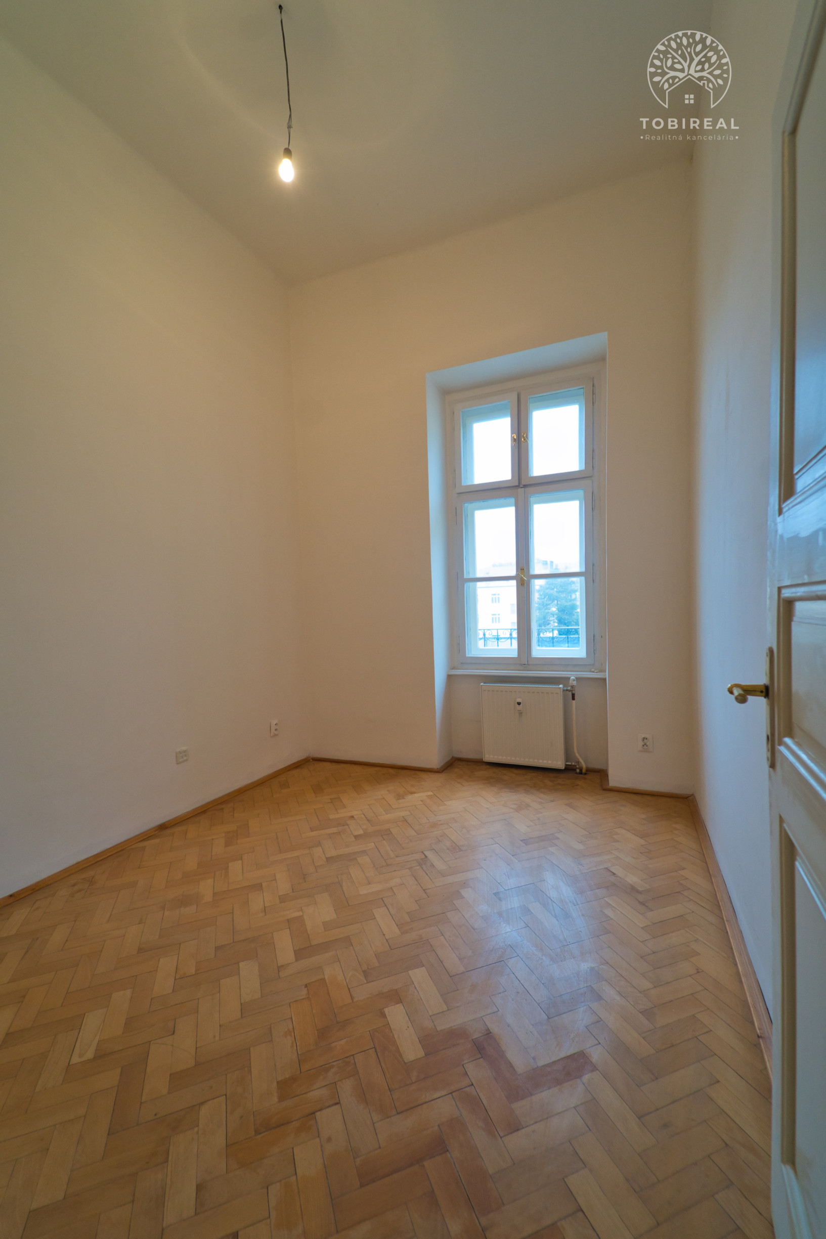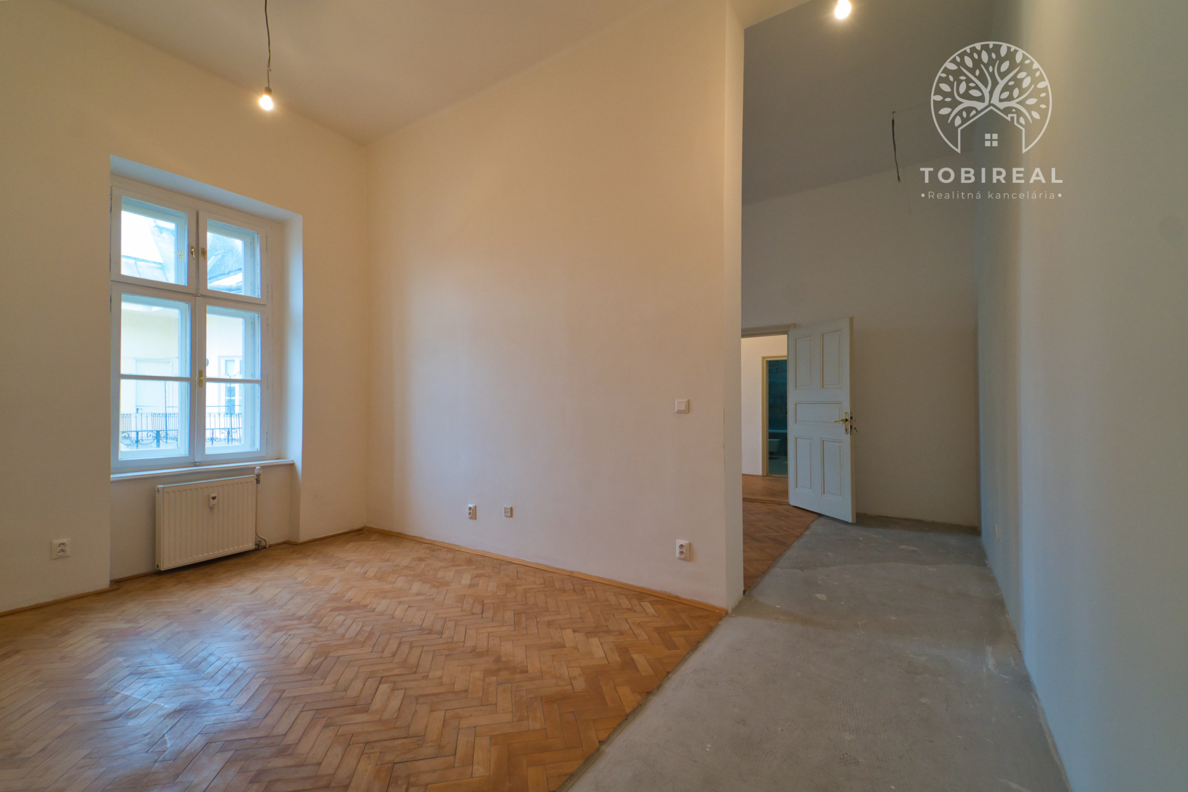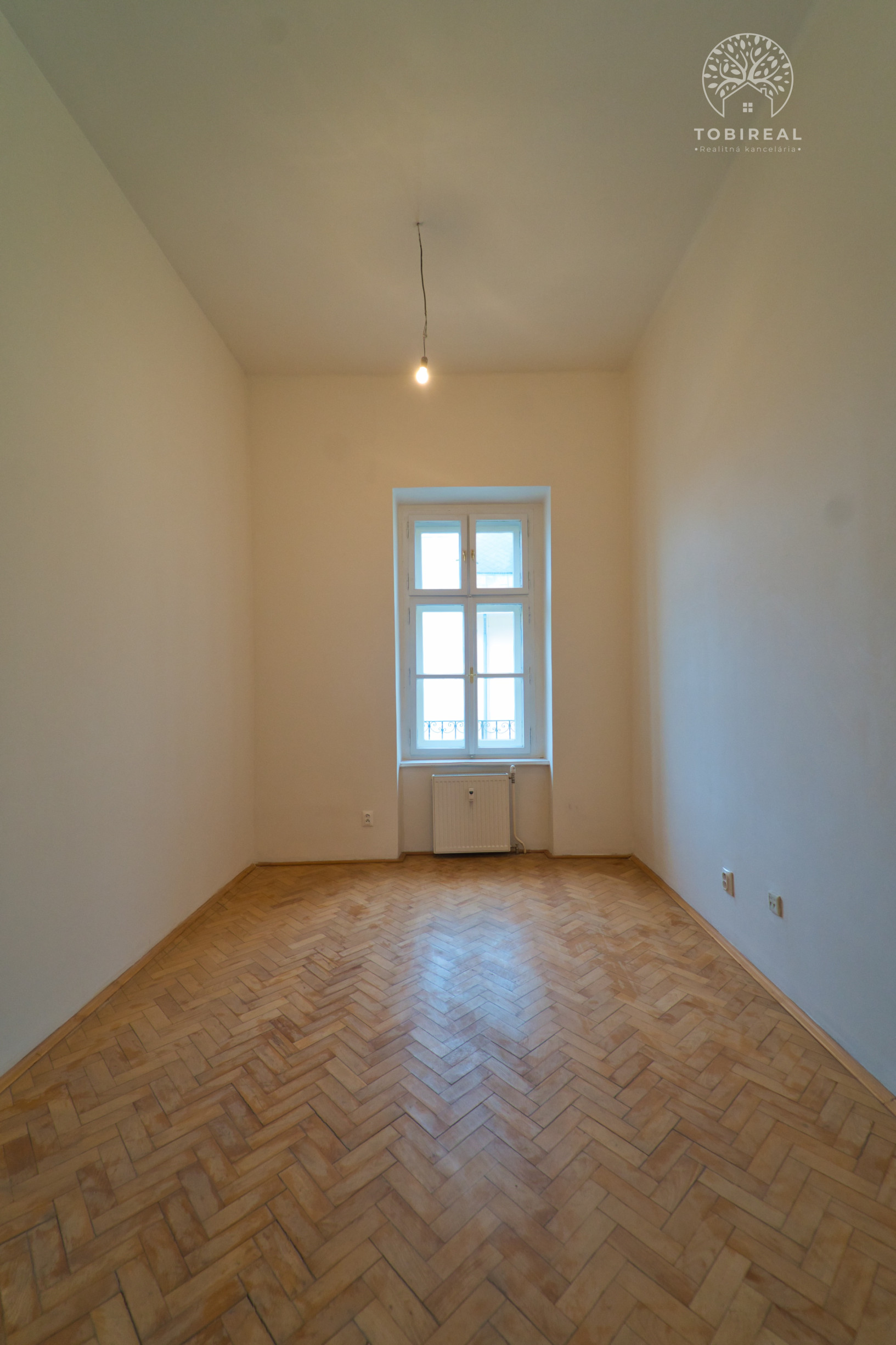 Tento priestranný byt s úžitkovou plochou 80 m² sa nachádza na 2. poschodí historickej budovy priamo v centre mesta. Je nezariadený, budúci majiteľ má teda ideálnu príležitosť prispôsobiť si interiér podľa vlastných predstáv. Dispozične pozostáva z troch samostatných izieb, kuchyne, kúpeľne s toaletou a samostatnej toalety.