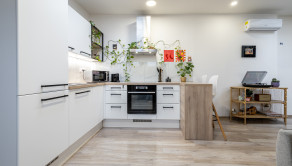Kuchynská linka je plne vybavená spotrebičmi: chladnička, mraznička, digestor, sporák – varná doska značky Mora, elektrická rúra, mikrovlnná rúra.