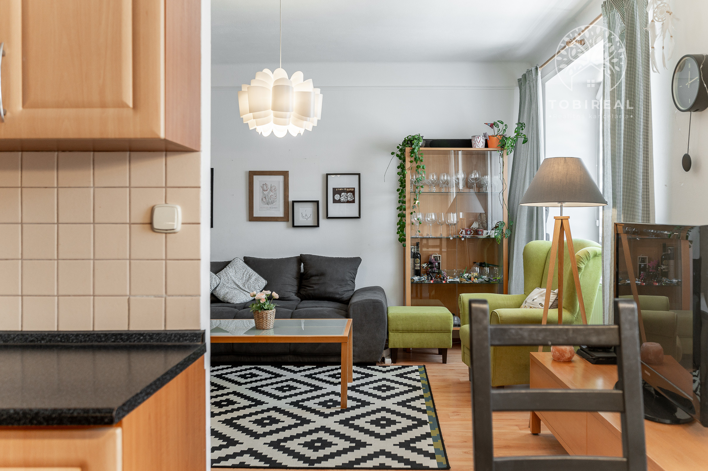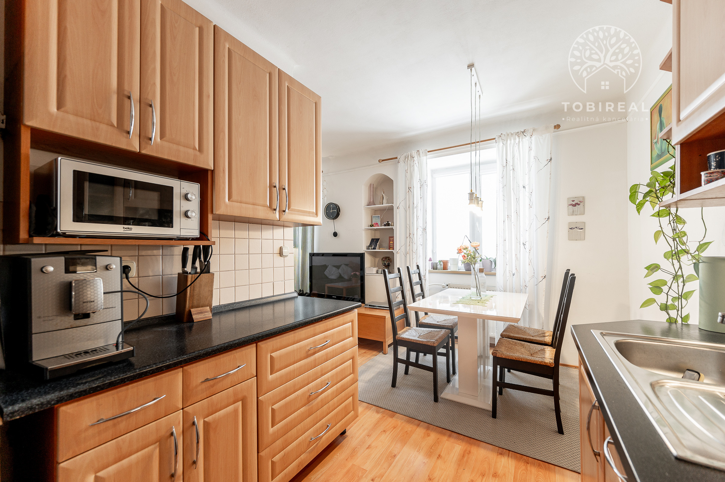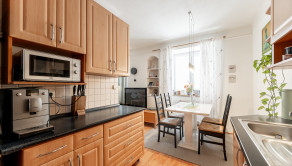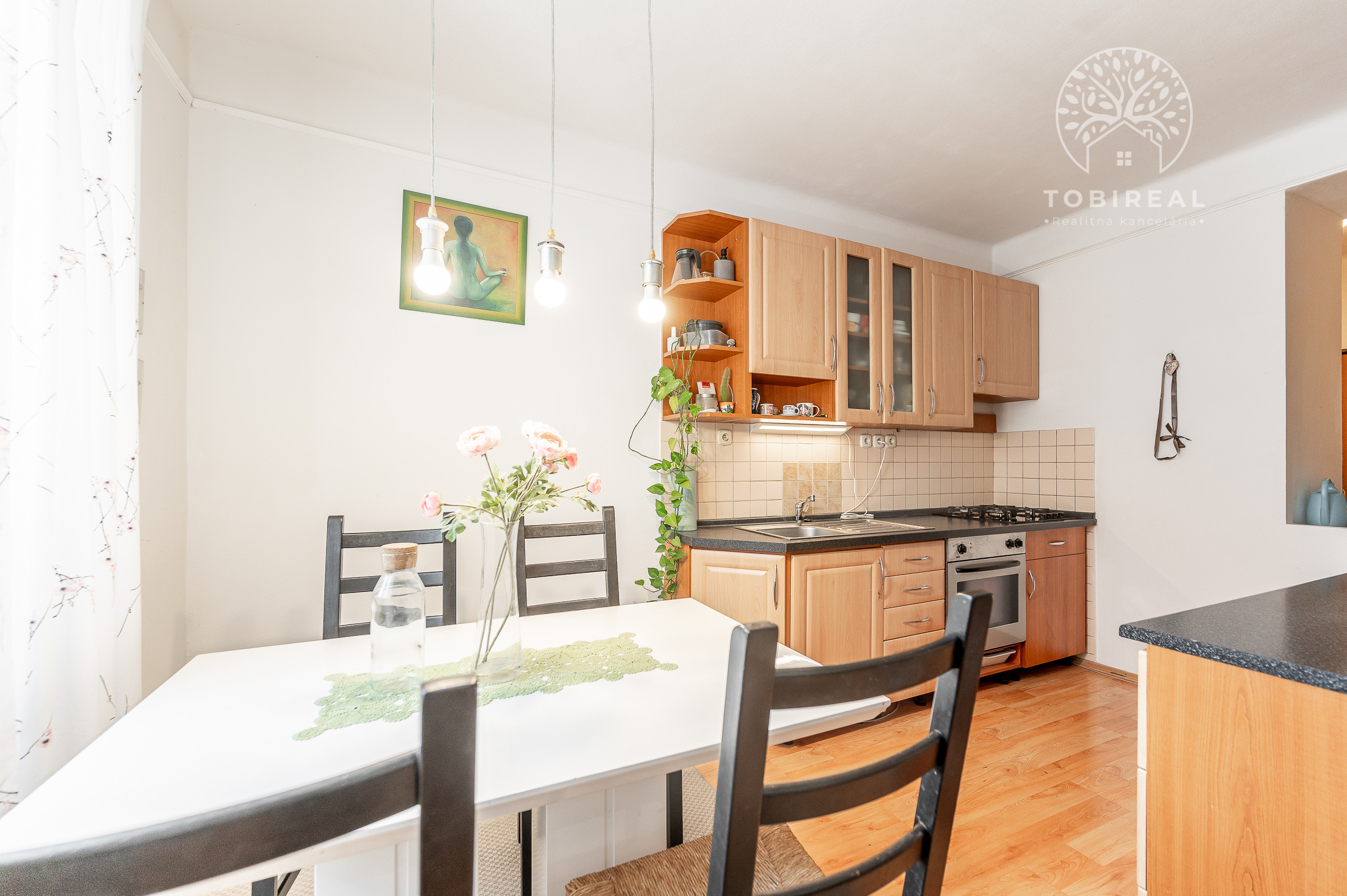 Kuchyňa je plne vybavená modernými spotrebičmi, k dispozícii je varná doska so sporákom, elektrická rúra, chladnička s mrazničkou a digestor. Praktický jedálenský kút so stolom a stoličkami vytvára útulné miesto pre spoločné raňajky či večere.