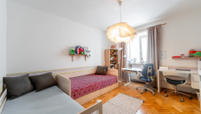 V spálni s posteľou je aj praktický pracovný stôl vhodný na prácu z domu či štúdium. Ďalší úložný priestor, ktorý pomáha udržať poriadok a organizáciu v byte, poskytujú vstavané skrine situované na chodbe.