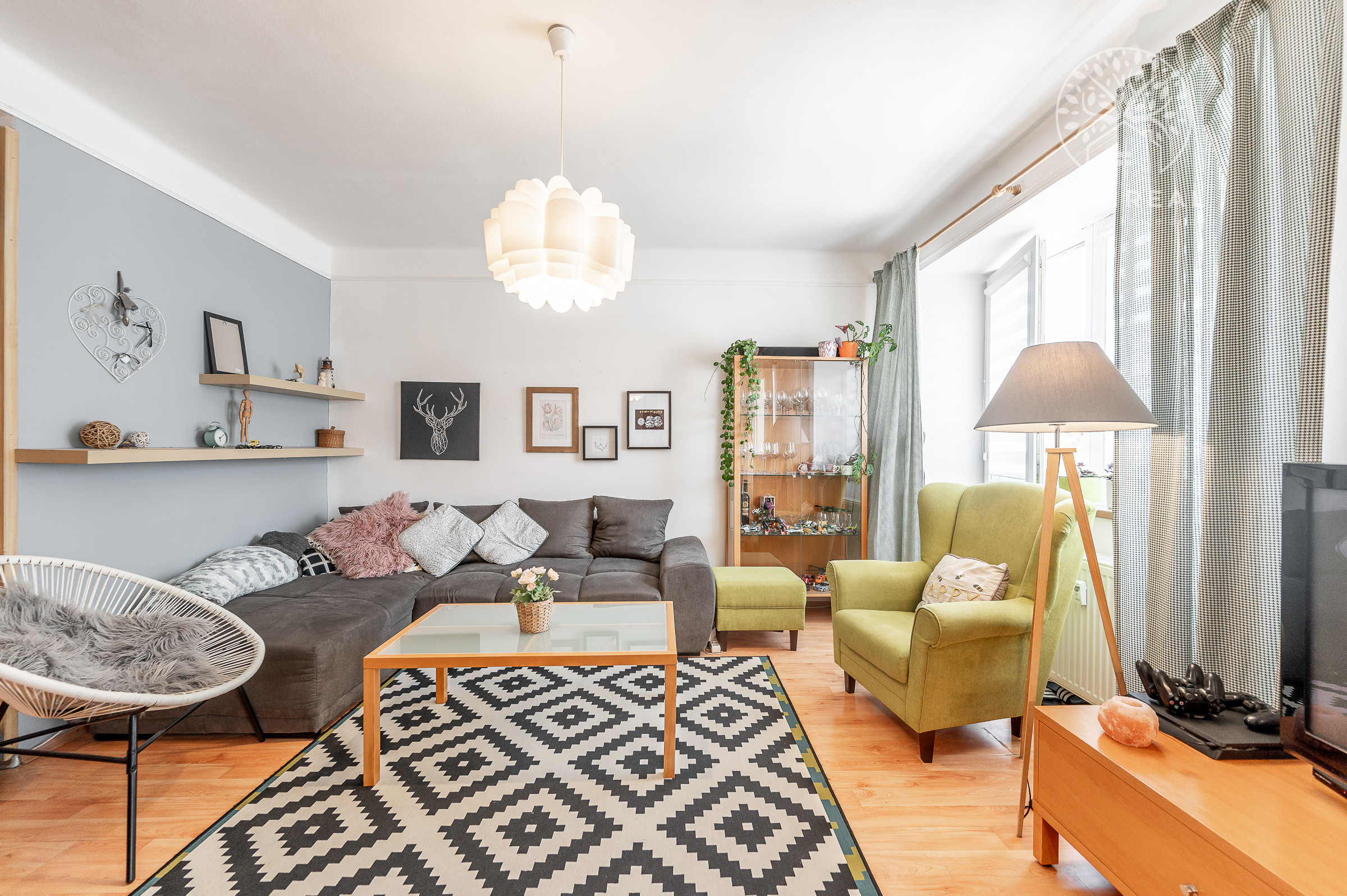 Obývacia izba s pohodlným gaučom a stolík s televízorom vytvára ideálne prostredie na relax, sledovanie filmov alebo stretnutia s priateľmi.