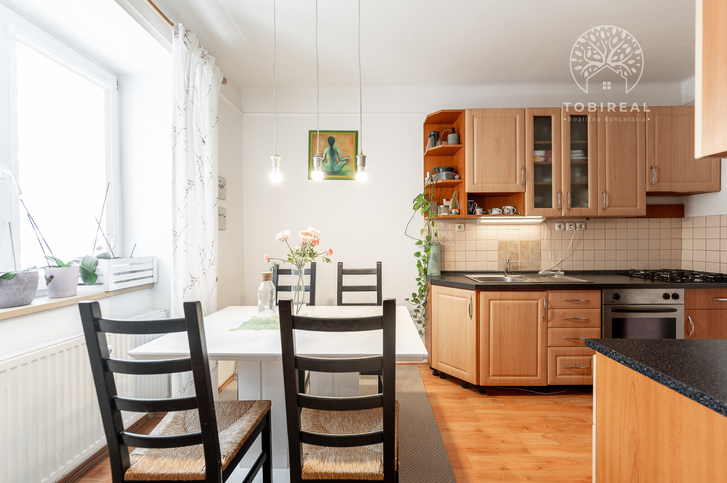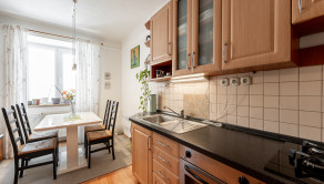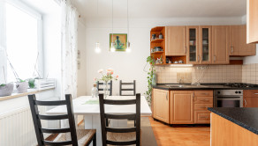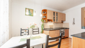 Kuchyňa je plne vybavená modernými spotrebičmi, k dispozícii je varná doska so sporákom, elektrická rúra, chladnička s mrazničkou a digestor. Praktický jedálenský kút so stolom a stoličkami vytvára útulné miesto pre spoločné raňajky či večere.