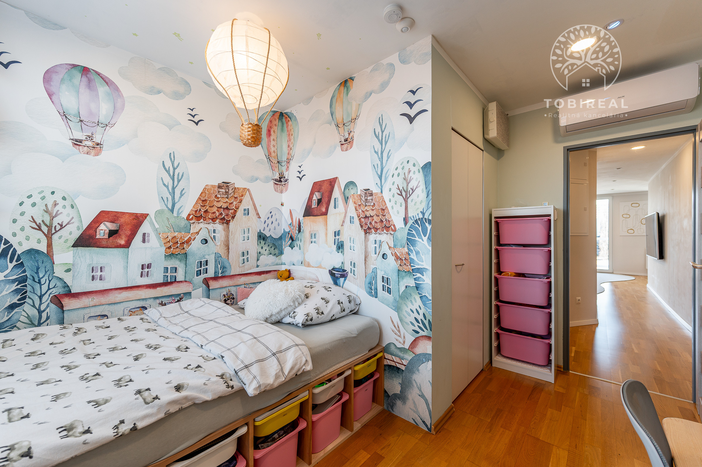 Dispozícia bytu pozostáva zo vstupnej chodby, kúpeľne s vaňou a toaletou, obývacej izby prepojenej s kuchyňou s výstupom na loggiu, spálne so šatníkom a detskej izby so šatníkom. Byt disponuje aj praktickou špajzou, ktorá poskytuje dostatok úložného priestoru.