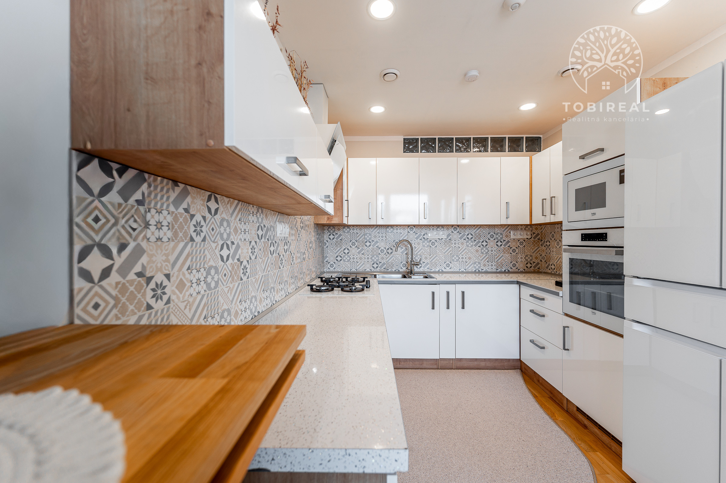 Kuchynská linka je vybavená spotrebičmi – umývačka riadu, chladnička, mraznička, digestor, plynový 5-horákový sporák a zabudovaná mikrovlnná rúra.