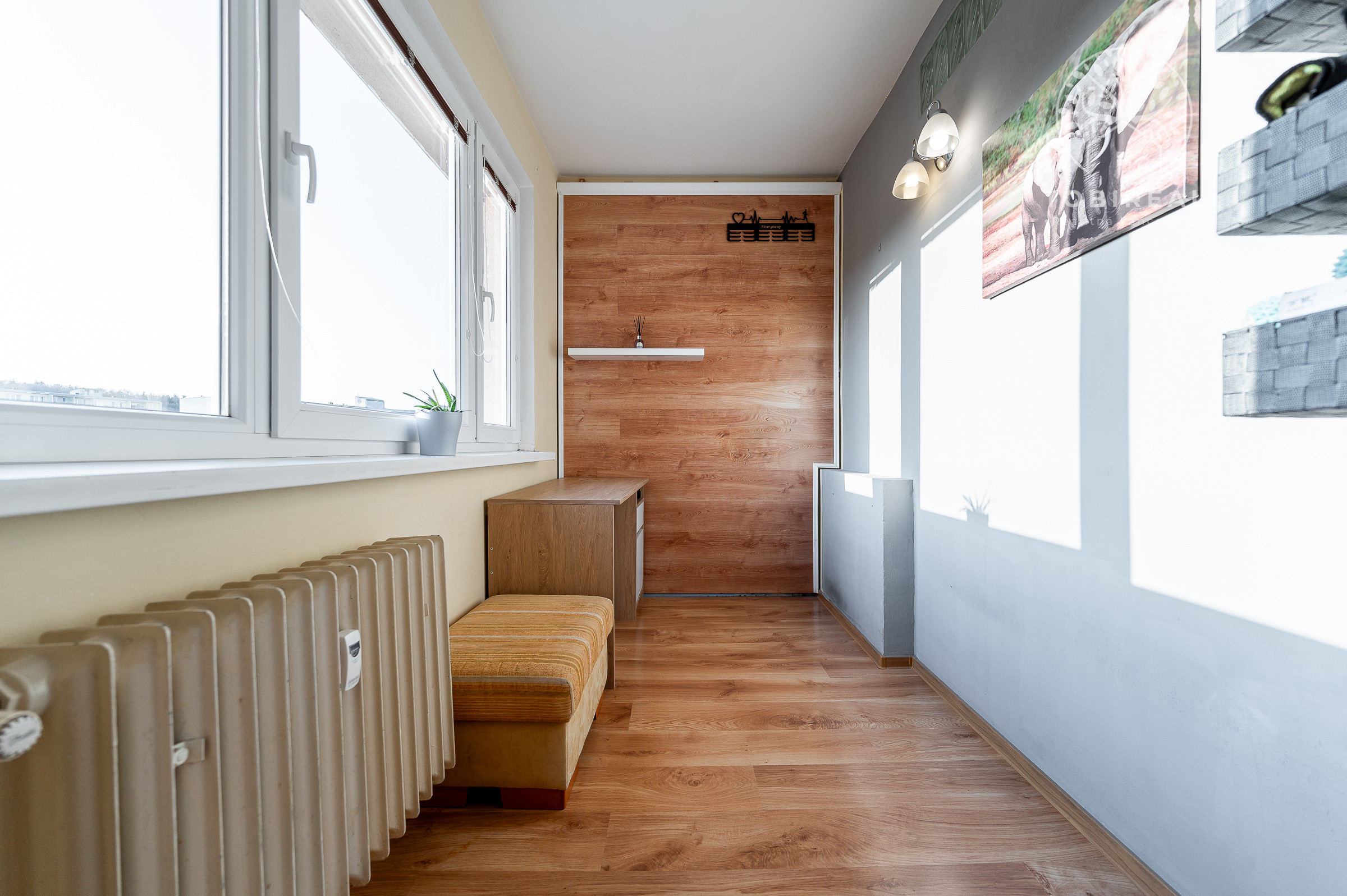 Dispozícia bytu pozostáva zo vstupnej chodby, obývacej izby s výstupom na balkón, kuchyne, spálne, detskej izby a ďalšej menšej samostatnej izby vhodnej napríklad ako pracovňa alebo šatník. Ďalej sa v byte nachádza kúpeľňa s vaňou a samostatná toaleta. Praktickou súčasťou bytu je aj špajza.