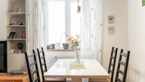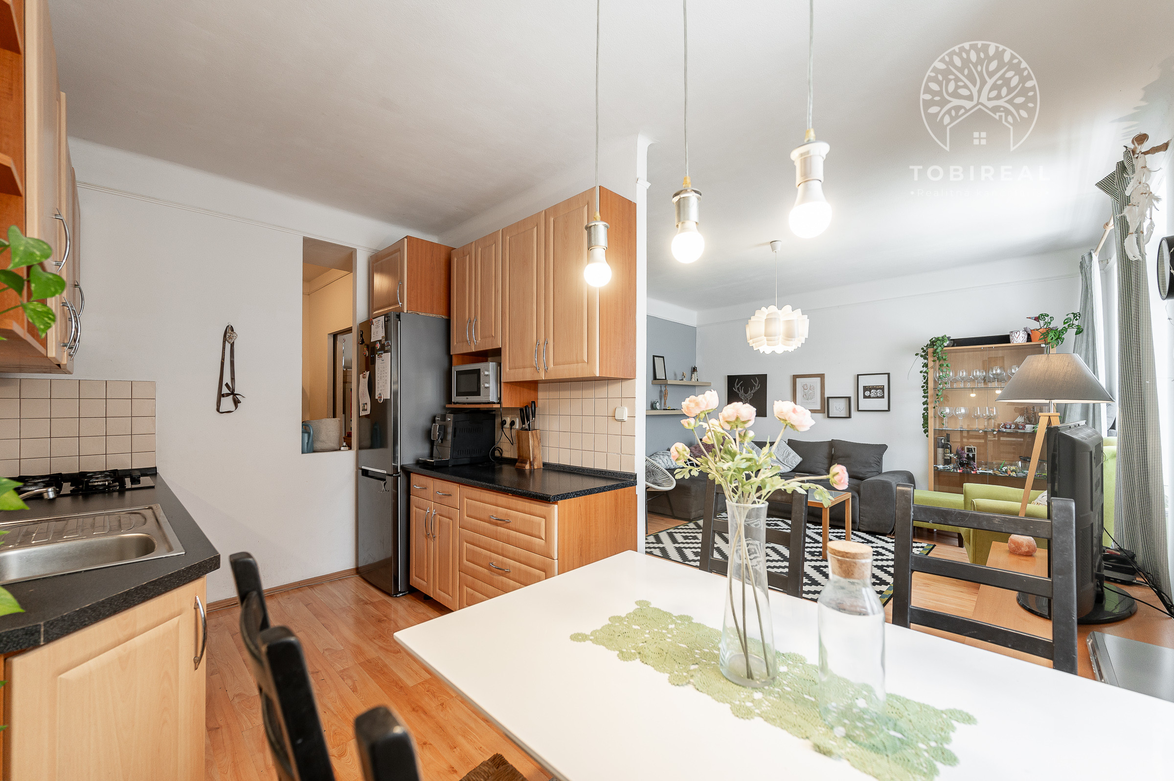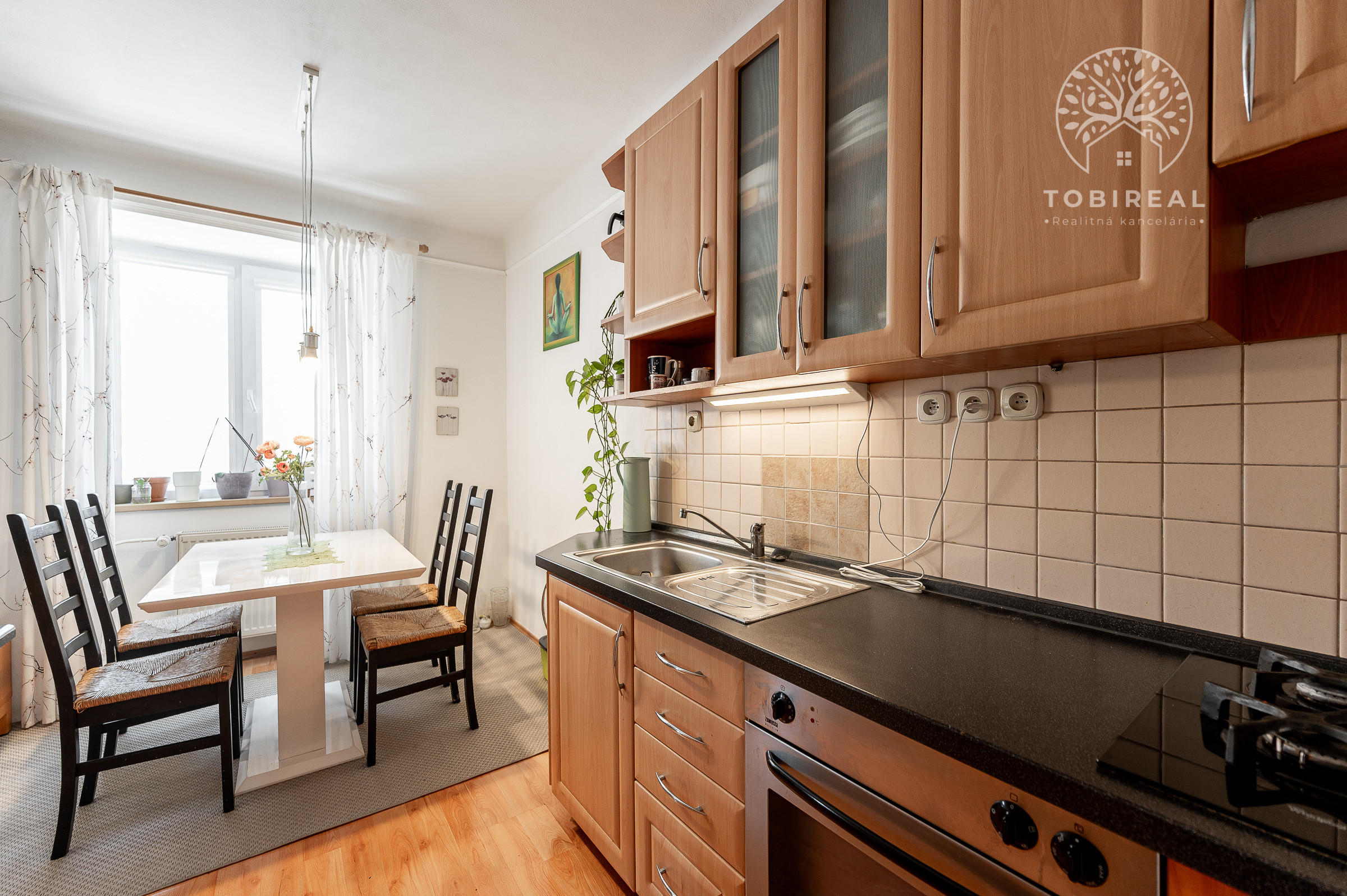 Kuchyňa je plne vybavená modernými spotrebičmi, k dispozícii je varná doska so sporákom, elektrická rúra, chladnička s mrazničkou a digestor. Praktický jedálenský kút so stolom a stoličkami vytvára útulné miesto pre spoločné raňajky či večere.