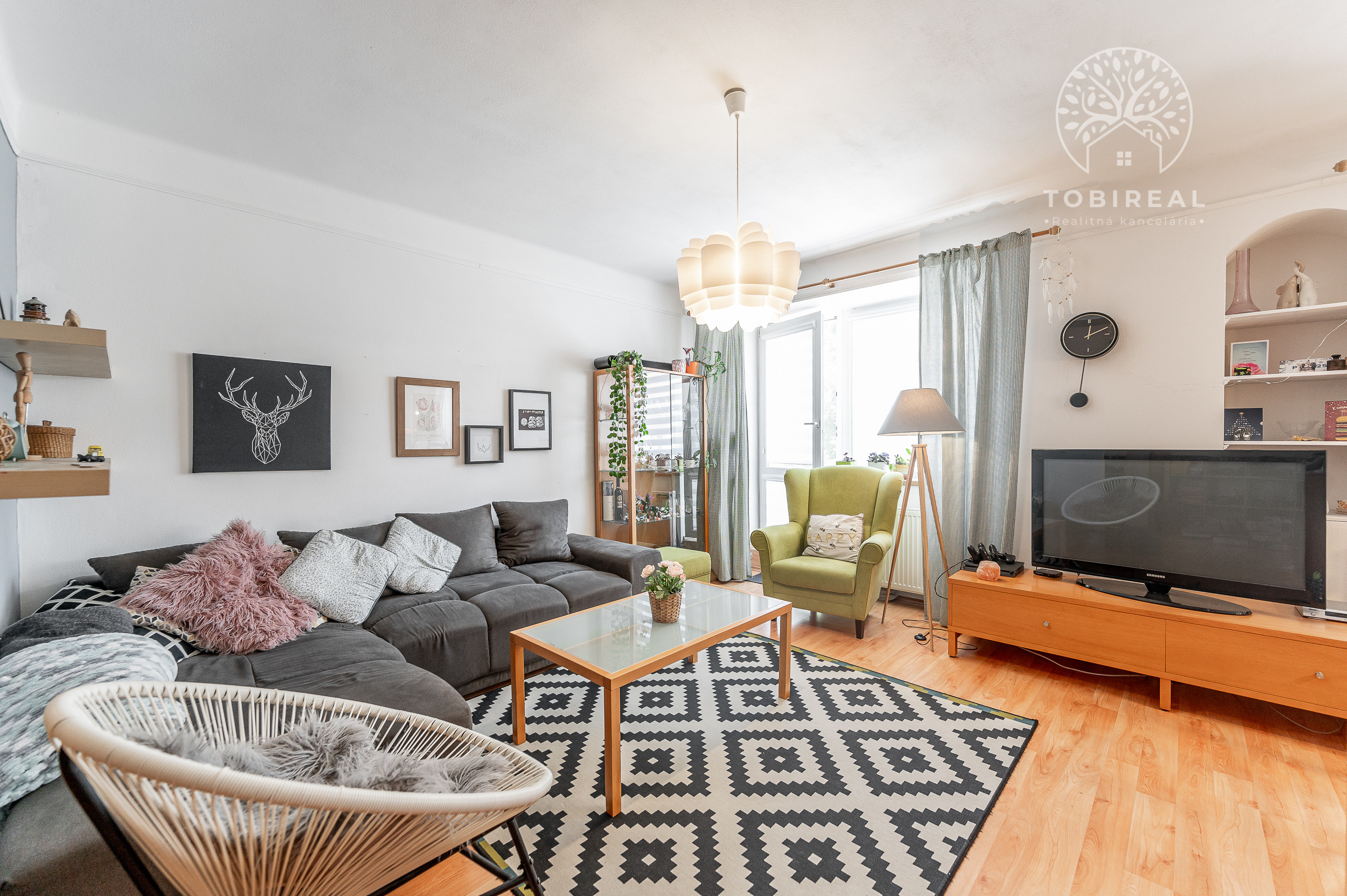 Obývacia izba s pohodlným gaučom a stolík s televízorom vytvára ideálne prostredie na relax, sledovanie filmov alebo stretnutia s priateľmi.