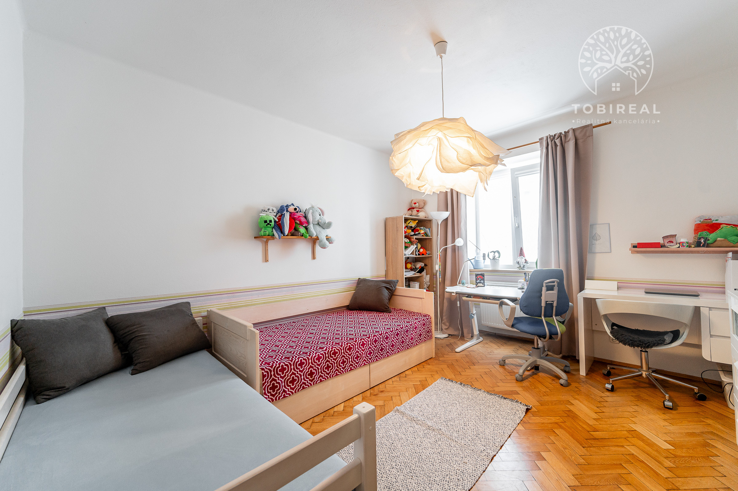 V spálni s posteľou je aj praktický pracovný stôl vhodný na prácu z domu či štúdium. Ďalší úložný priestor, ktorý pomáha udržať poriadok a organizáciu v byte, poskytujú vstavané skrine situované na chodbe.