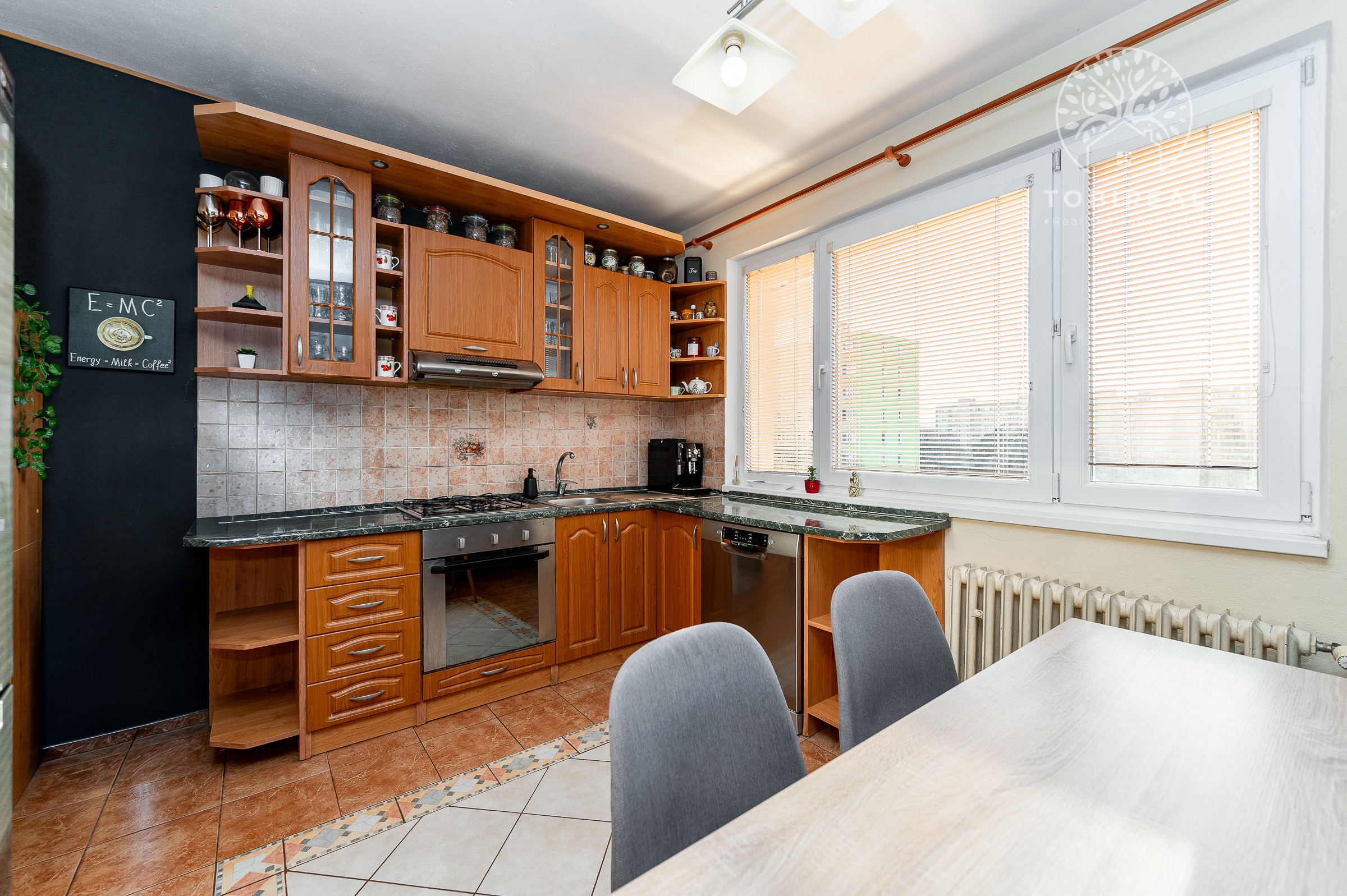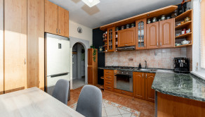 Kuchyňa je plne vybavená spotrebičmi: umývačka riadu, chladnička, mraznička, digestor, plynový sporák, elektrická rúra.