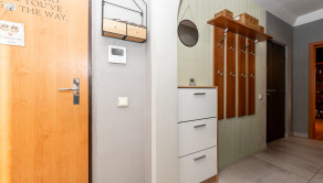 Dispozícia bytu pozostáva zo vstupnej chodby, obývacej izby s výstupom na loggiu, kuchyne, spálne, detskej izby a ďalšej menšej samostatnej izby vhodnej napríklad ako pracovňa alebo šatník. Ďalej sa v byte nachádza kúpeľňa s vaňou a samostatná toaleta. Praktickou súčasťou bytu je aj špajza.