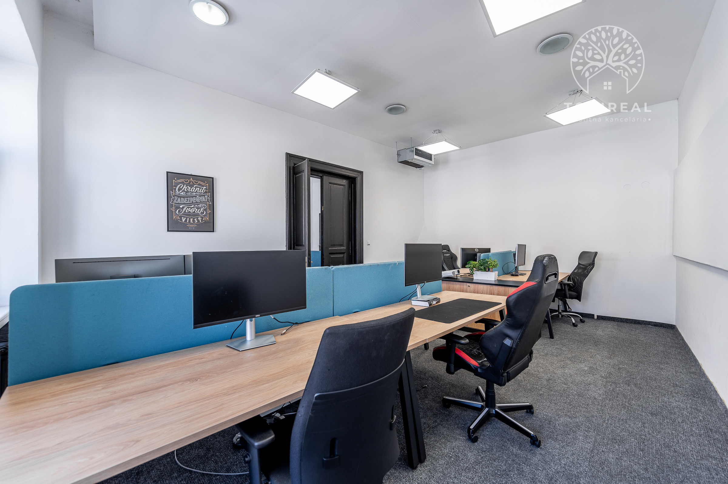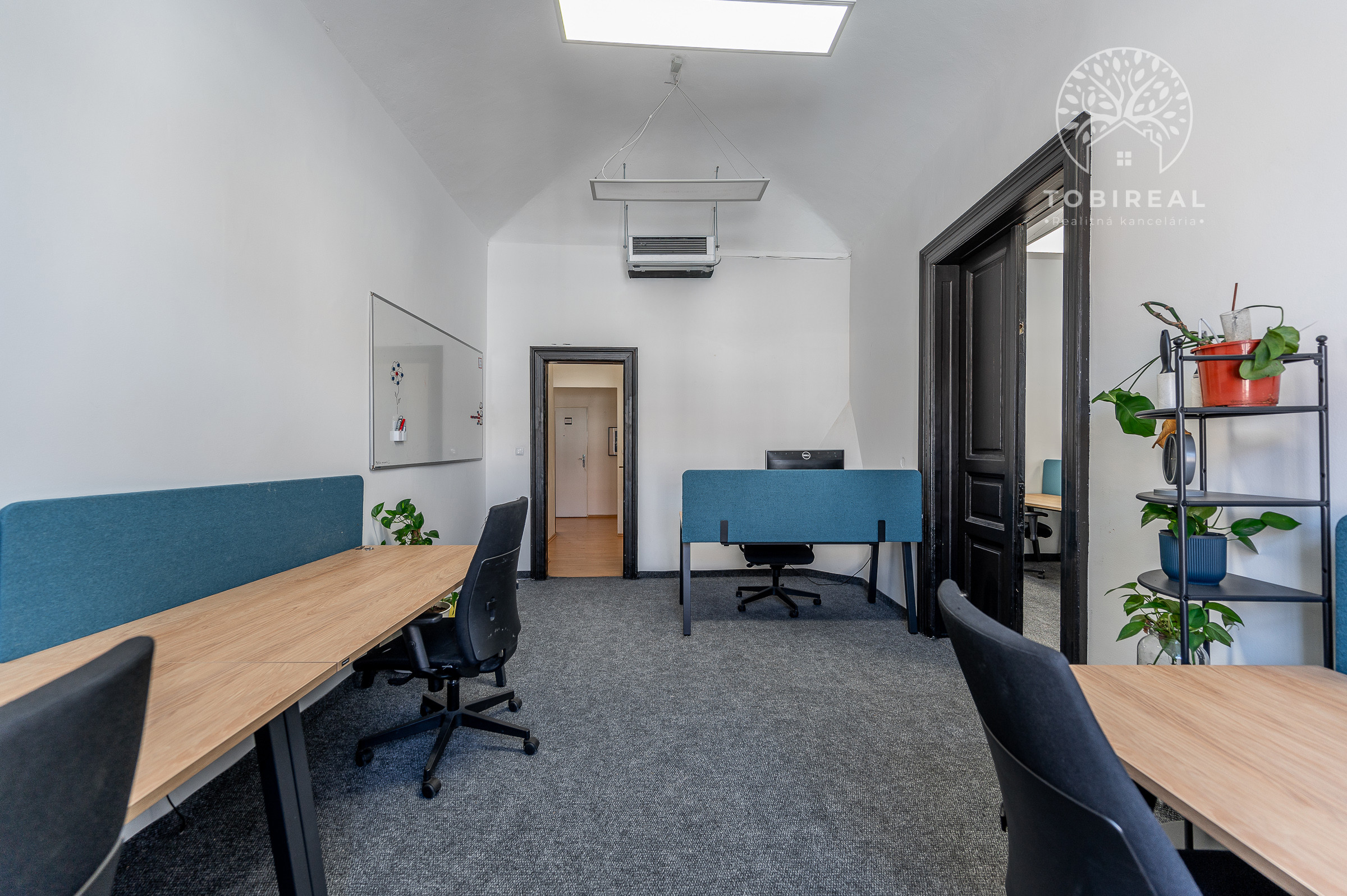 Dispozícia pozostáva z troch samostatných miestností, ktoré prešli čiastočnou obnovou – kombinujú praktickosť so zachovaním autentických prvkov. Vymenené drevené eurookná poskytujú výbornú izoláciu, zatiaľ čo jedno pôvodné okno dodáva interiéru osobitý šarm. Podlahy tvorí dlažba a záťažový koberec, ideálny na každodenné využitie. Príjemnú klímu zabezpečuje klimatizácia, vďaka ktorej sa vám bude pracovať pohodlne počas celého roka.