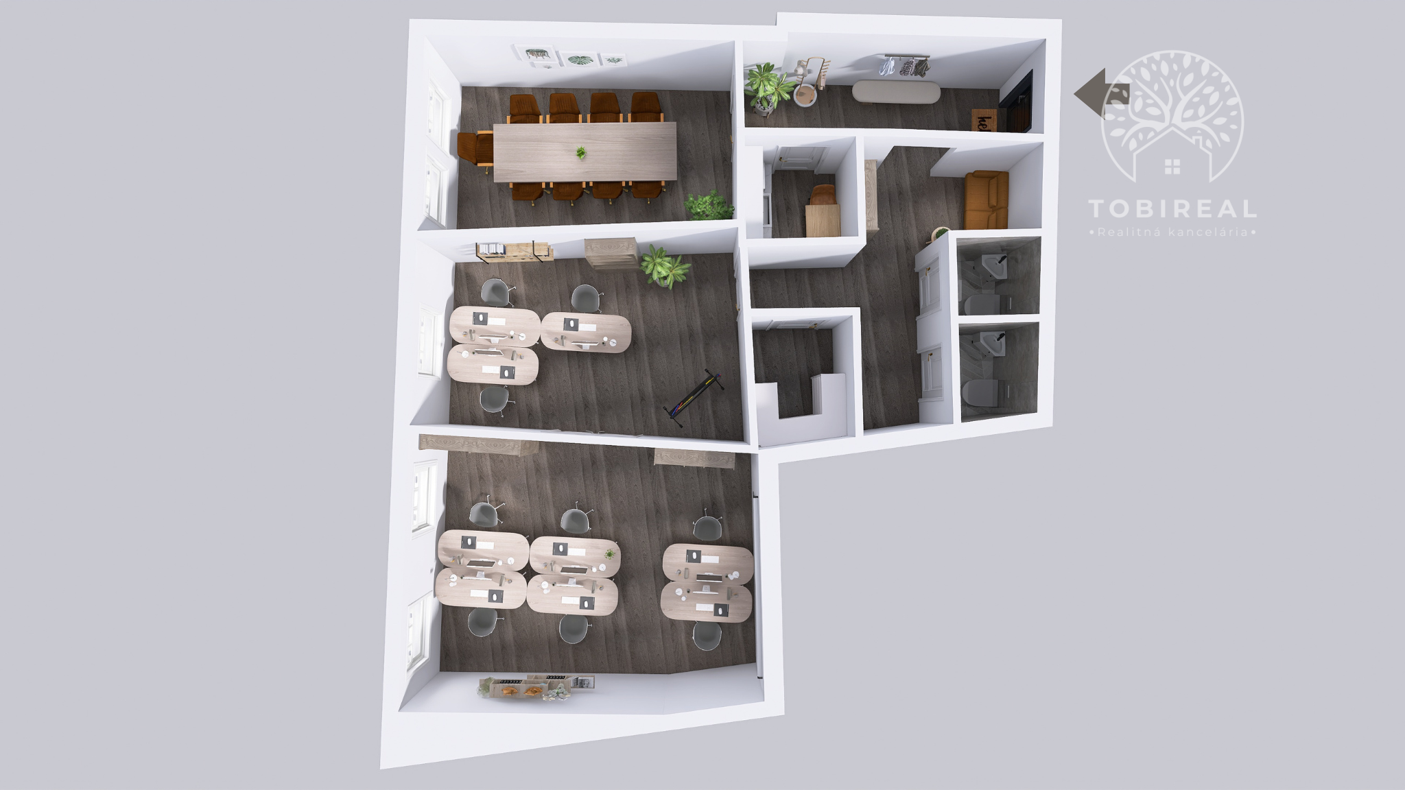 Praktickým benefitom je vlastné hygienické zázemie – dve toalety a sprchovací kút priamo v priestore.