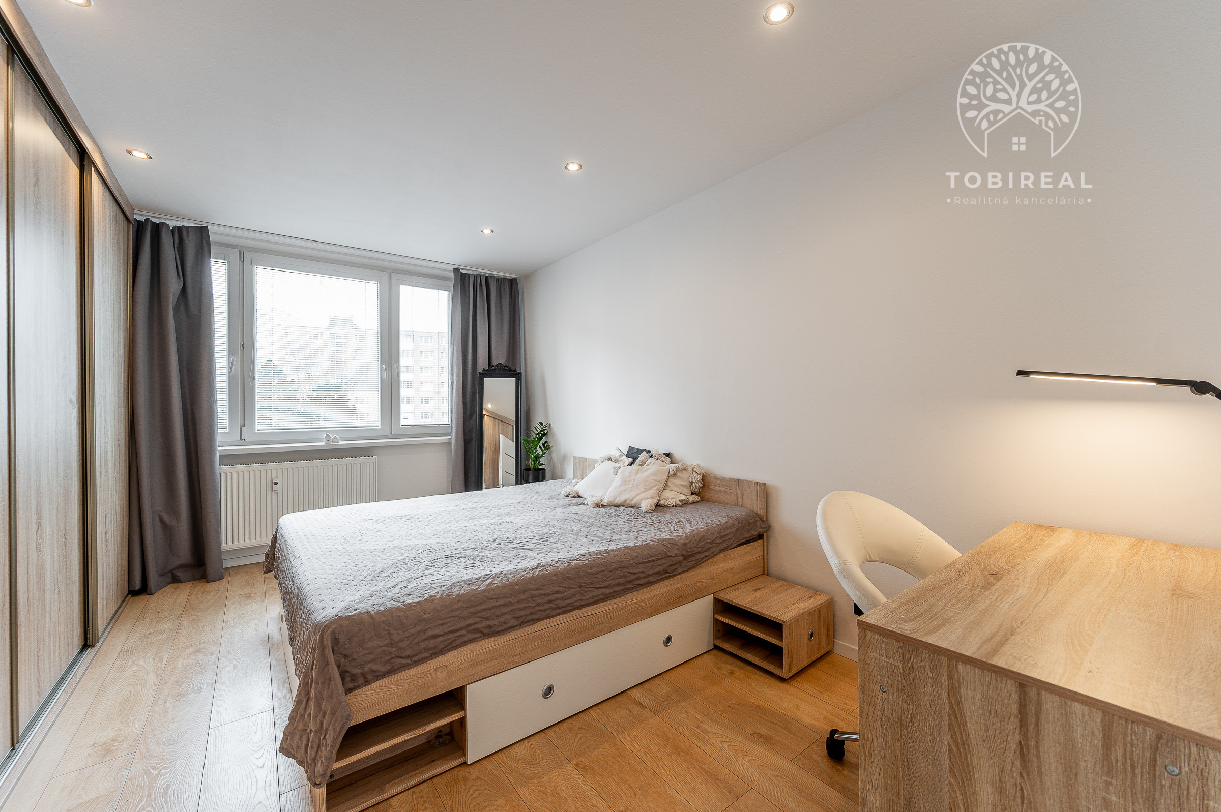 Dispozíciu bytu tvorí vstupná chodba, obývacia izba s výstupom na loggiu, kuchyňa, spálňa, kúpelňa s vaňou a samostatná toaleta. Kuchyňa je plne vybavená spotrebičmi a v spálni a na chodbe sa nachádzajú vstavané skrine, ktoré poskytujú dostatok úložného priestoru.