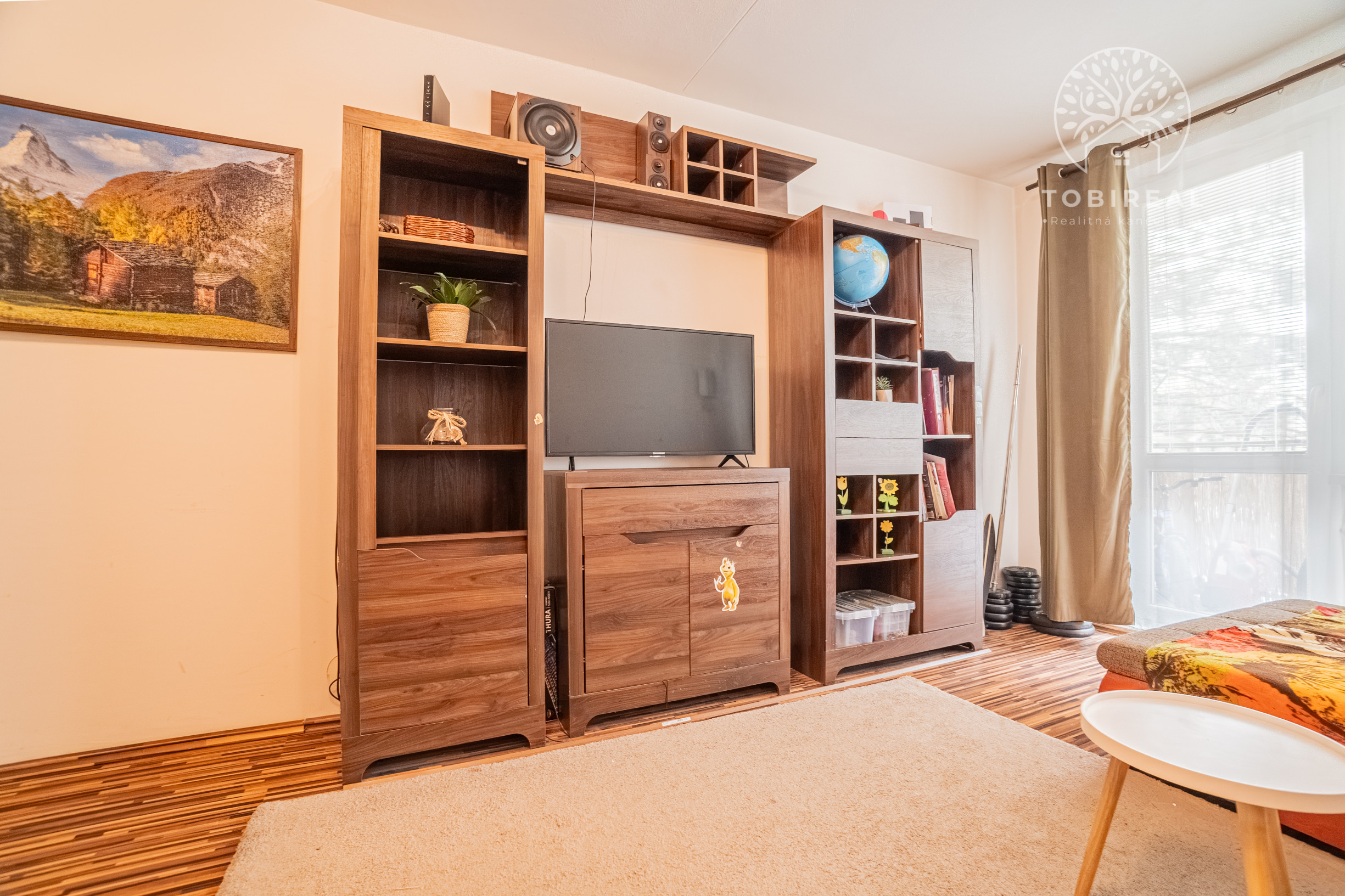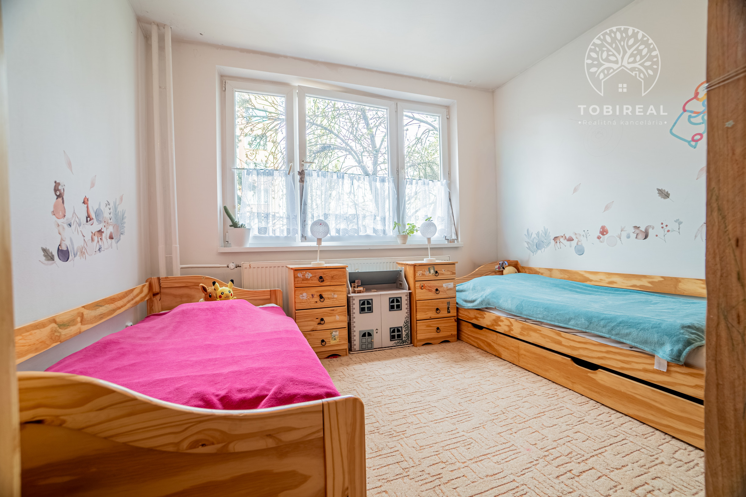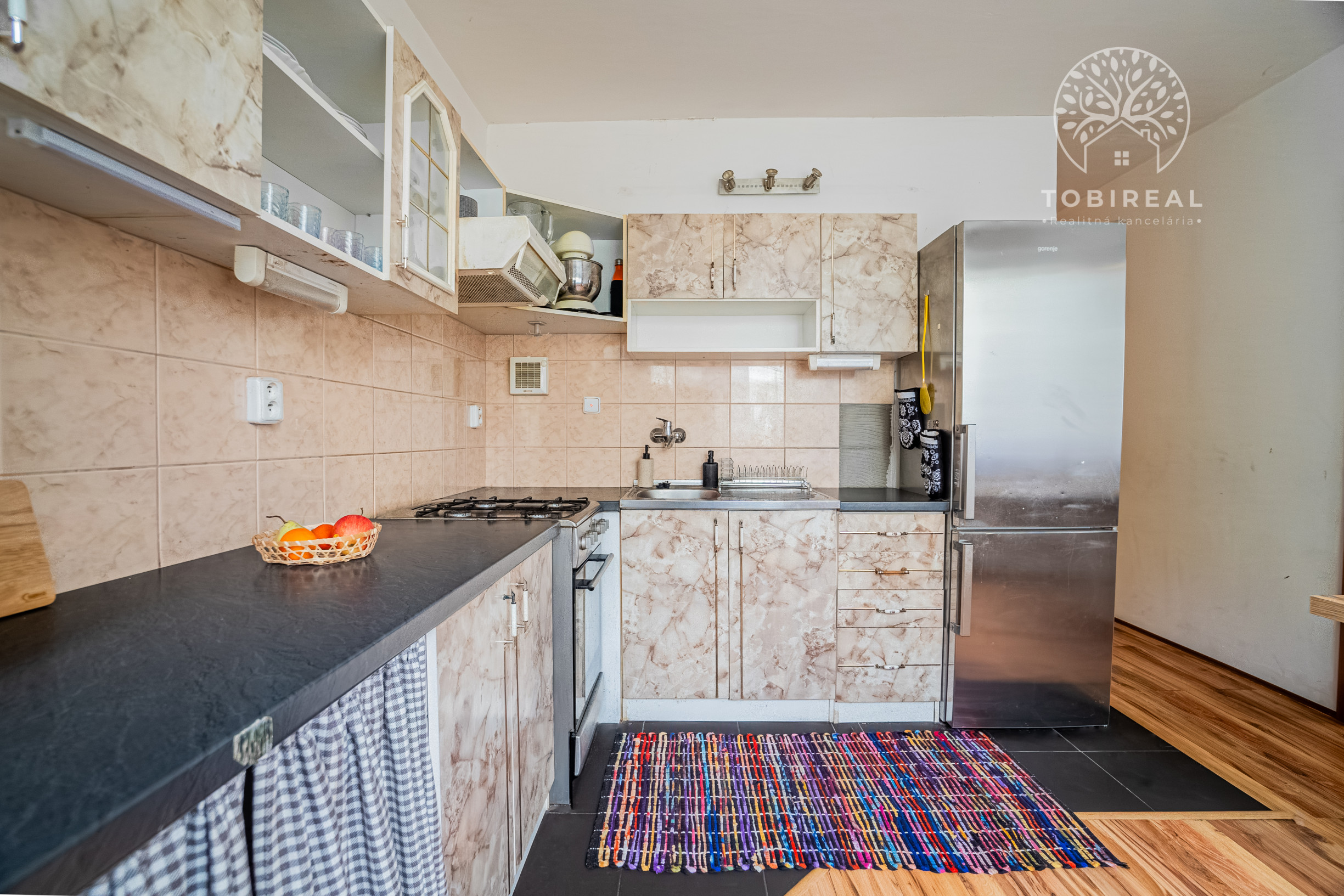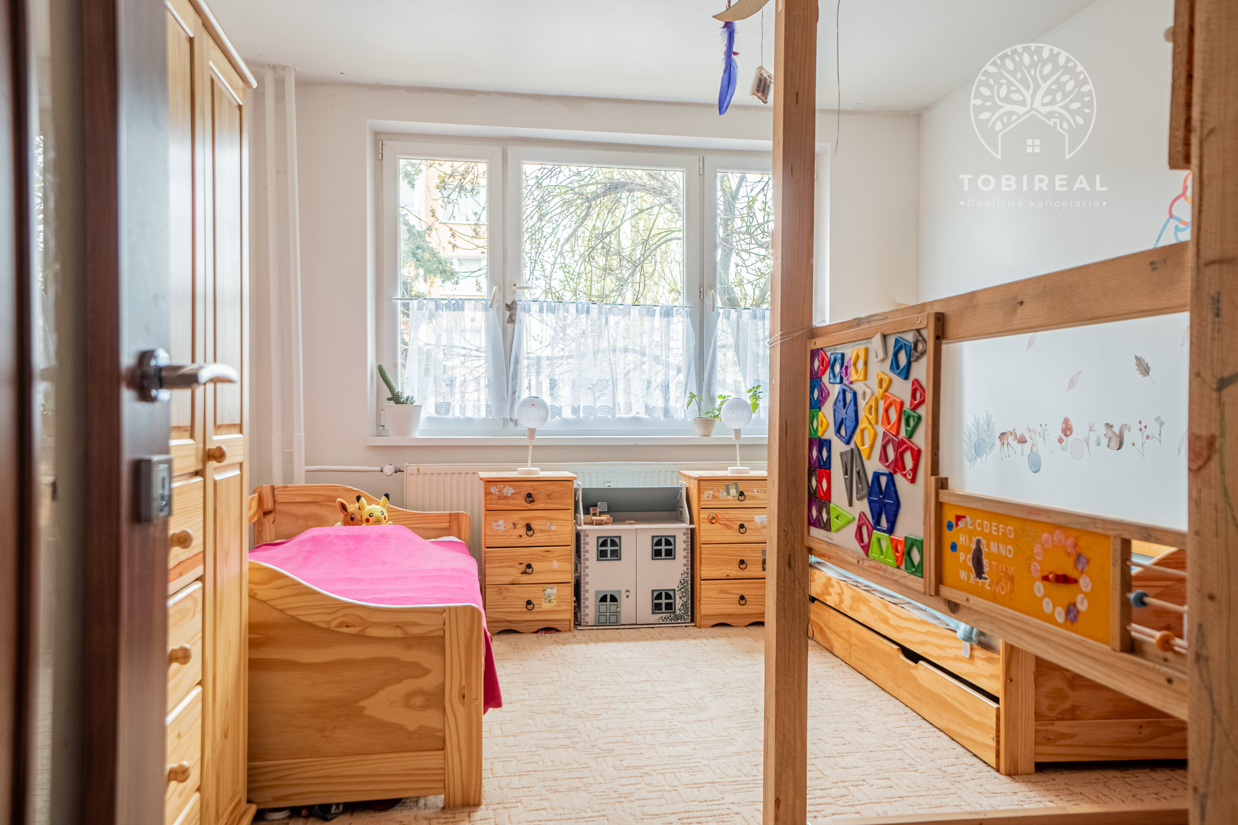 Byt sa nachádza na 1. poschodí bytového domu s výťahom. Celková rozloha bytu je 80 m² a k bytu prislúcha aj pivnica a dve loggie. Nehnuteľnosť prešla staršou rekonštrukciou a predáva sa čiastočne zariadený. Dispozícia bytu pozostáva zo vstupnej chodby, obývacej izby, kuchyne, spálne, detskej izby, kúpeľne s vaňou a samostatnej toalety. Kuchyňa je plne vybavená spotrebičmi: chladnička, mraznička, digestor, sporák a elektrická rúra.